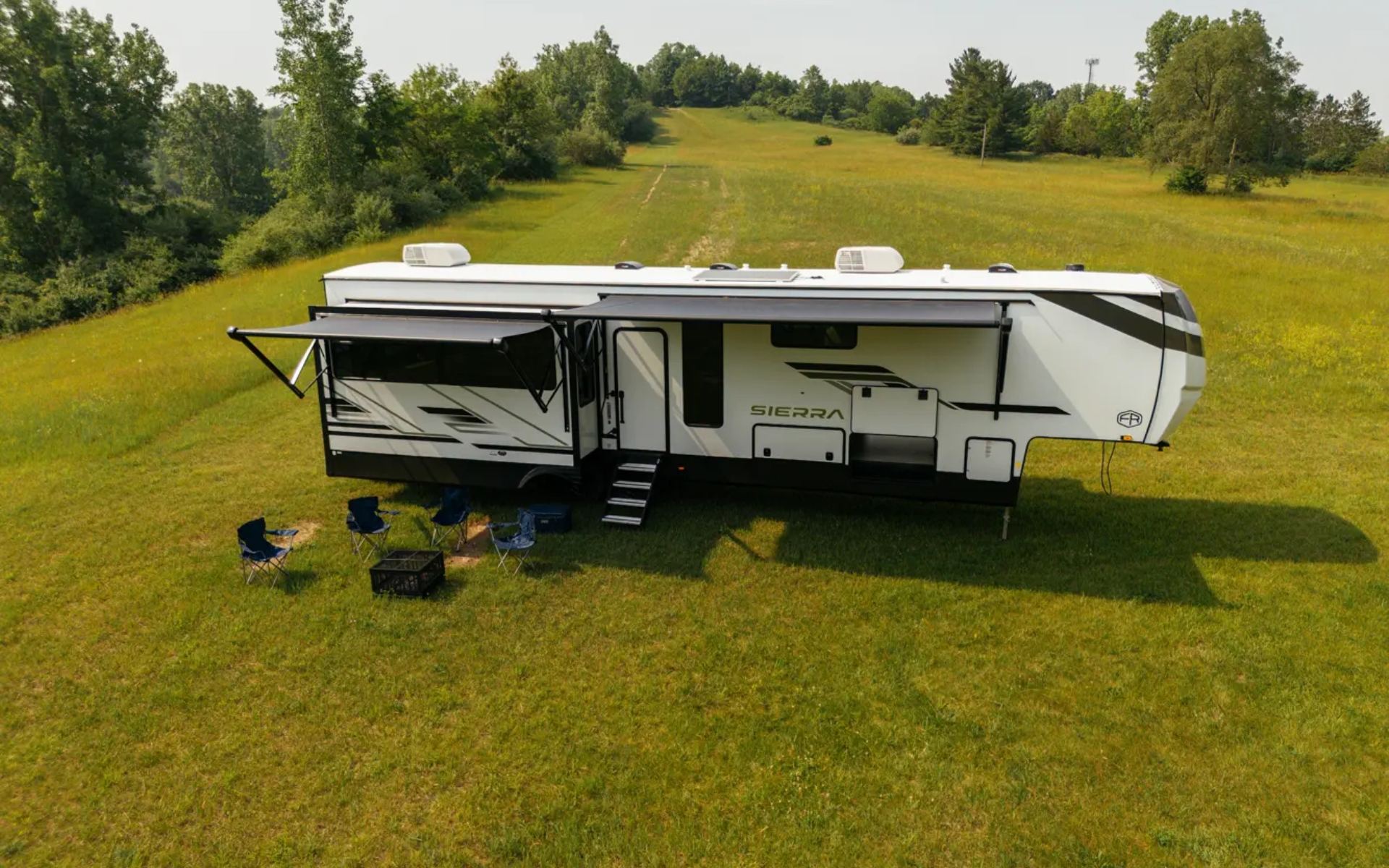 Outside, the Sierra offers two awnings that give you shade and shelter. There’s also an outside kitchen for easy meals without missing the fresh air. The pass-through storage is big enough for chairs, fishing gear, and anything else you might want to bring. Even the steps feel solid and easy to use.