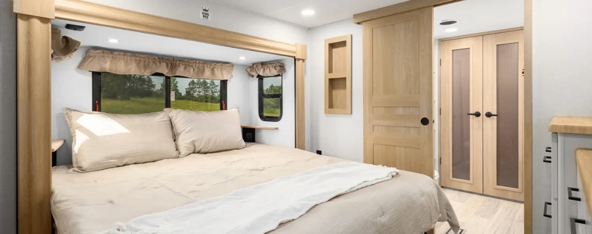 The master bedroom inside the Sierra 4002FB feels like a real bedroom. There’s a king bed that feels soft and wide, a wardrobe with sliding doors, and even washer and dryer prep for longer trips. The room feels quiet and warm. When the day is done, it’s a good place to rest and just breathe.