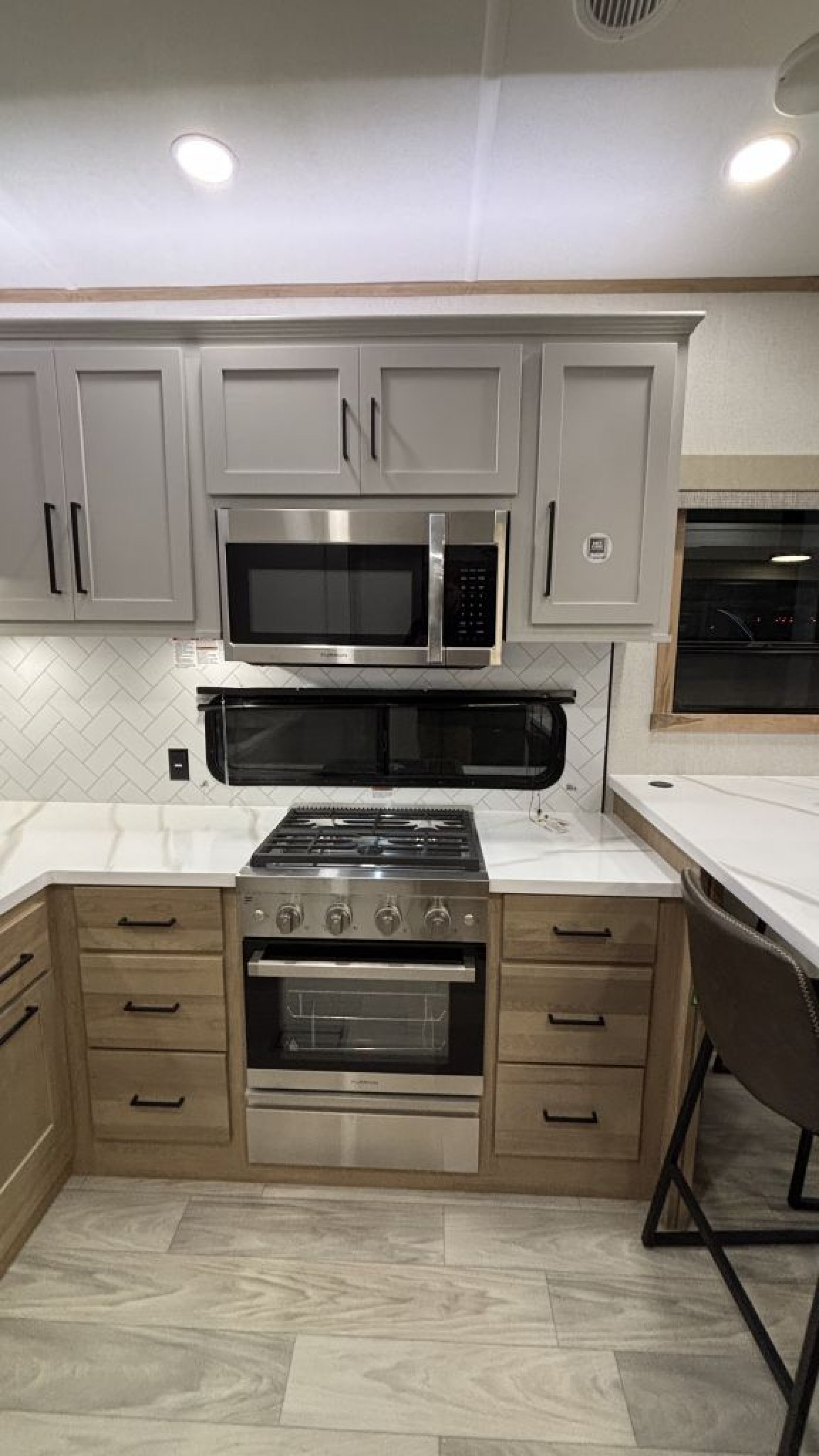 Luxury Meets FunctionalityAt 44’1” in length, the Sierra 3800RK boasts an expansive layout with a rear chef’s kitchen that rivals upscale homes. Prepare meals with ease on the stainless steel range with cast iron grates, framed by solid surface countertops, a designer backsplash, and a 30" over-the-range microwave. A 16 cu. ft. 12V stainless refrigerator keeps your ingredients fresh while a commercial-style kitchen faucet and apron front stainless sink with strainer add both form and function. Bonus: a countertop extension gives you even more prep space.