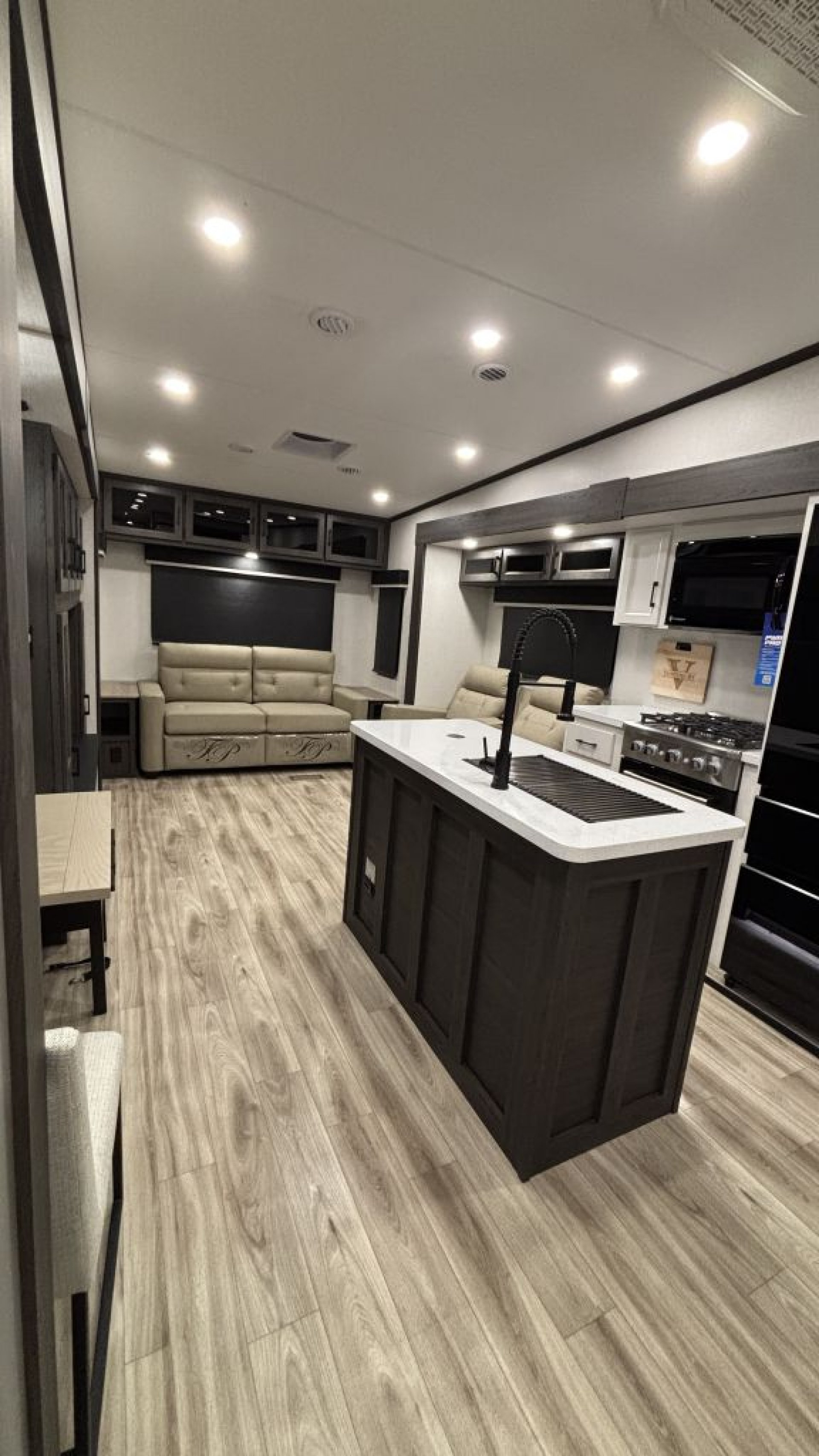 - Kitchen: 18 cu. ft. 12V residential refrigerator, 3-burner cooktop with oven, convection microwave, solid-surface counters, farmhouse sink, and pull-out pantry.