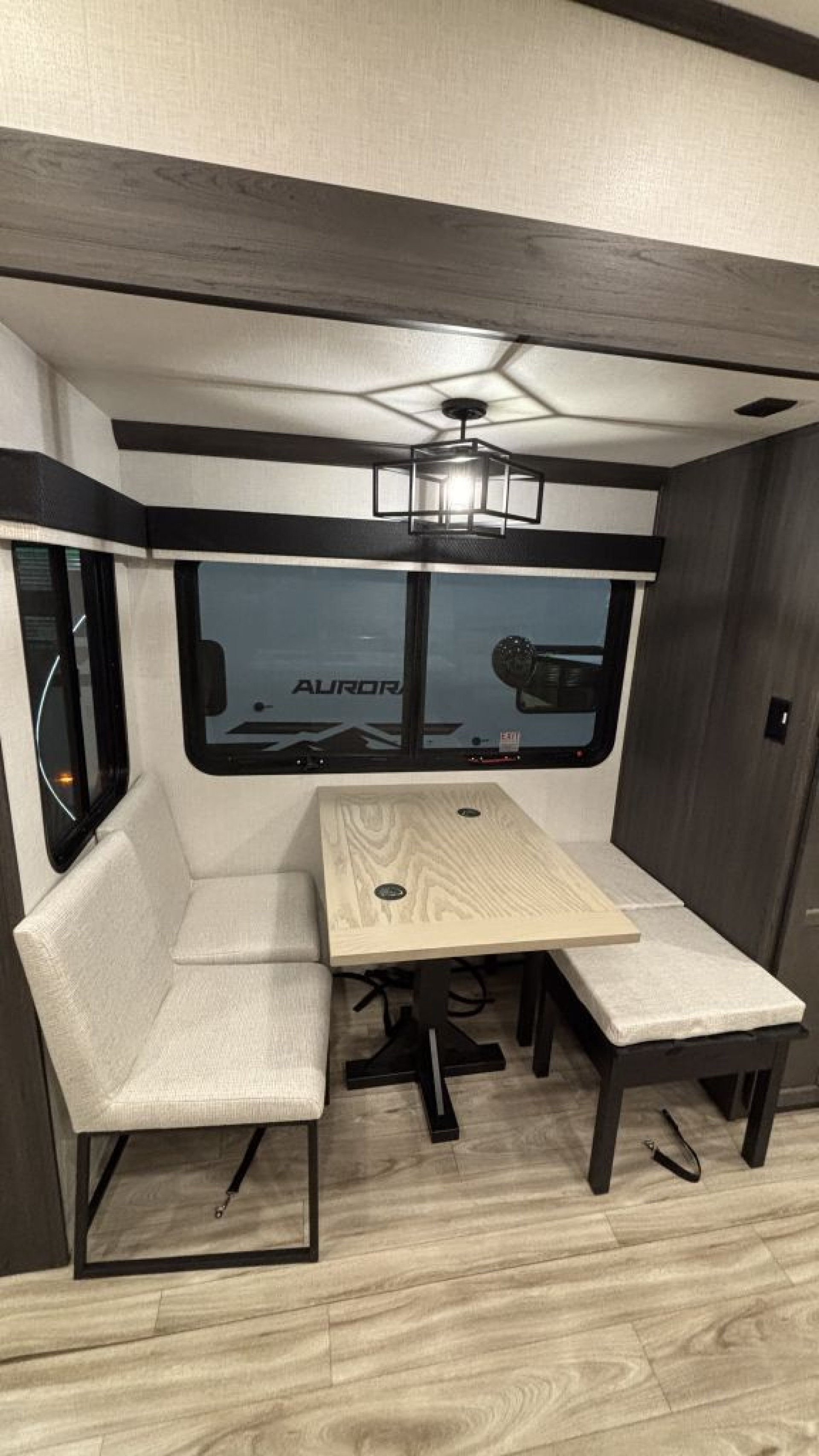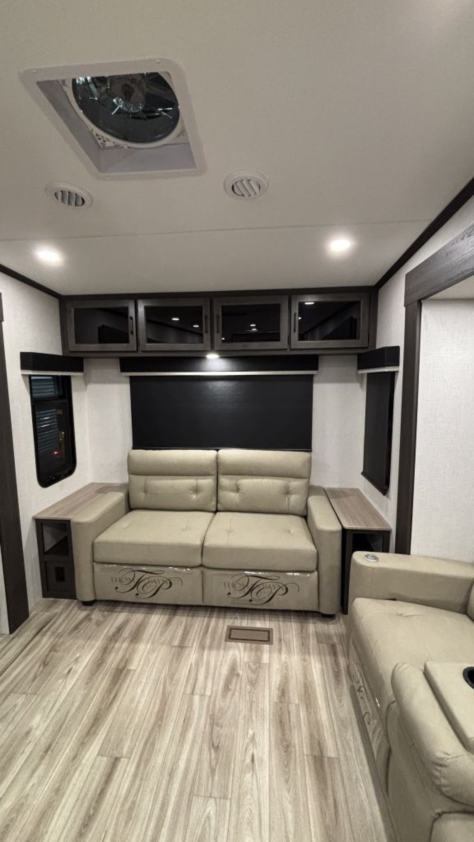 - Living Area: Rear great room with opposing slide-outs featuring theater seating for four, a tri-fold sofa (converts to bed for two), and dual electric fireplaces; panoramic windows for views.
