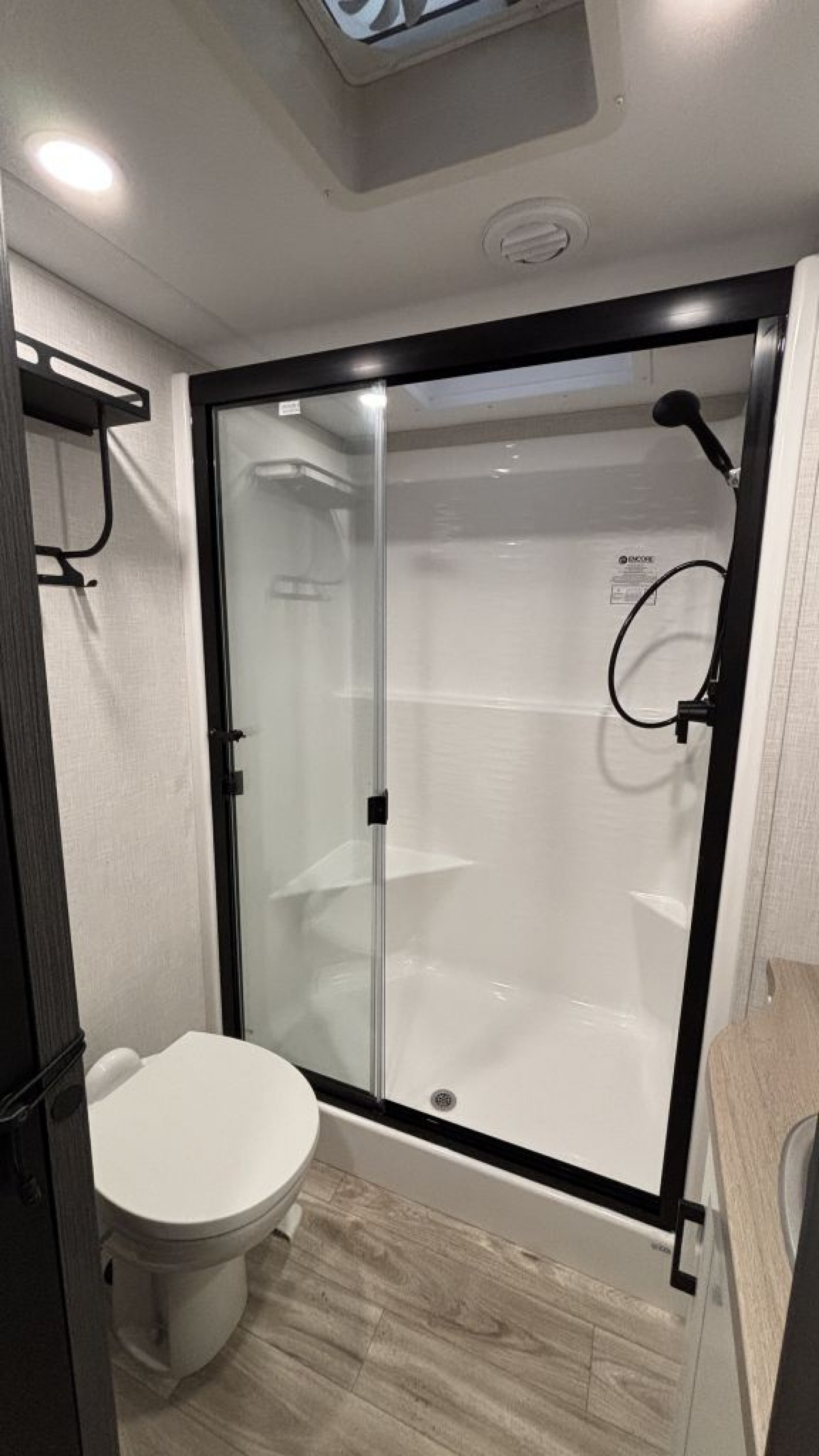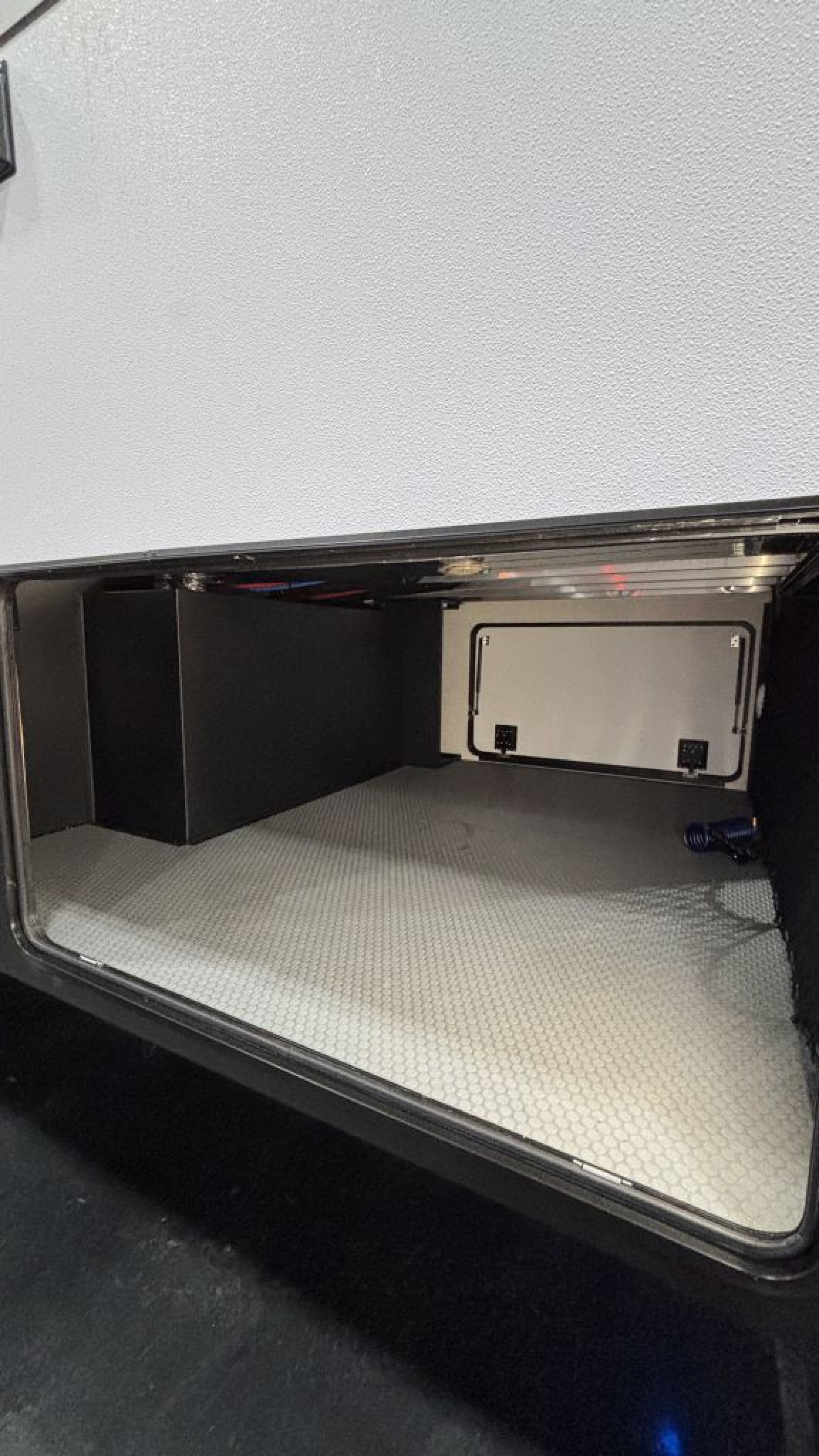 - Convenience: Hot/cold outside shower, magnetic flush baggage doors, front diamond plate rock guard, 6-point auto leveling, and motion-activated entry lights.