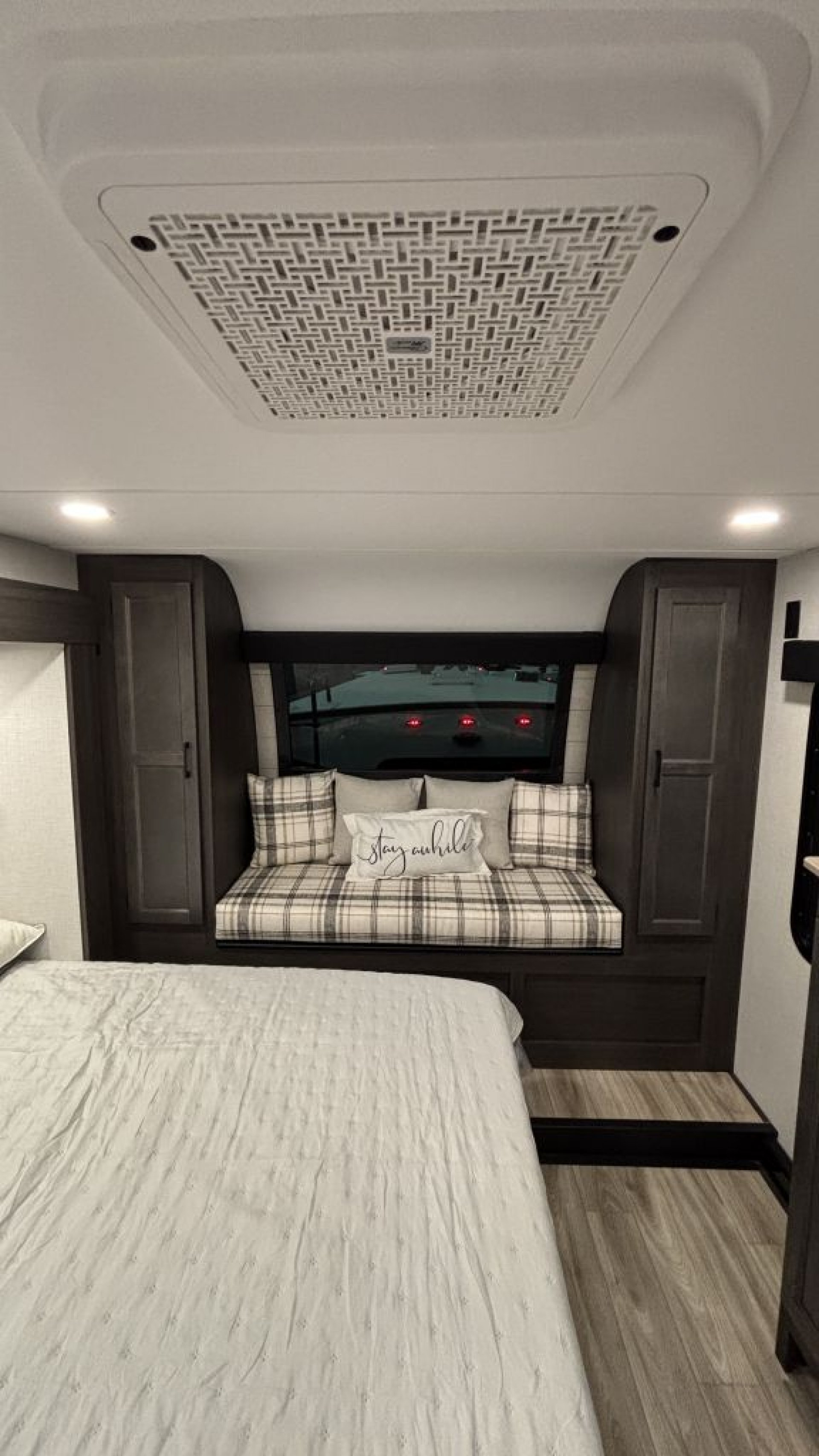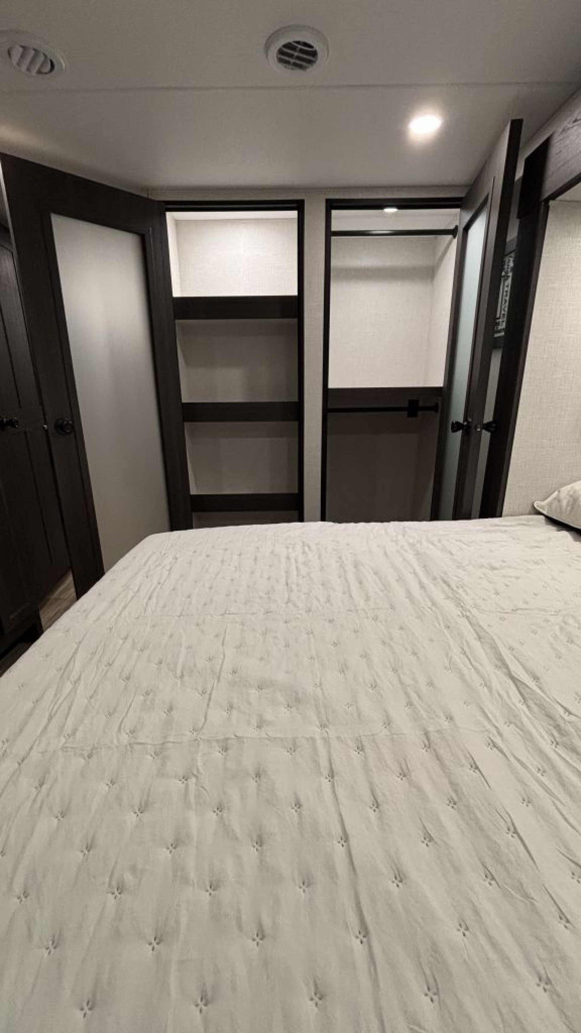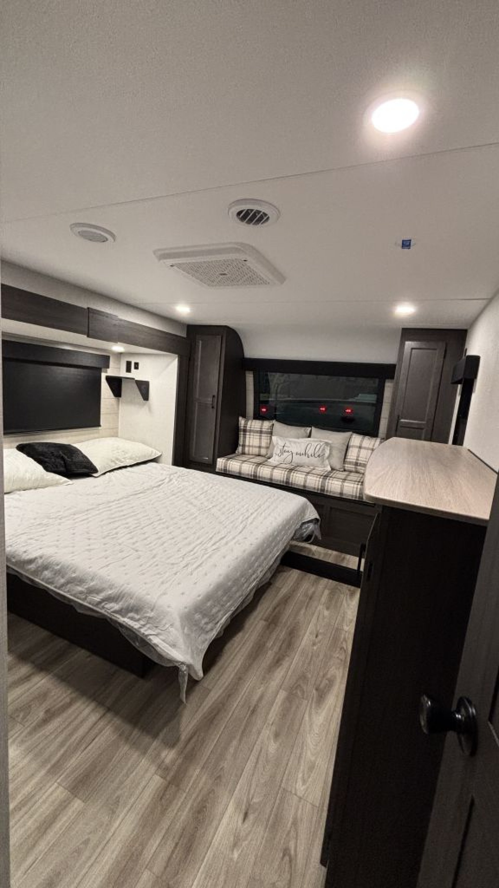 - Front Bedroom: Private king suite (72" x 80") with dual wardrobes, overhead cabinets, washer/dryer prep, and an en-suite half-bath for ultimate seclusion.