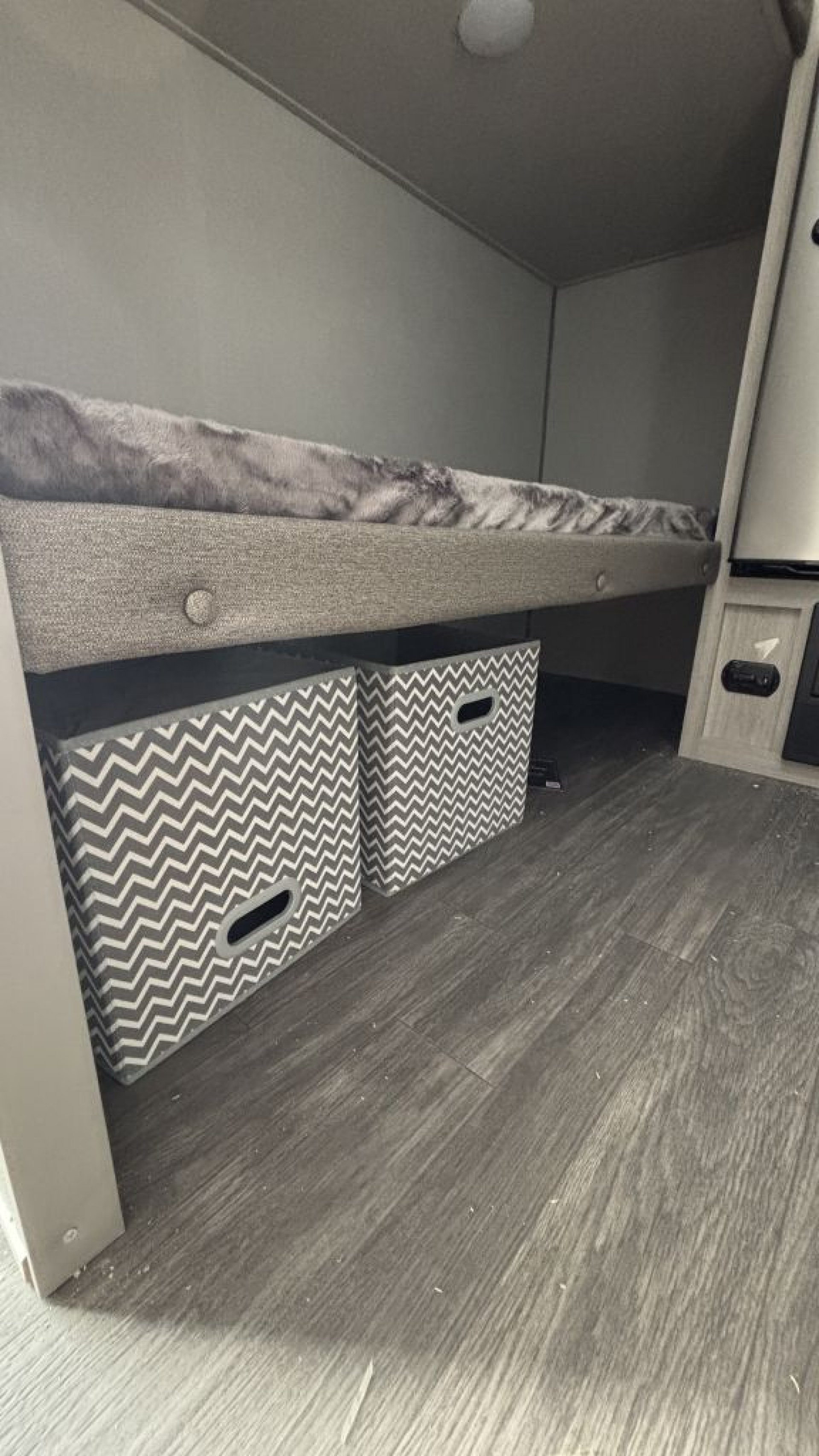 Despite its compact size, the Aurora 13BHX includes a fully enclosed rear corner bathroom complete with shower, toilet, and vanity sink. This self-contained setup allows campers to enjoy off-grid or provincial park camping without relying on shared facilities.