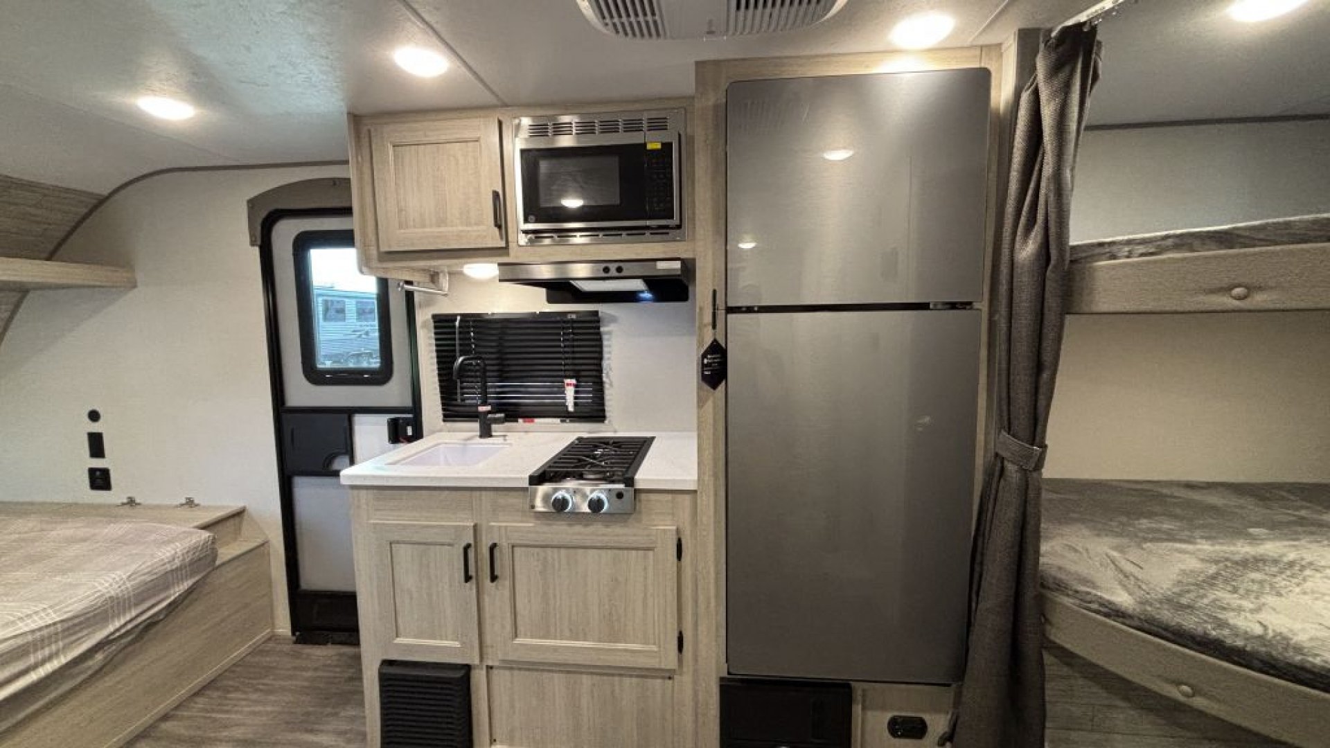 Full GE Kitchen Suite: Equipped with a 10.7 cu. ft. 12V refrigerator, stainless microwave, and a 2-burner gas range.