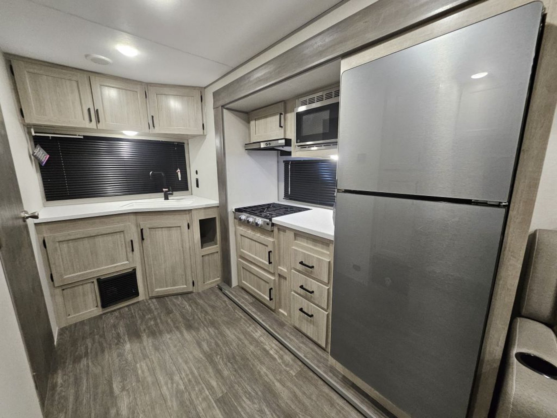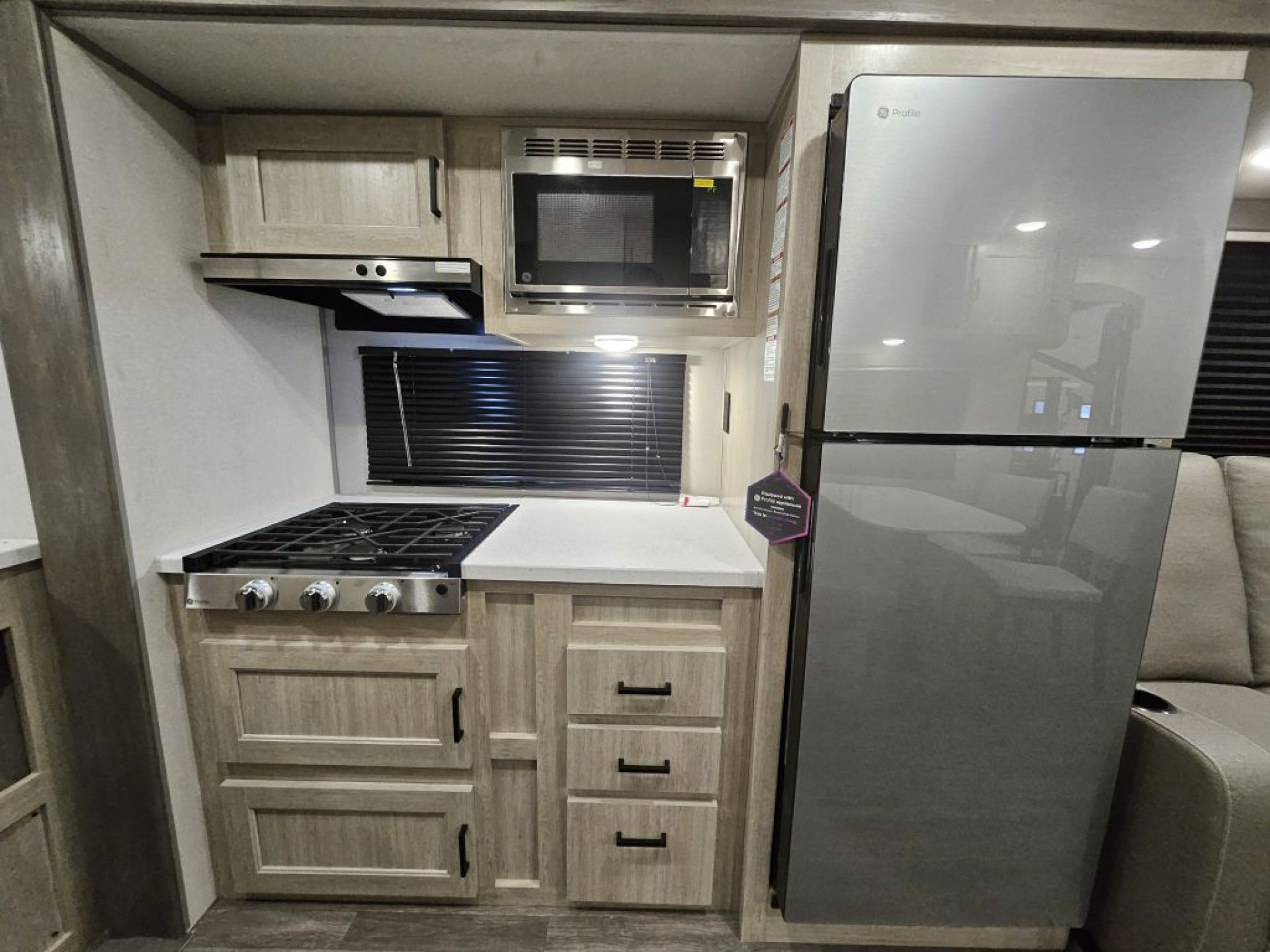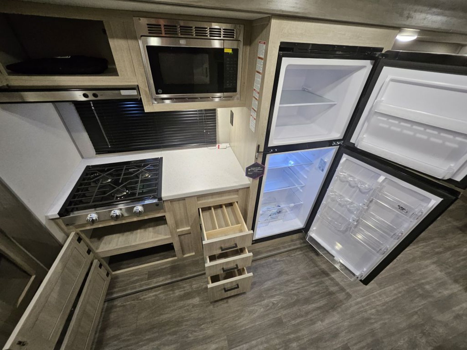 - Kitchen: Equipped with a 3-burner cooktop, stainless steel sink, 10.7 cu. ft. 12V refrigerator, microwave, and flip-up counter extension.