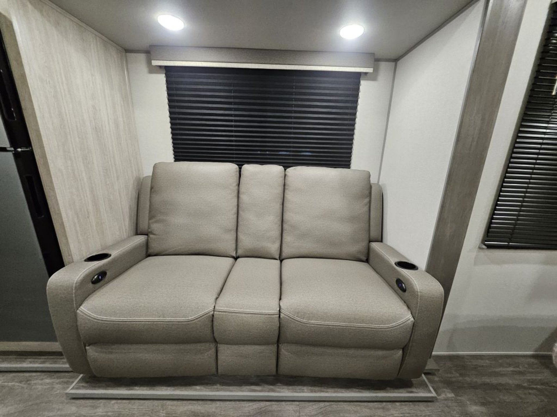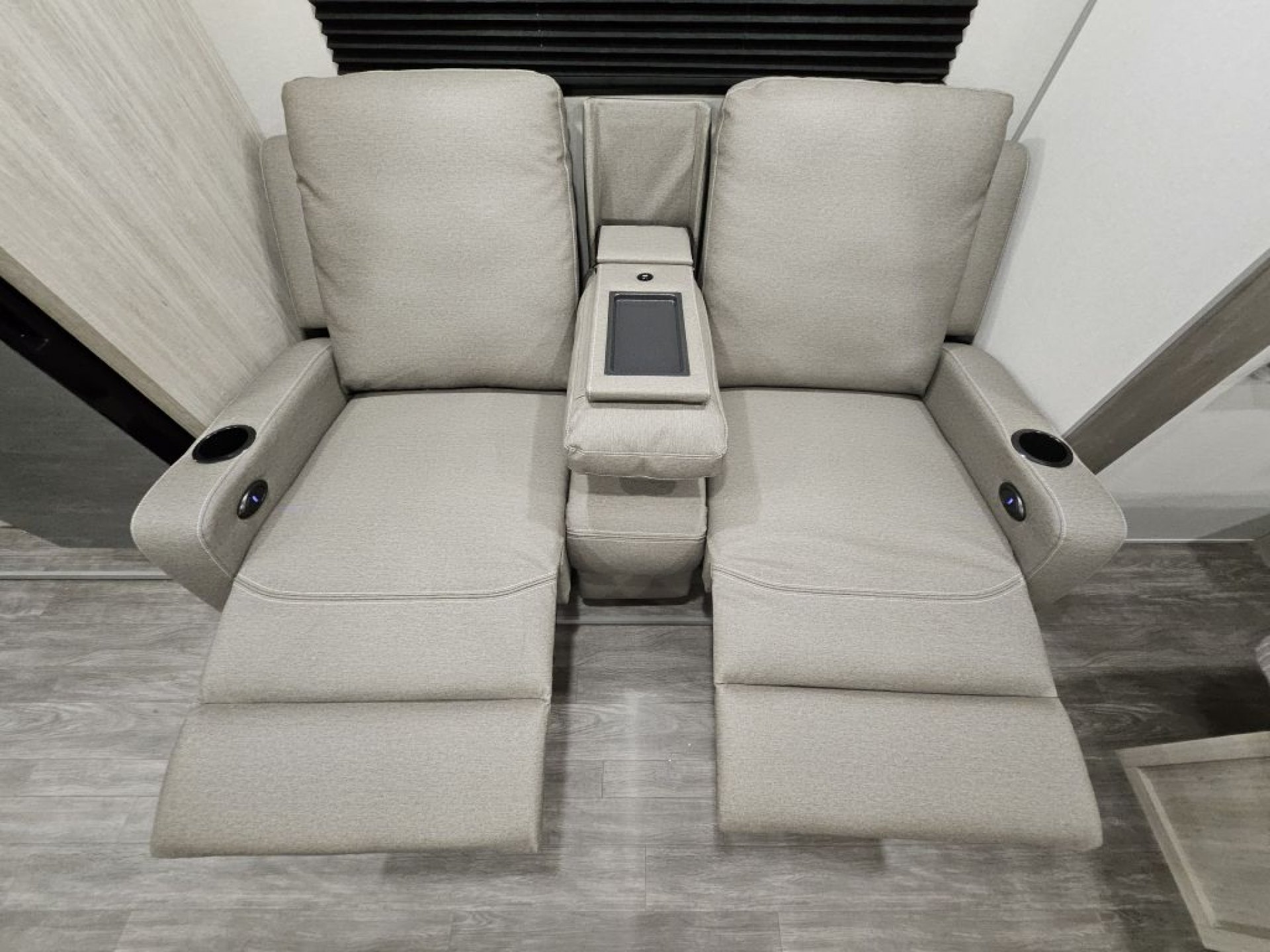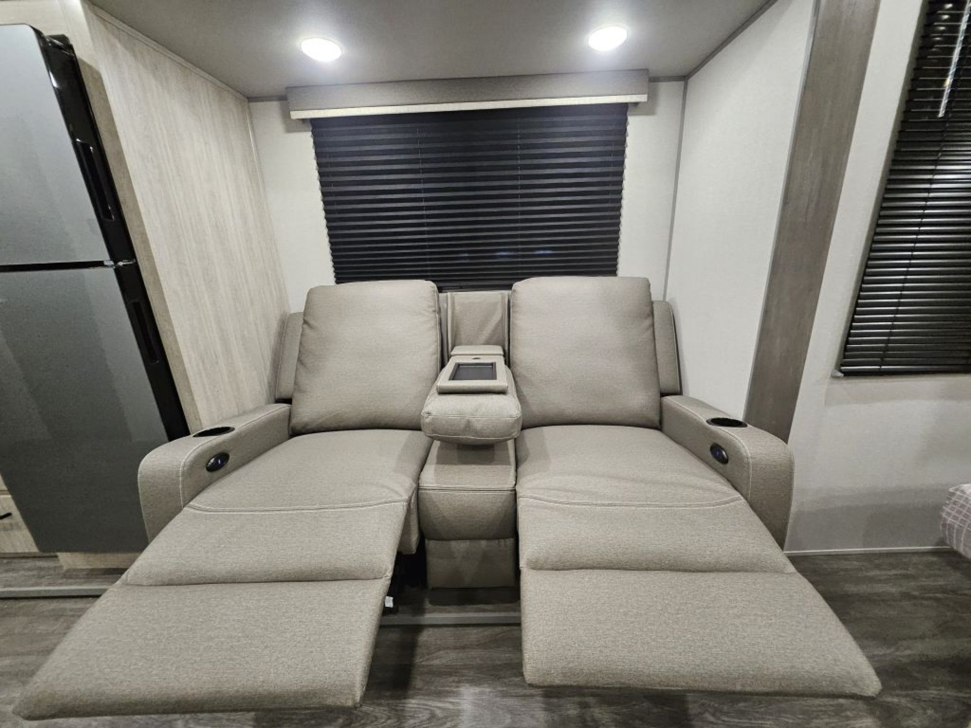 - Living Area: Slide-out features 68" theater seating opposite a entertainment center, creating a cozy lounge space.
