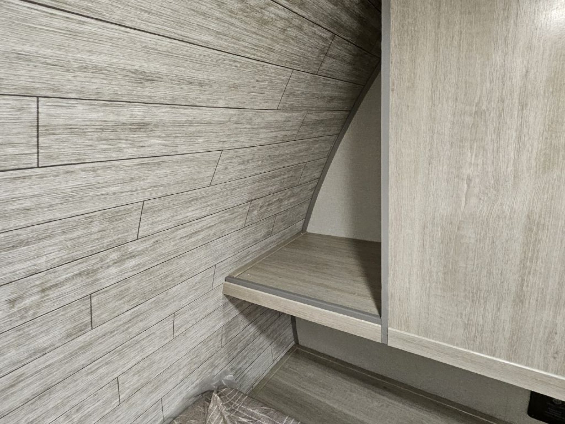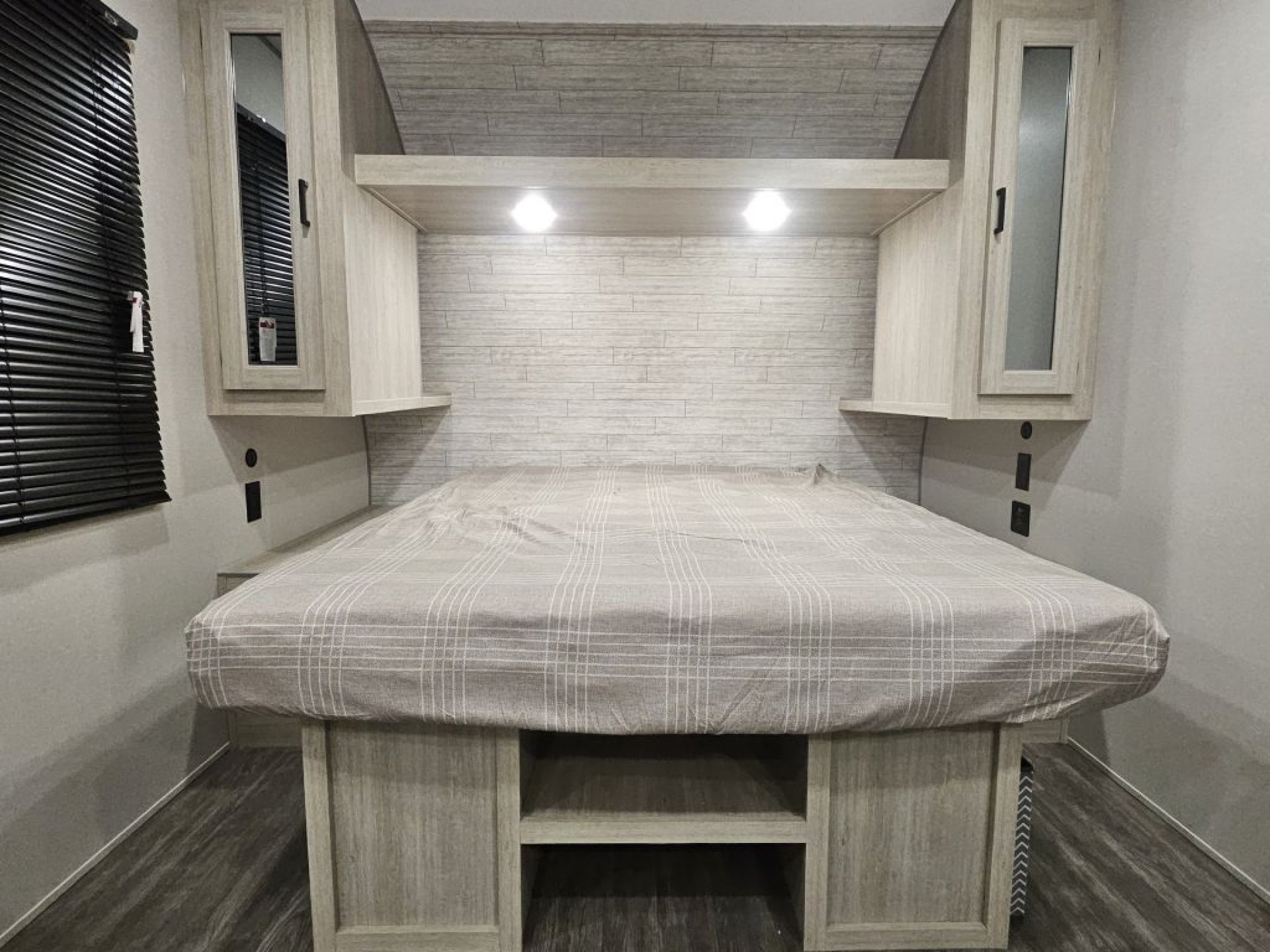 - Front Bedroom: Queen bed (60" x 80") with wardrobes and overhead cabinets on both sides for ample storage.