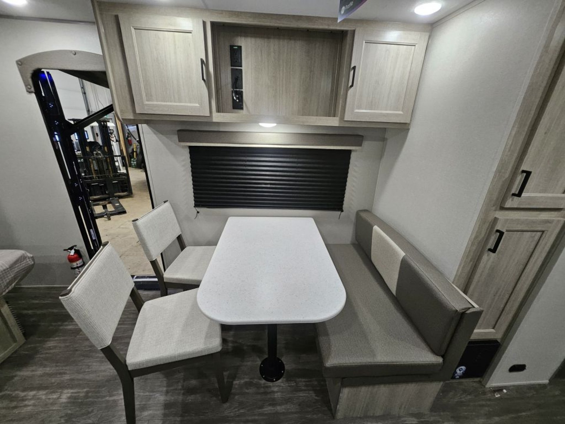- Living Space: LED lighting, blackout shades, and a booth dinette that seats two comfortably.