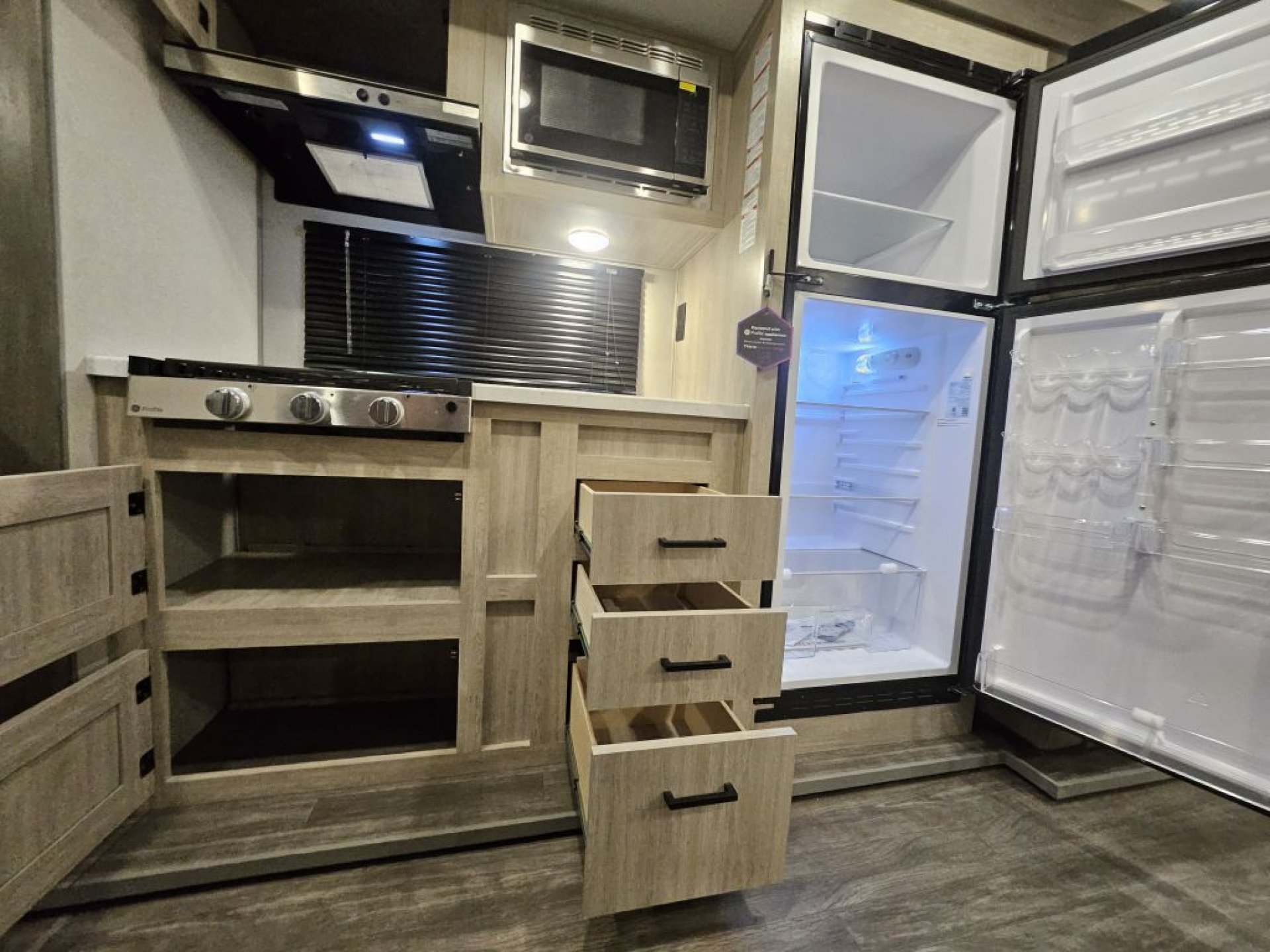 - Kitchen: Equipped with a 3-burner cooktop, stainless steel sink, 10.7 cu. ft. 12V refrigerator, microwave, and flip-up counter extension.