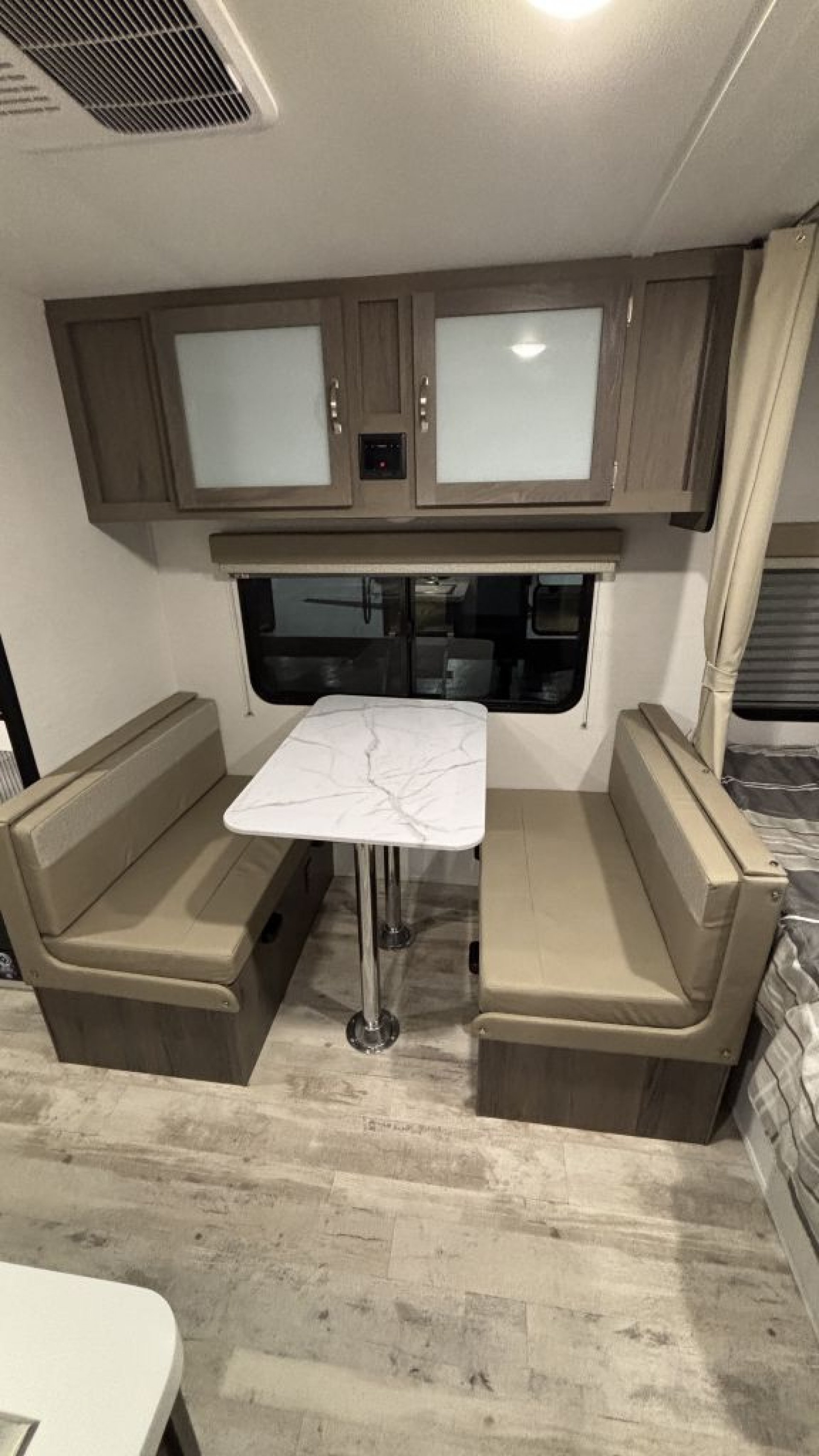 • Living Space: LED lighting, pleated shades, and USB ports; optional TV prep over the dinette.