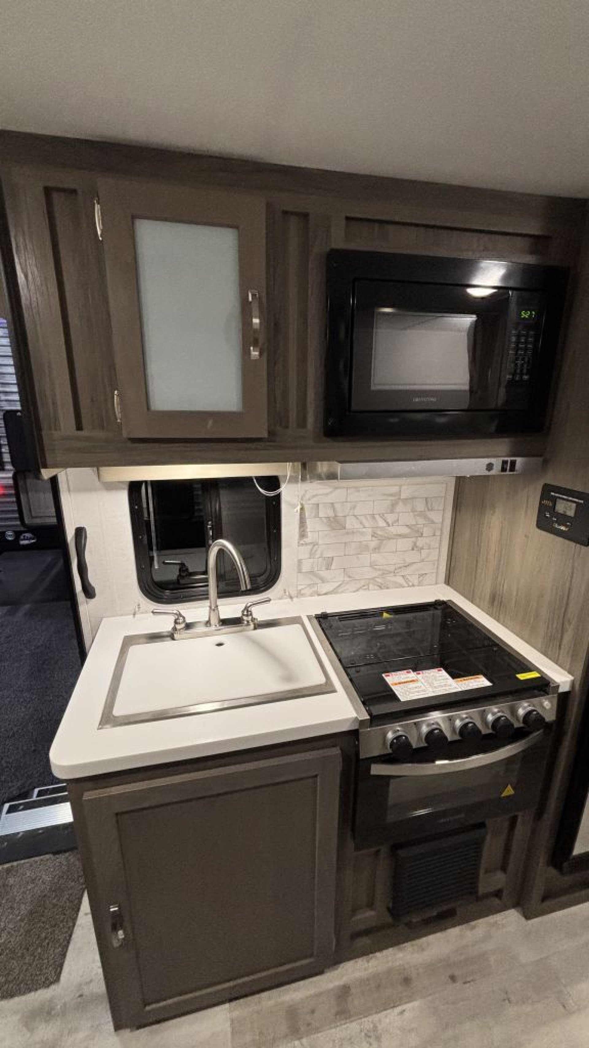 • Kitchen: Two-burner cooktop, microwave, single-bowl sink, and 3 cu. ft. 12V under-counter refrigerator for simple meals.