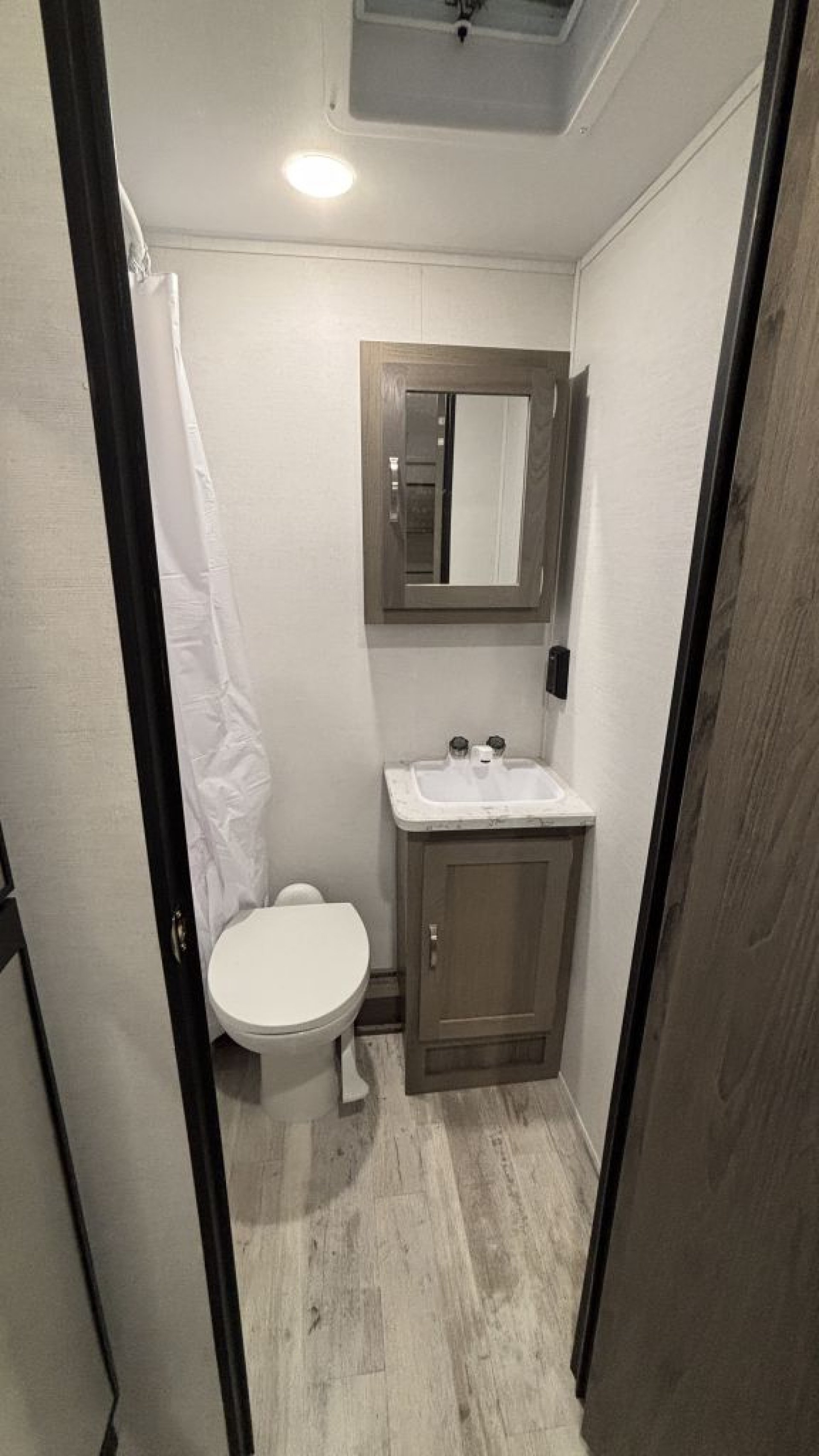 • Bathroom: Full mid-trailer bath with 24" x 36" bathtub/shower combo (tub surround), toilet, sink, and linen storage.