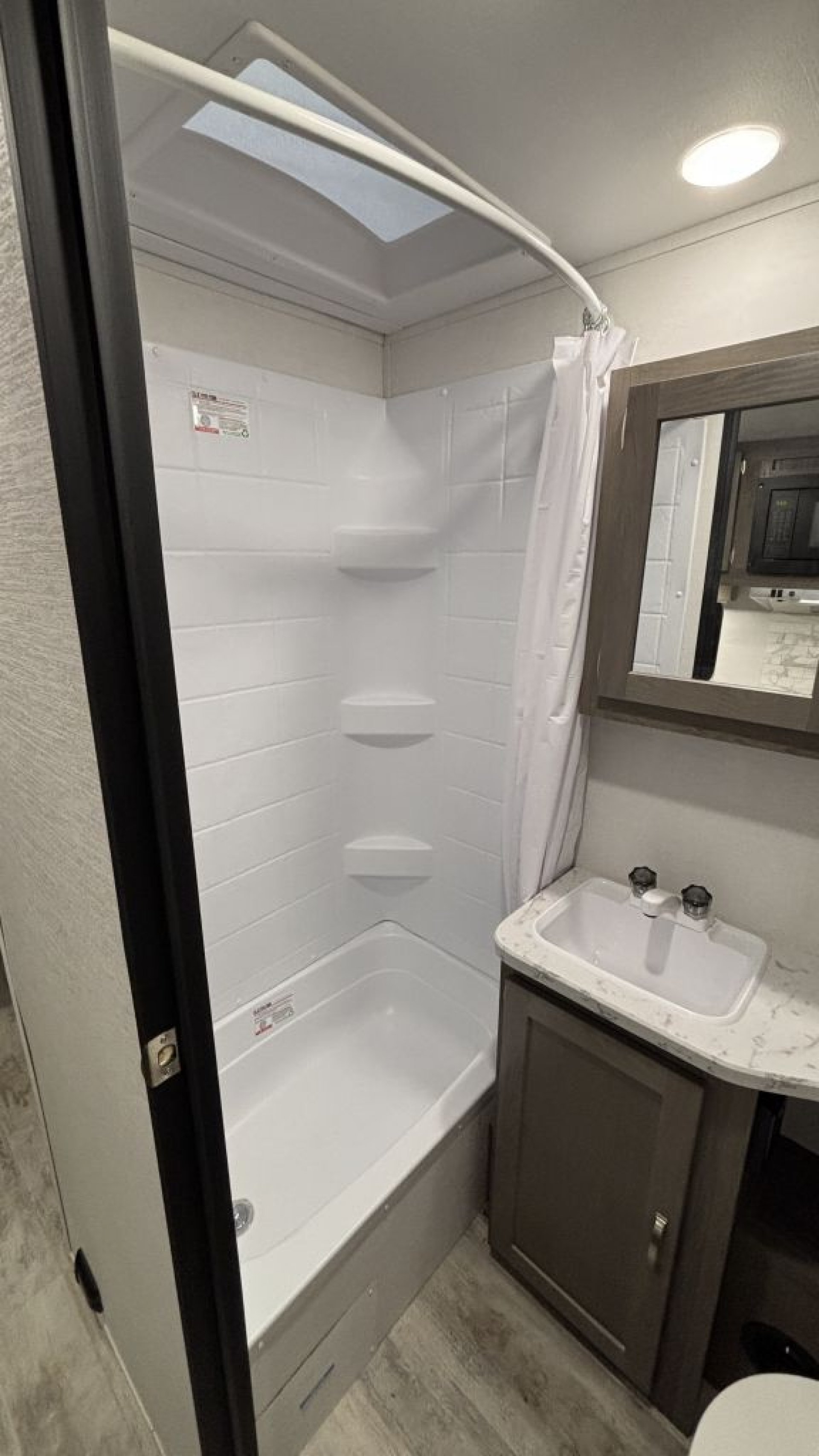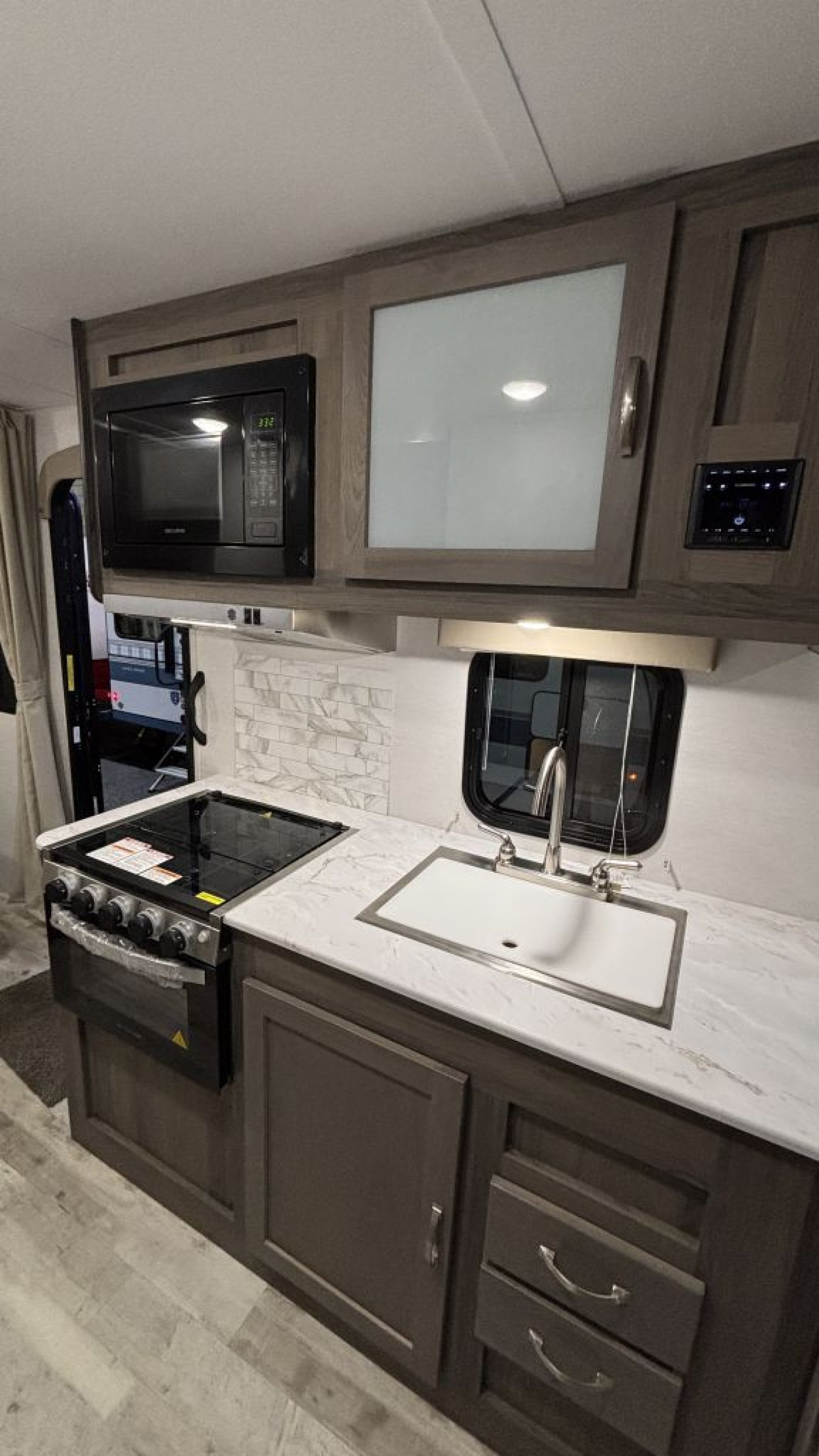 - Kitchen: Two-burner cooktop, microwave oven, single-bowl sink, and mini 3 cu. ft. 12V refrigerator for simple meals.