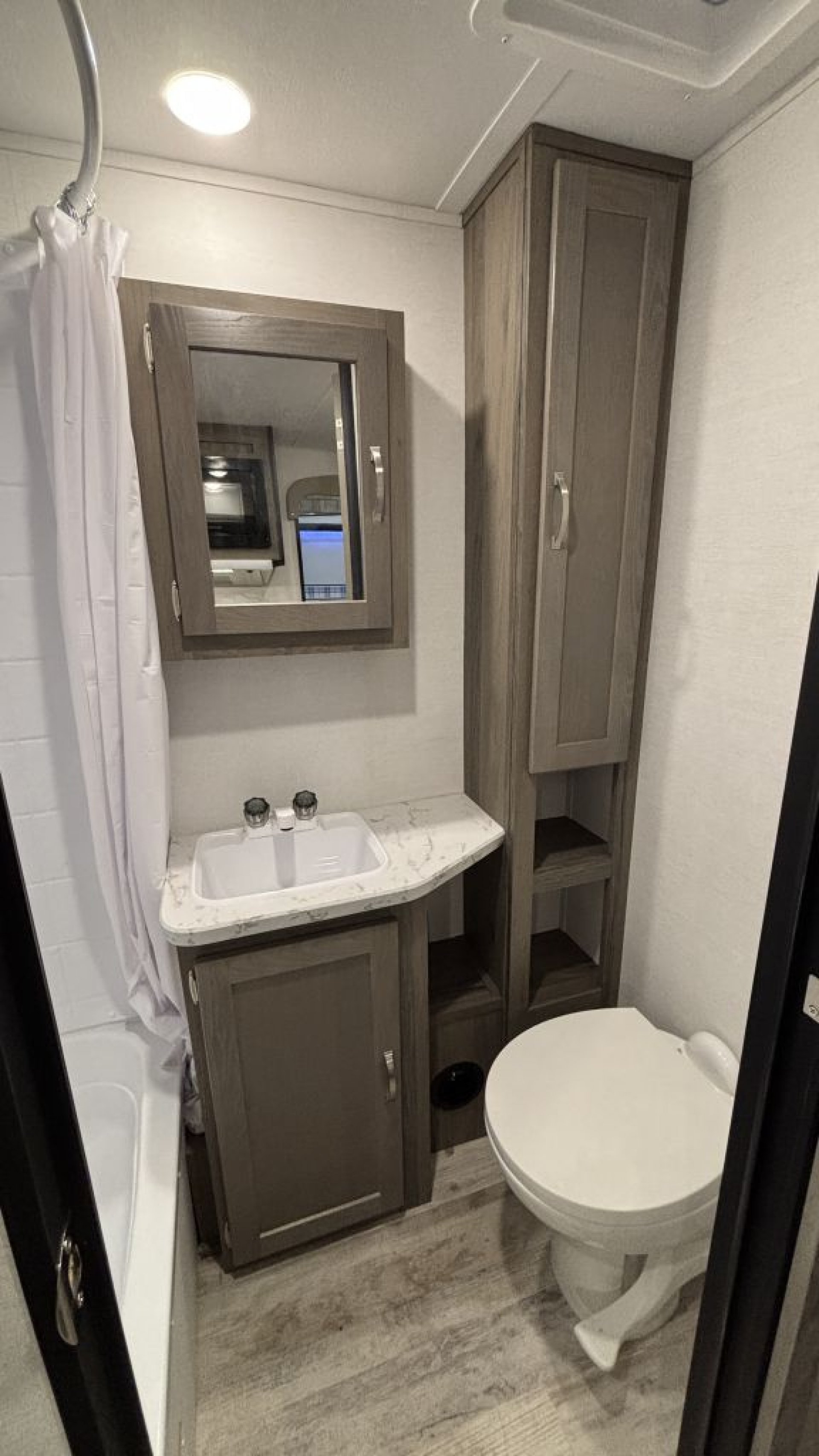 - Bathroom: Full rear bath with shower, toilet, sink, wardrobe, and linen storage for privacy.
