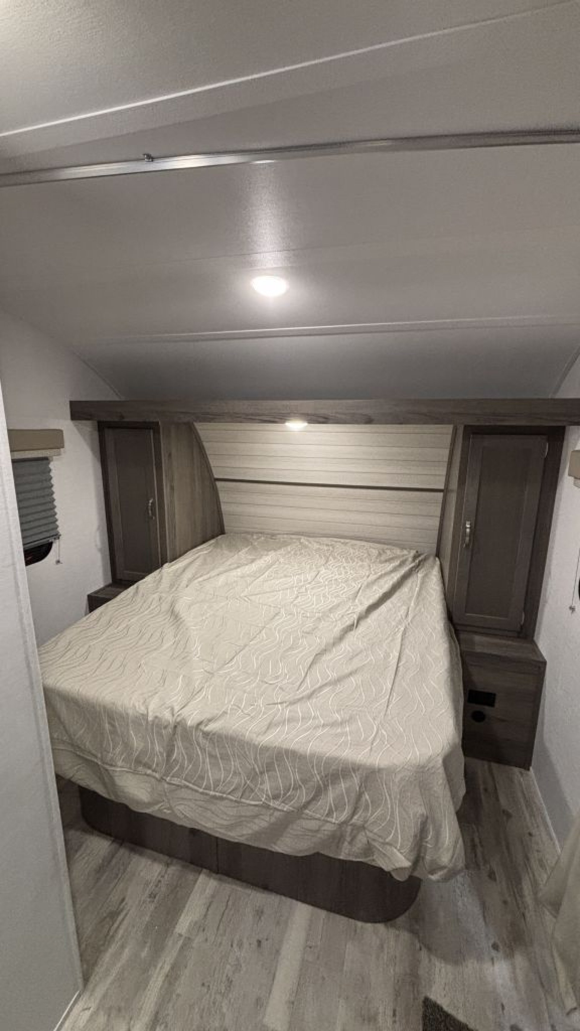 - Front Bedroom: Walk-around queen bed (60" x 74") with poly mattress, dual shirt closets on either side, and overhead cabinets for storage.