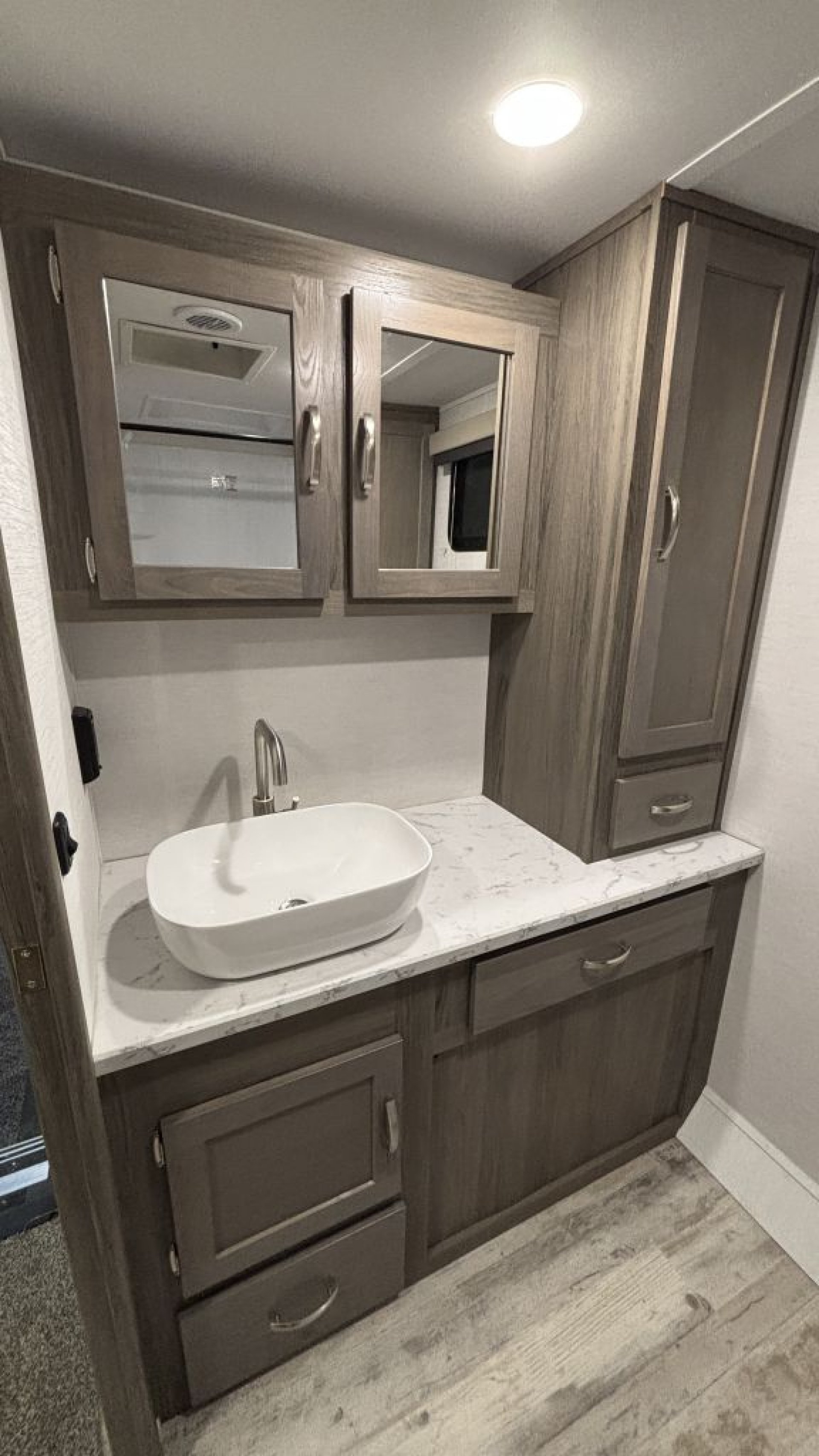 - Construction: Enclosed underbelly with heated tanks, one-piece vinyl roof, Azdel walls, and prep for solar, satellite, cable, and backup camera.