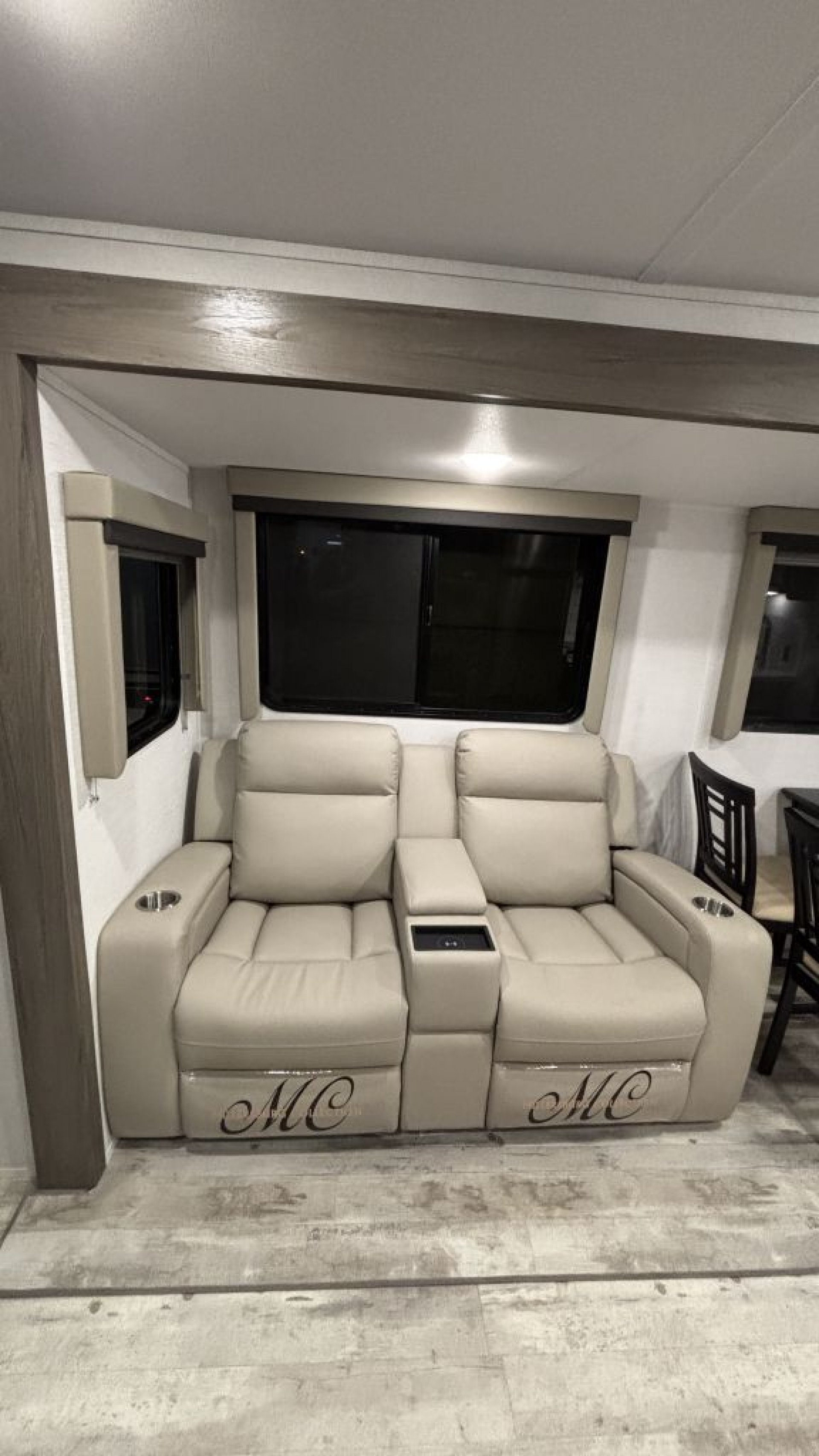 - Living Space: LED lighting, pleated shades, USB ports, and optional 40" HDTV; theater seating upgrade available.