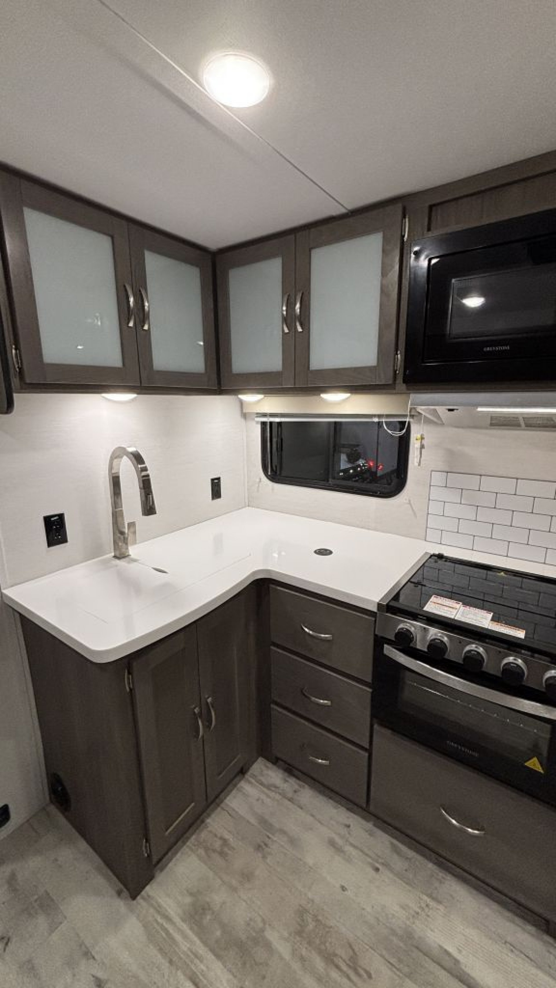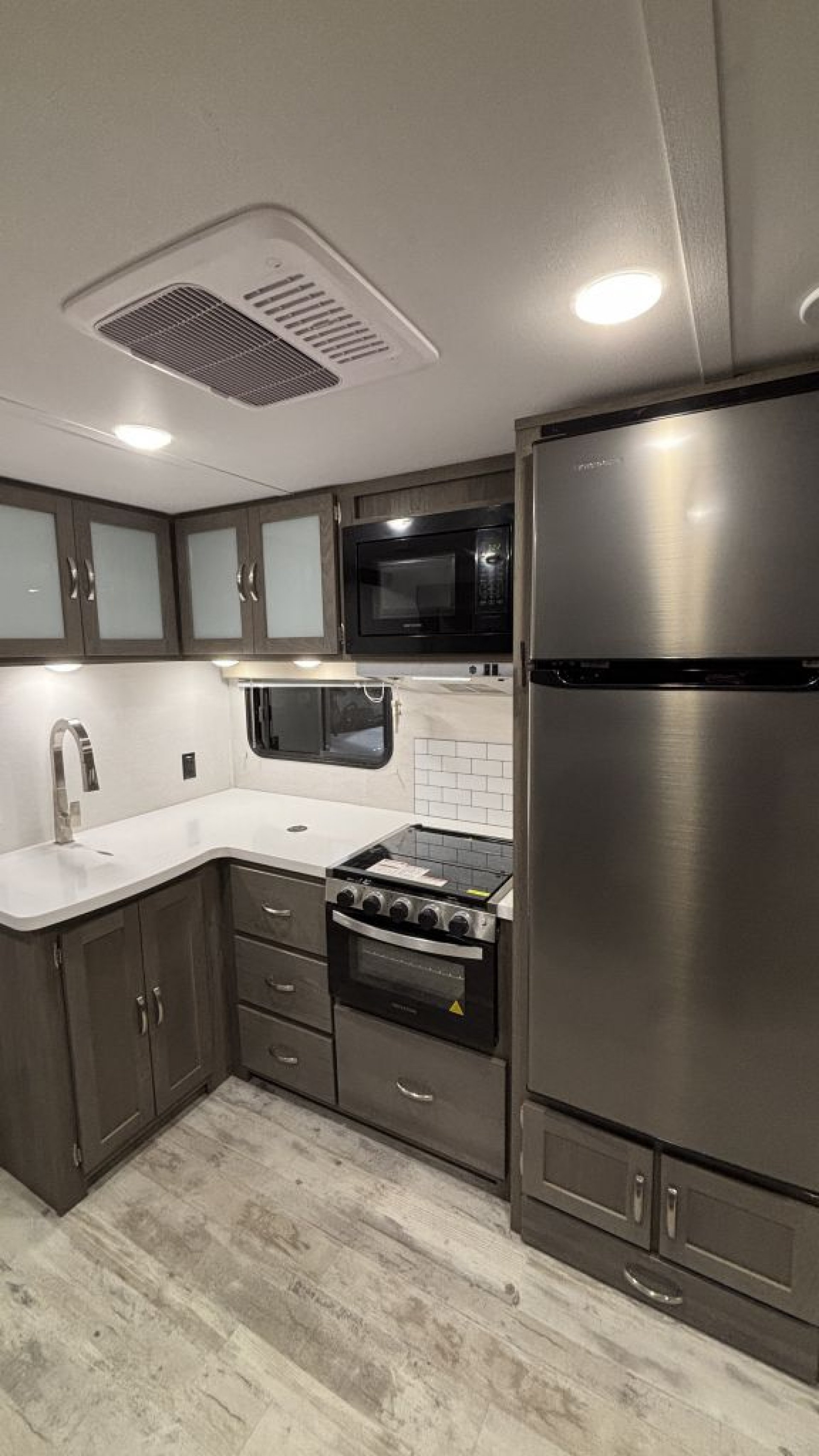 - Kitchen: Solid-surface countertops, stainless steel 3-burner cooktop with oven, microwave, 6 cu. ft. 12V refrigerator, deep sink, and flip-up counter; dog dish drawer below the fridge.