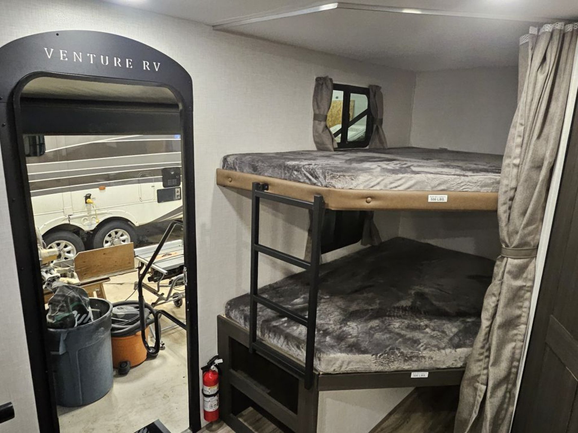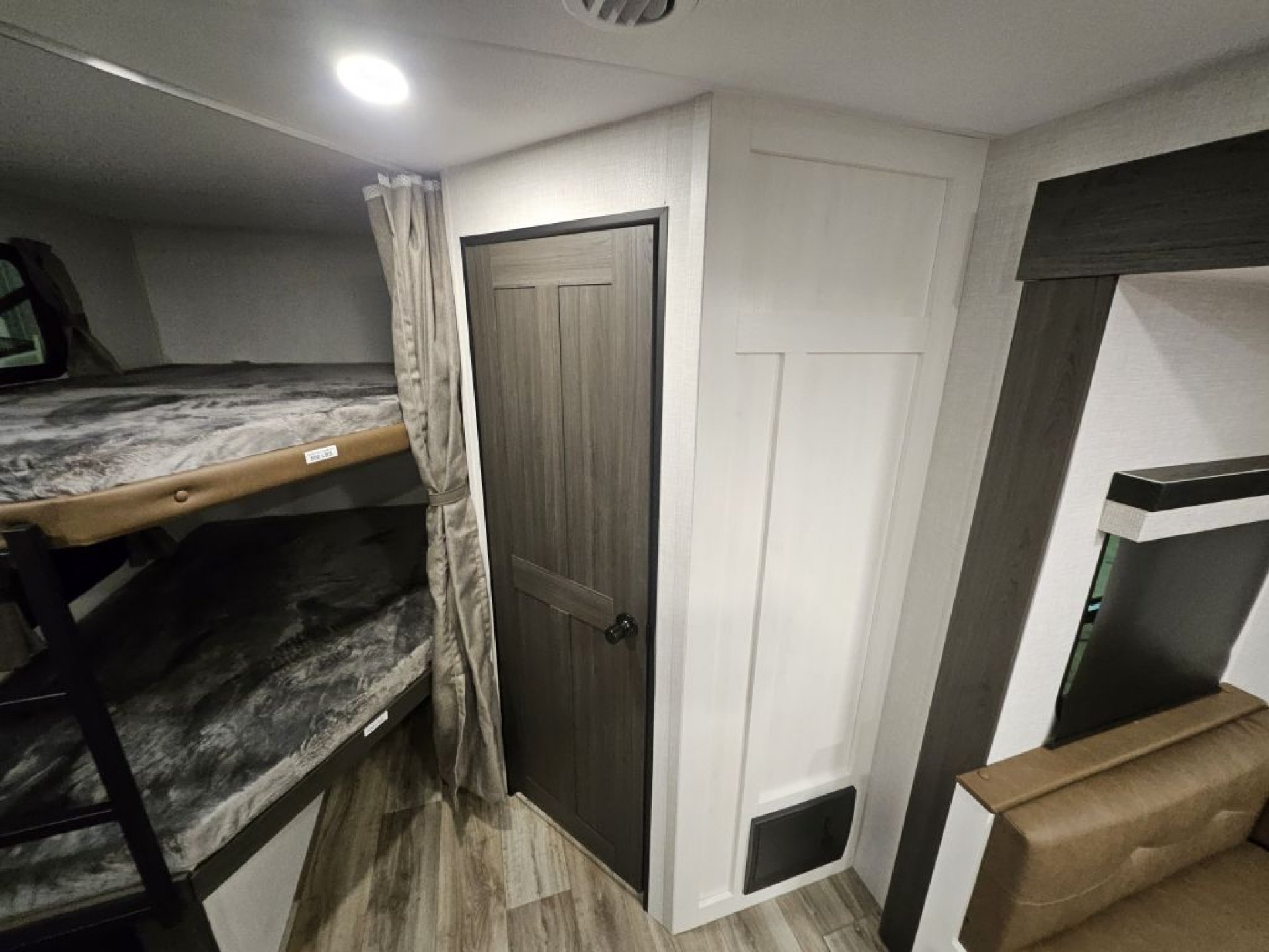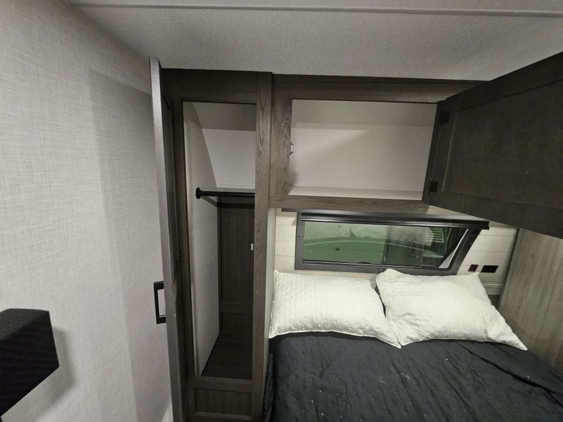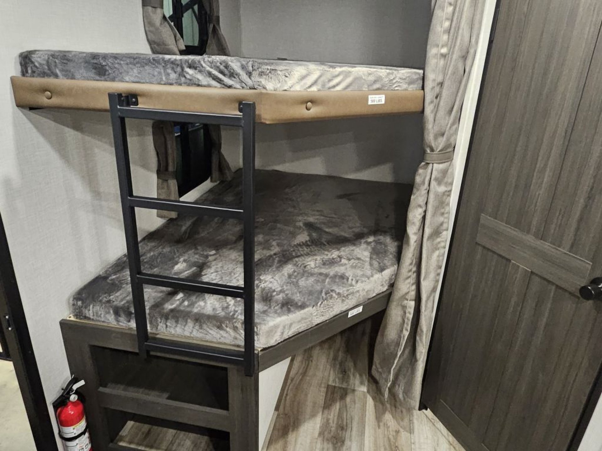 • Bunkhouse Area: Rear double bunks (44" x 74" lower; 54" x 74" upper) with storage below and a wardrobe; optional loft for extra sleeping.