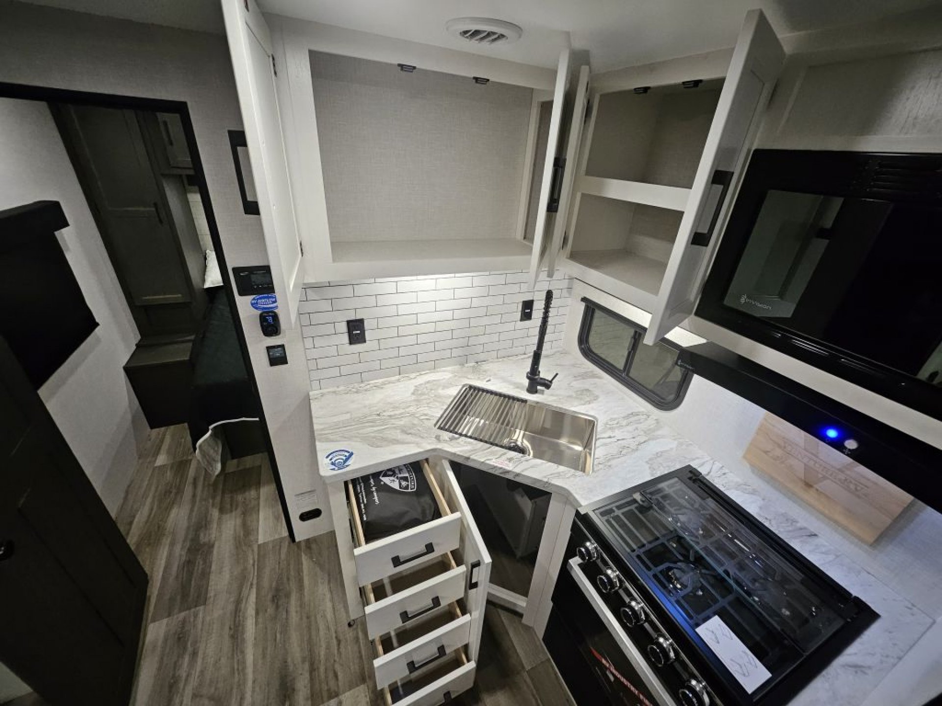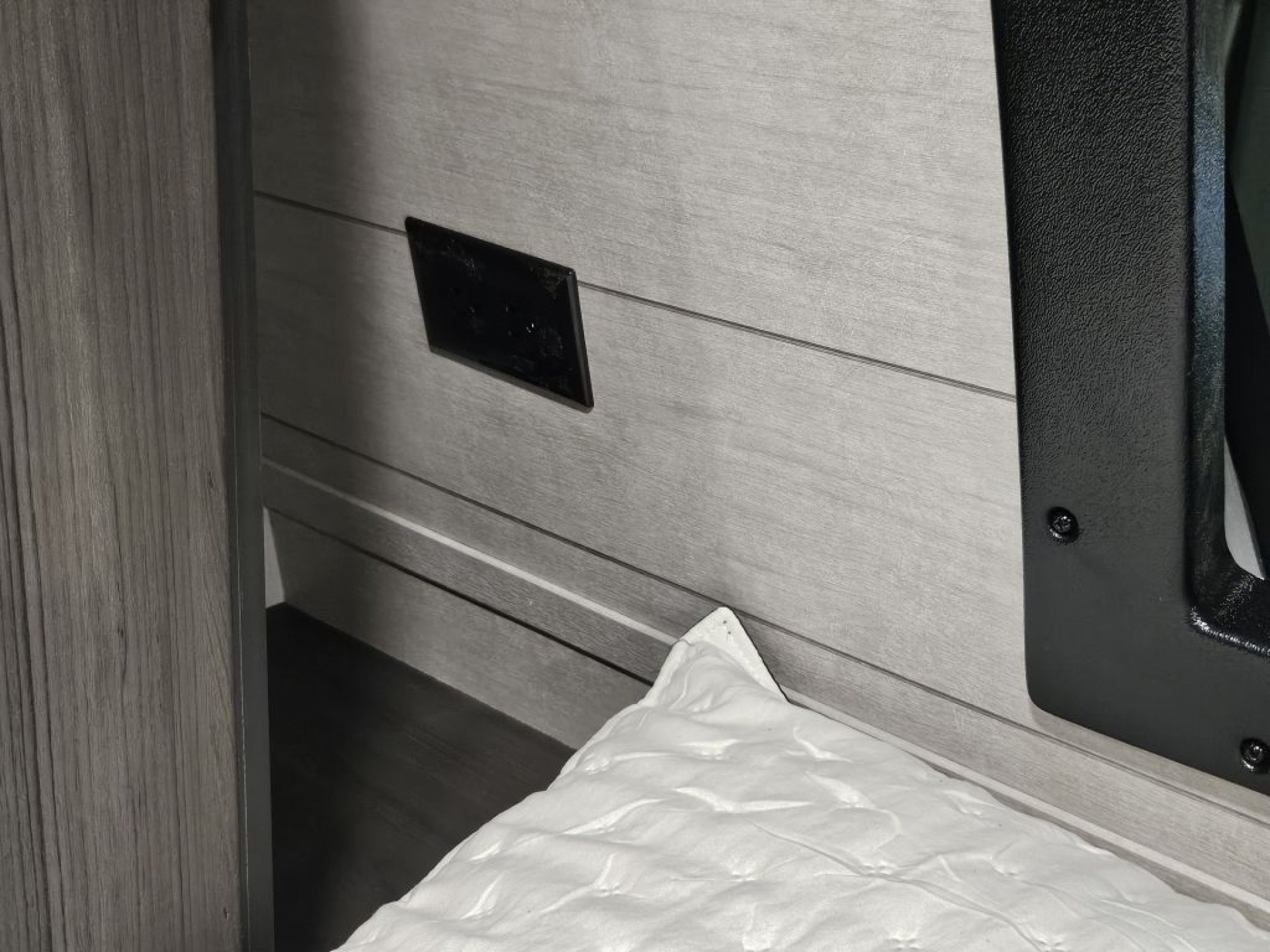 • Living Space: LED lighting, blackout shades, USB/110V outlets, and theater seating option; electric fireplace for cozy evenings.