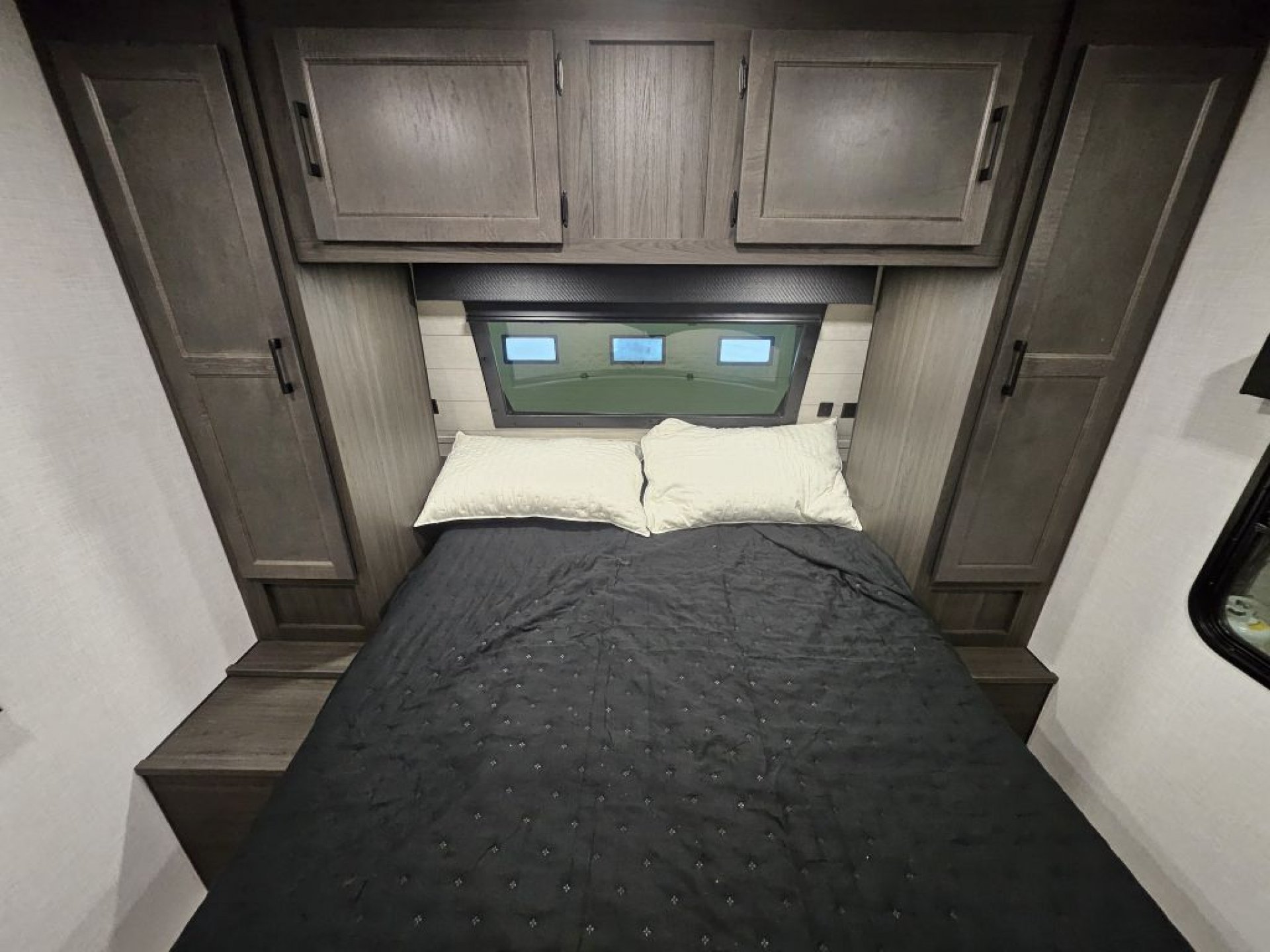• Front Bedroom: Walk-around queen bed (60" x 80") with dual wardrobes, overhead cabinets, and under-bed storage for privacy.