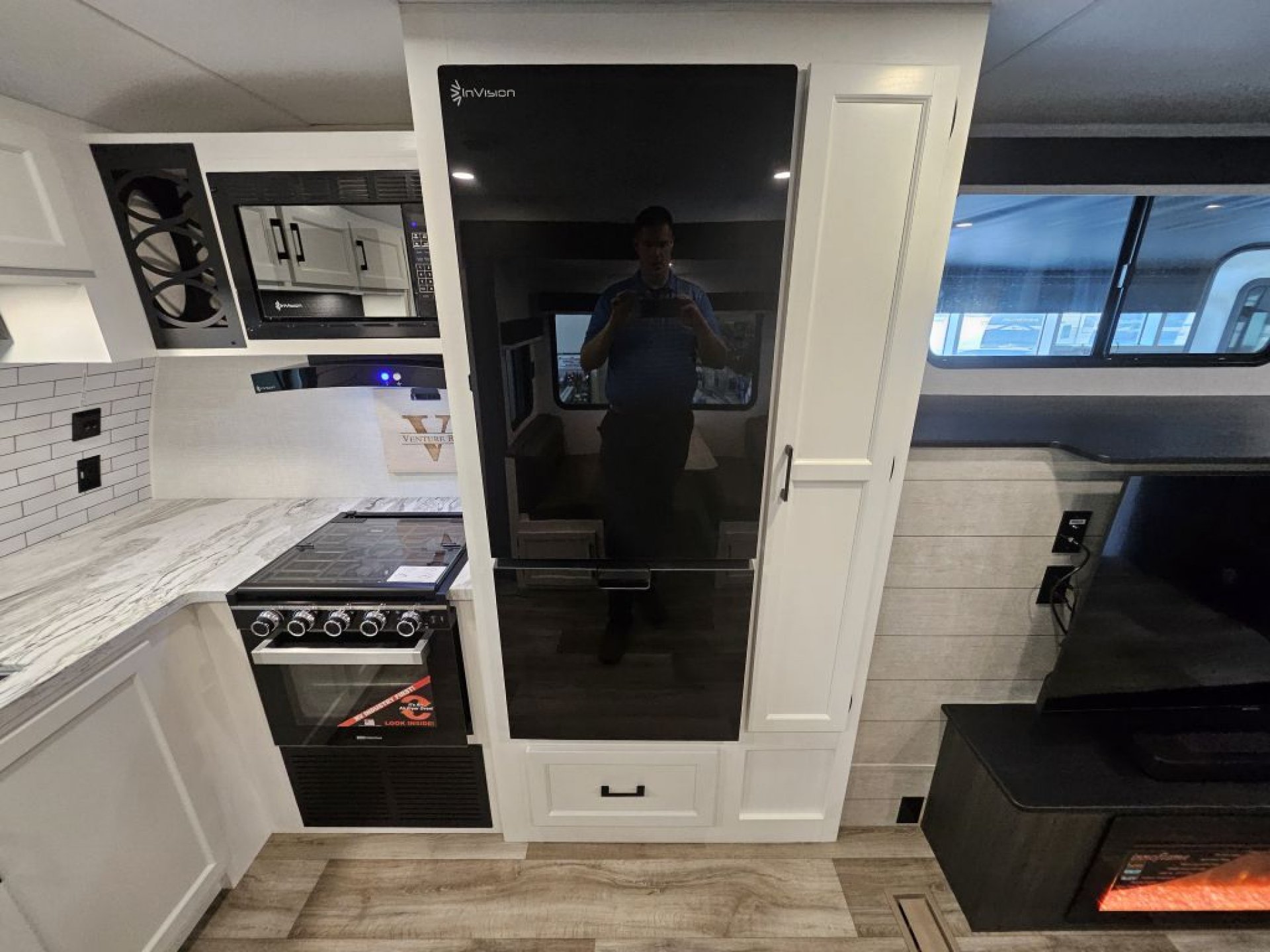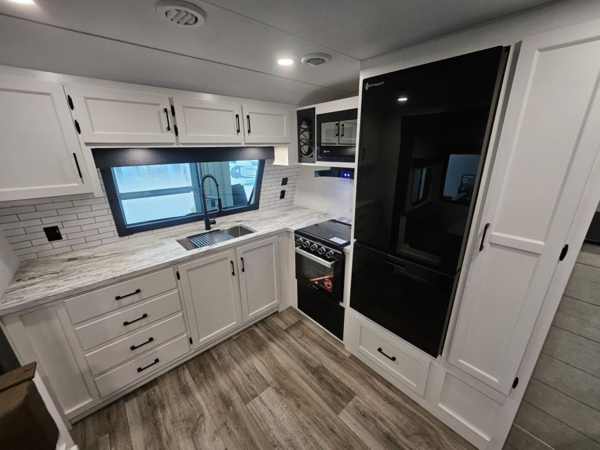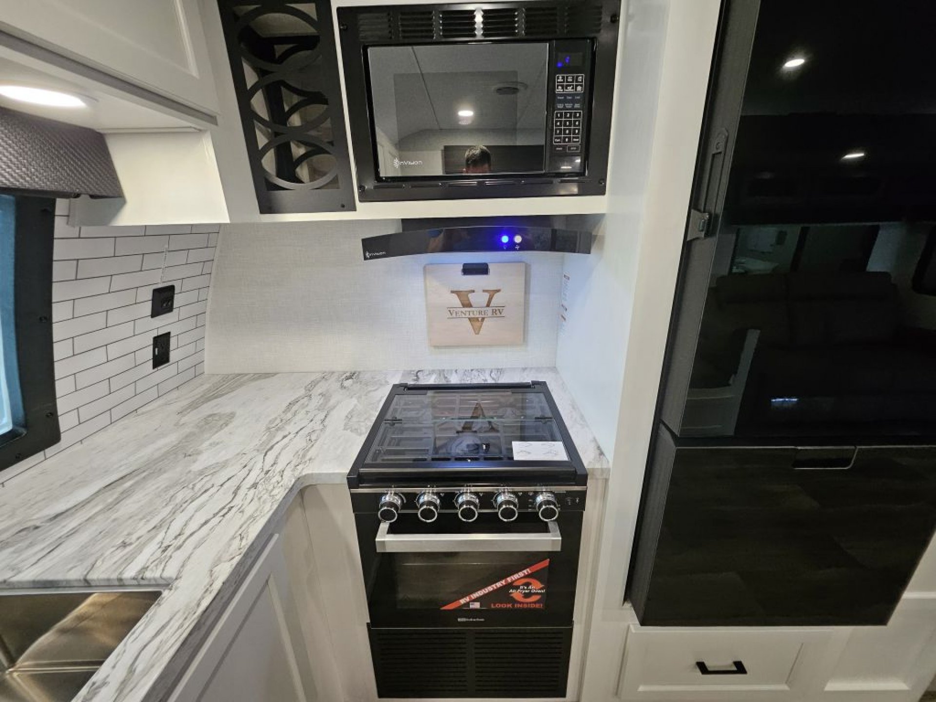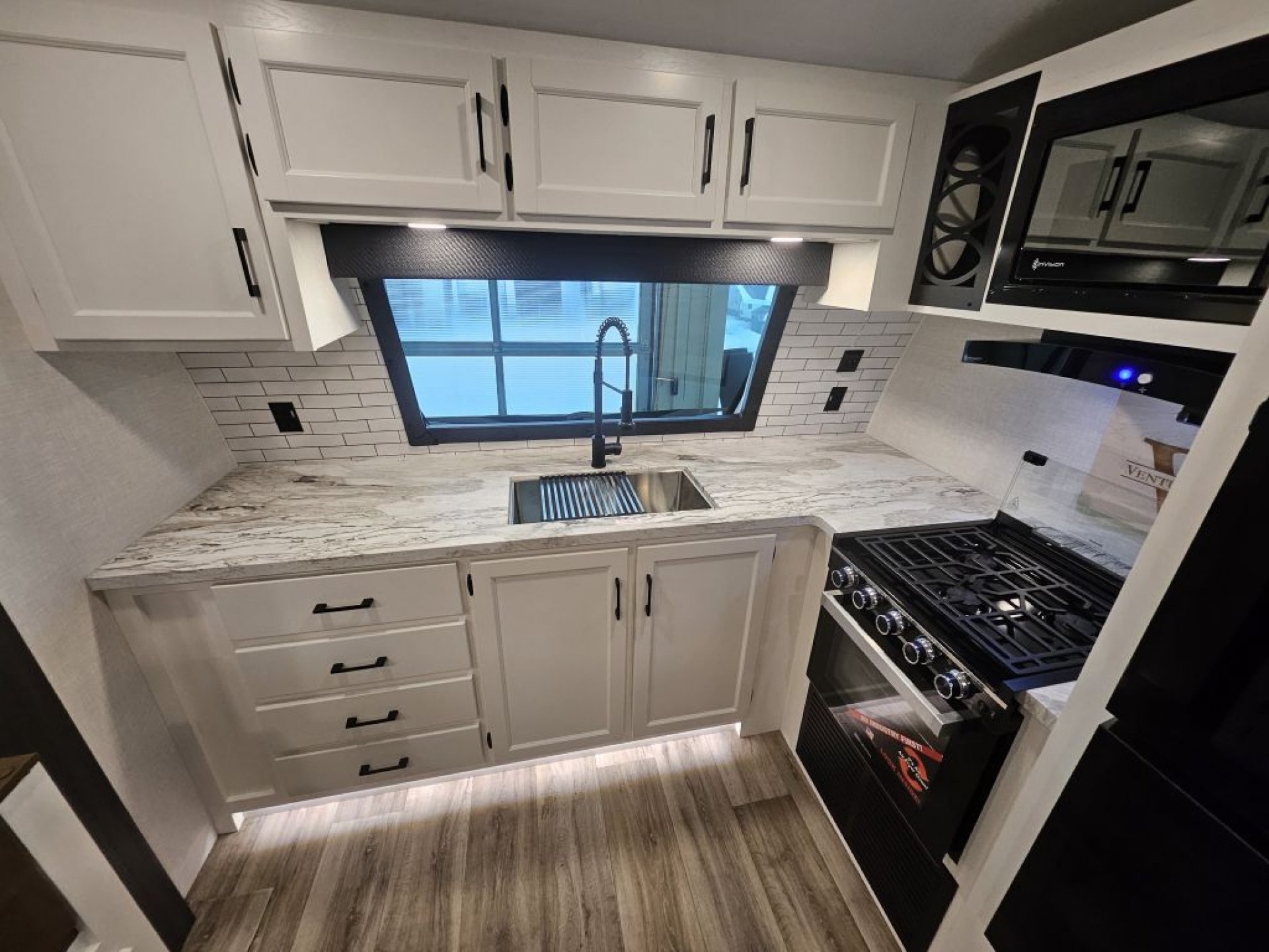 - Kitchen: U-shaped kitchen with residential appliances, residential cabinets and drawers, adjustable pantry, large 12 volt refrigerator, 3 burner cook top with air fryer capable oven, microwave, wine rack and an XL counter for your meal prep.