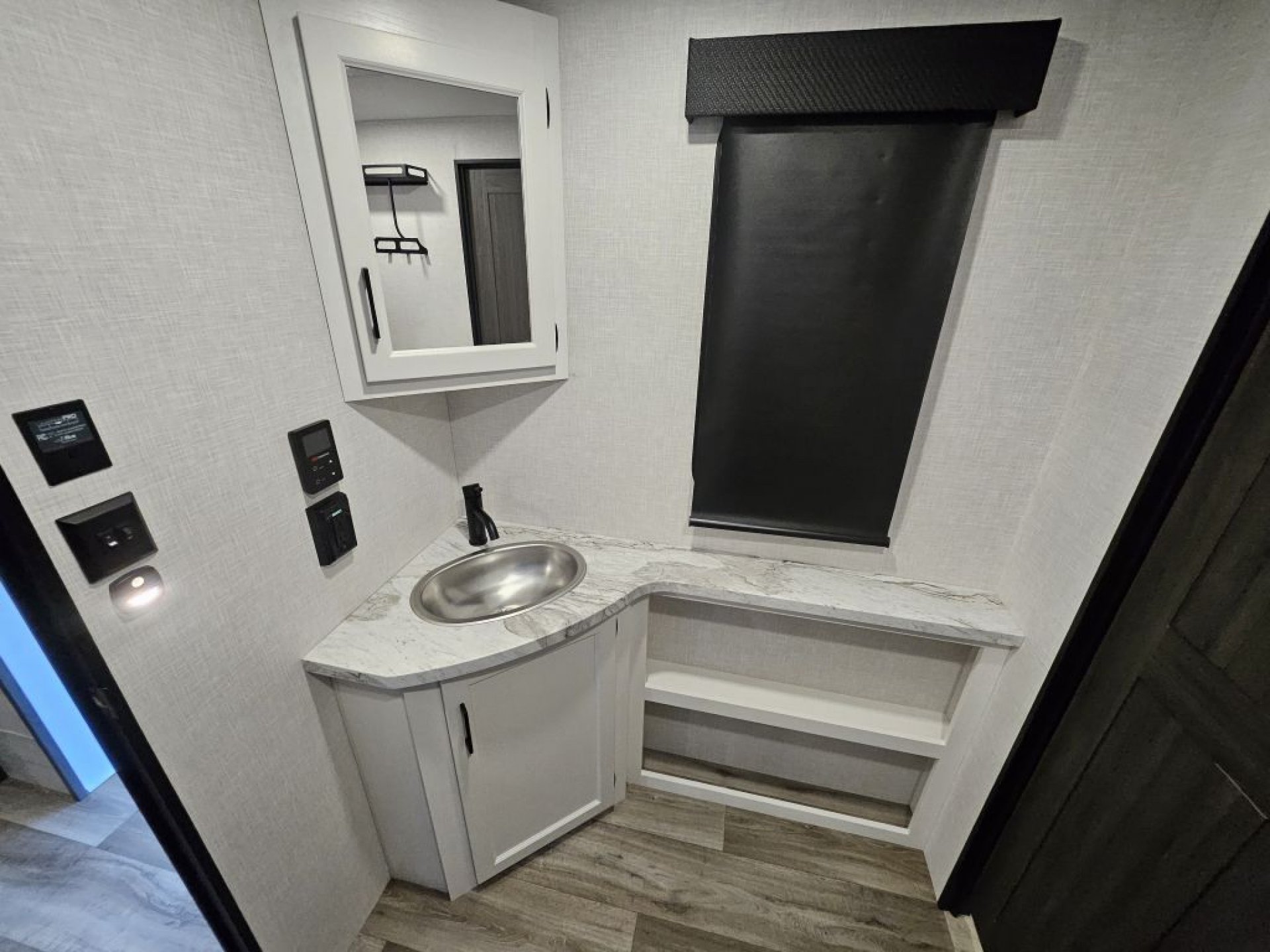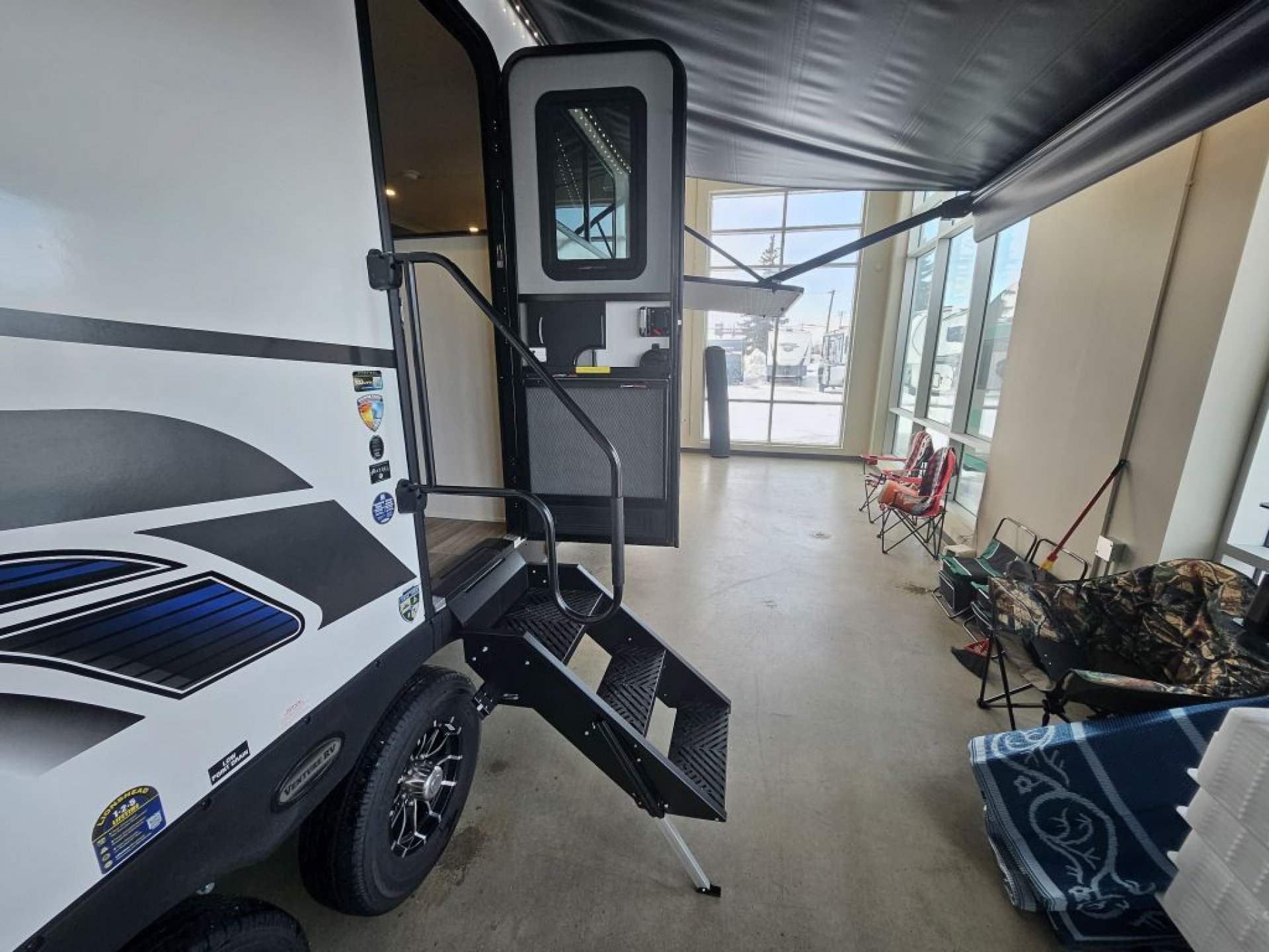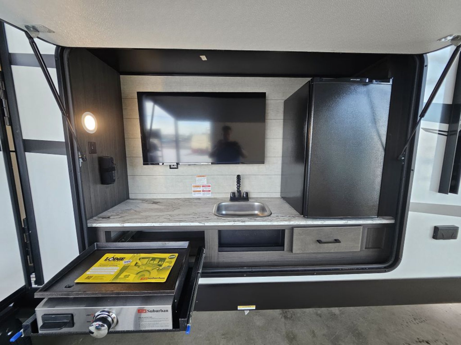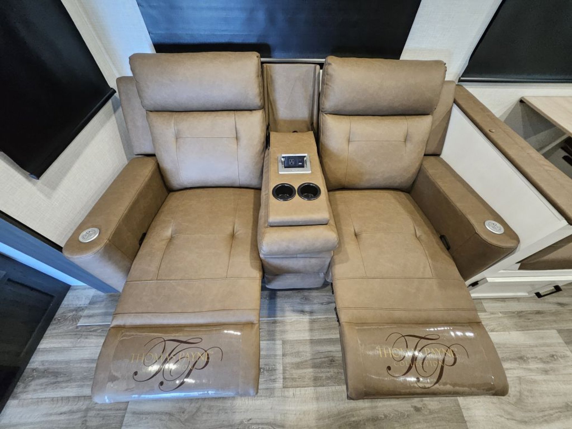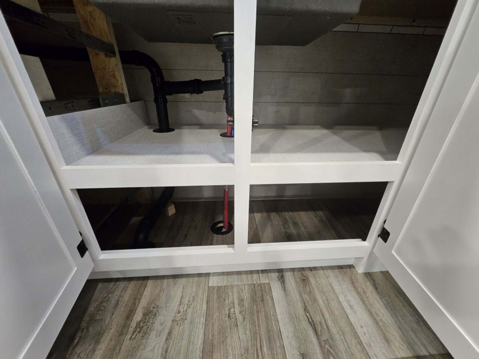 - Kitchen: U-shaped kitchen with residential appliances, residential cabinets and drawers, adjustable pantry, large 12 volt refrigerator, 3 burner cook top with air fryer capable oven, microwave, wine rack and an XL counter for your meal prep.