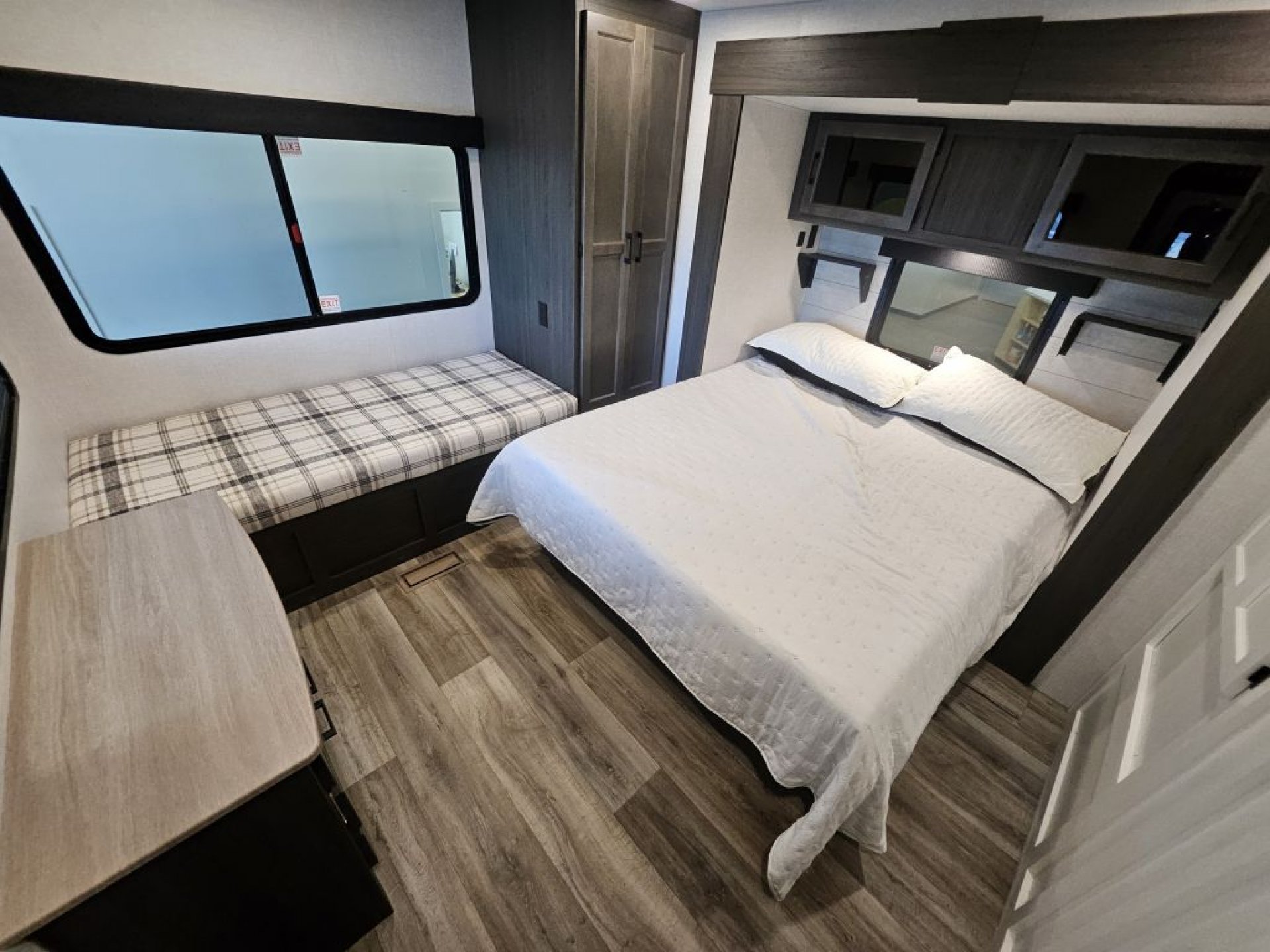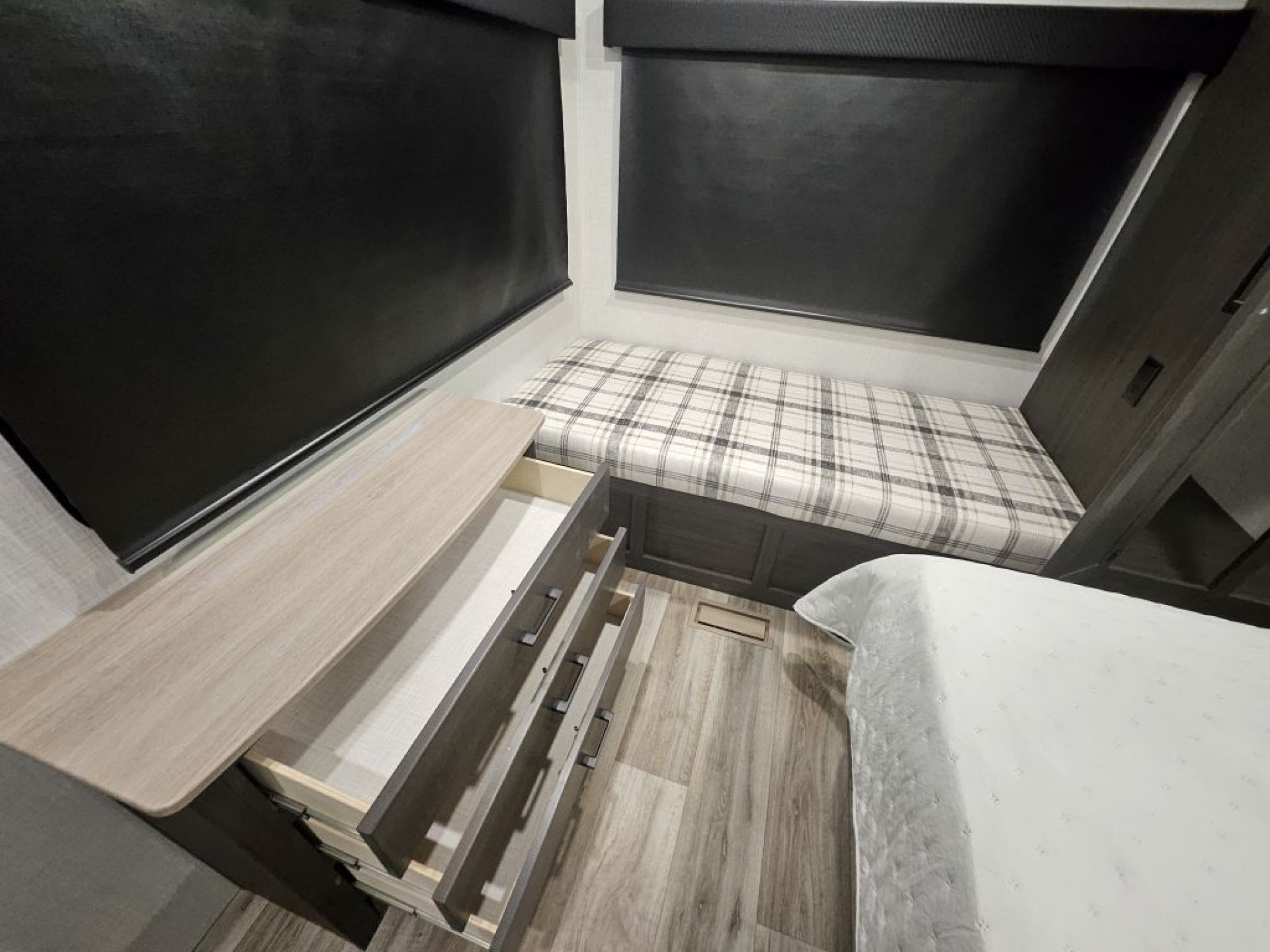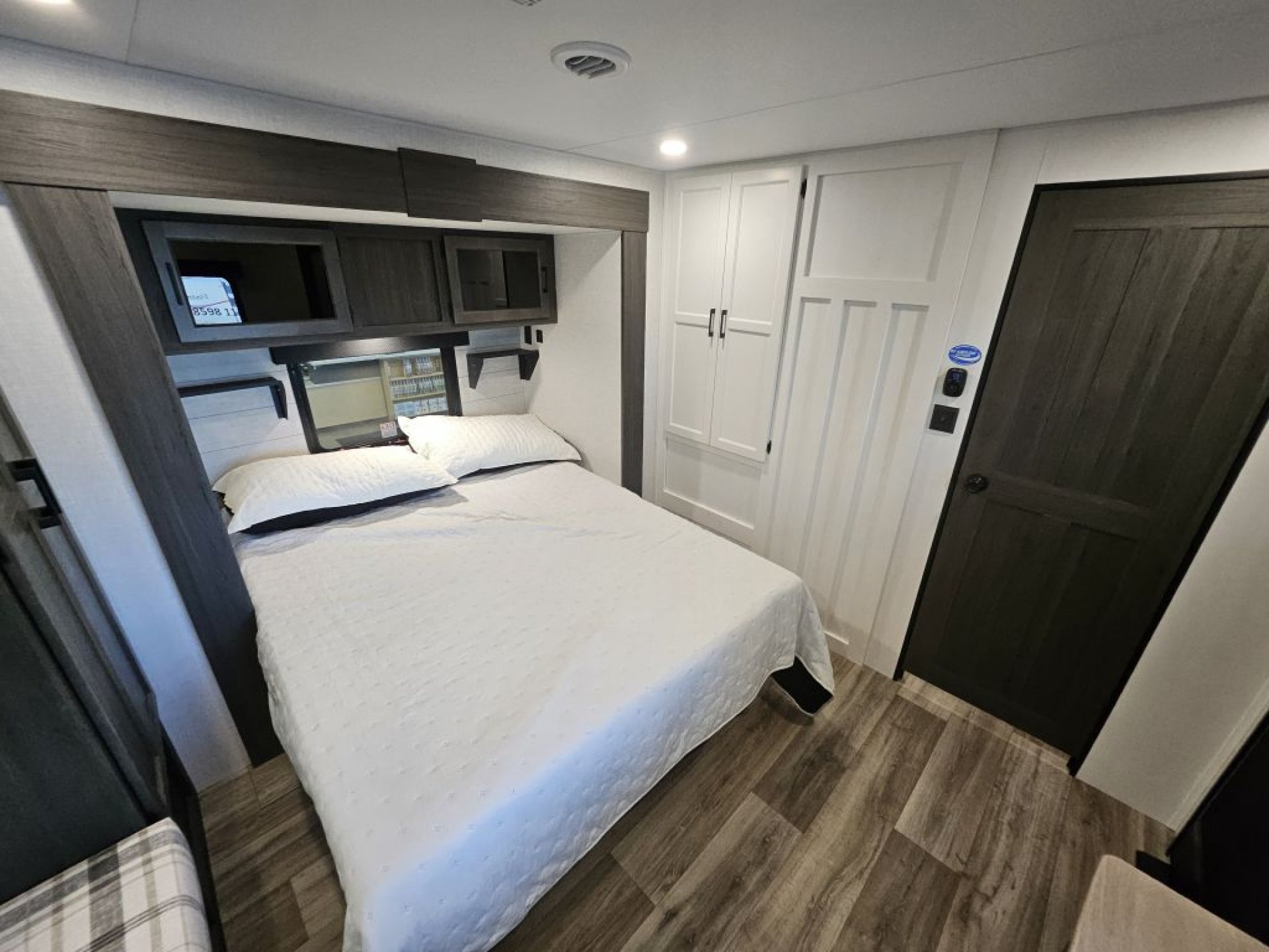 - Rear Bedroom: Private Queen bed suite (60" x 80") with dual wardrobes, overhead storage, lounging bench, large dresser and closet with washer/dryer prep.