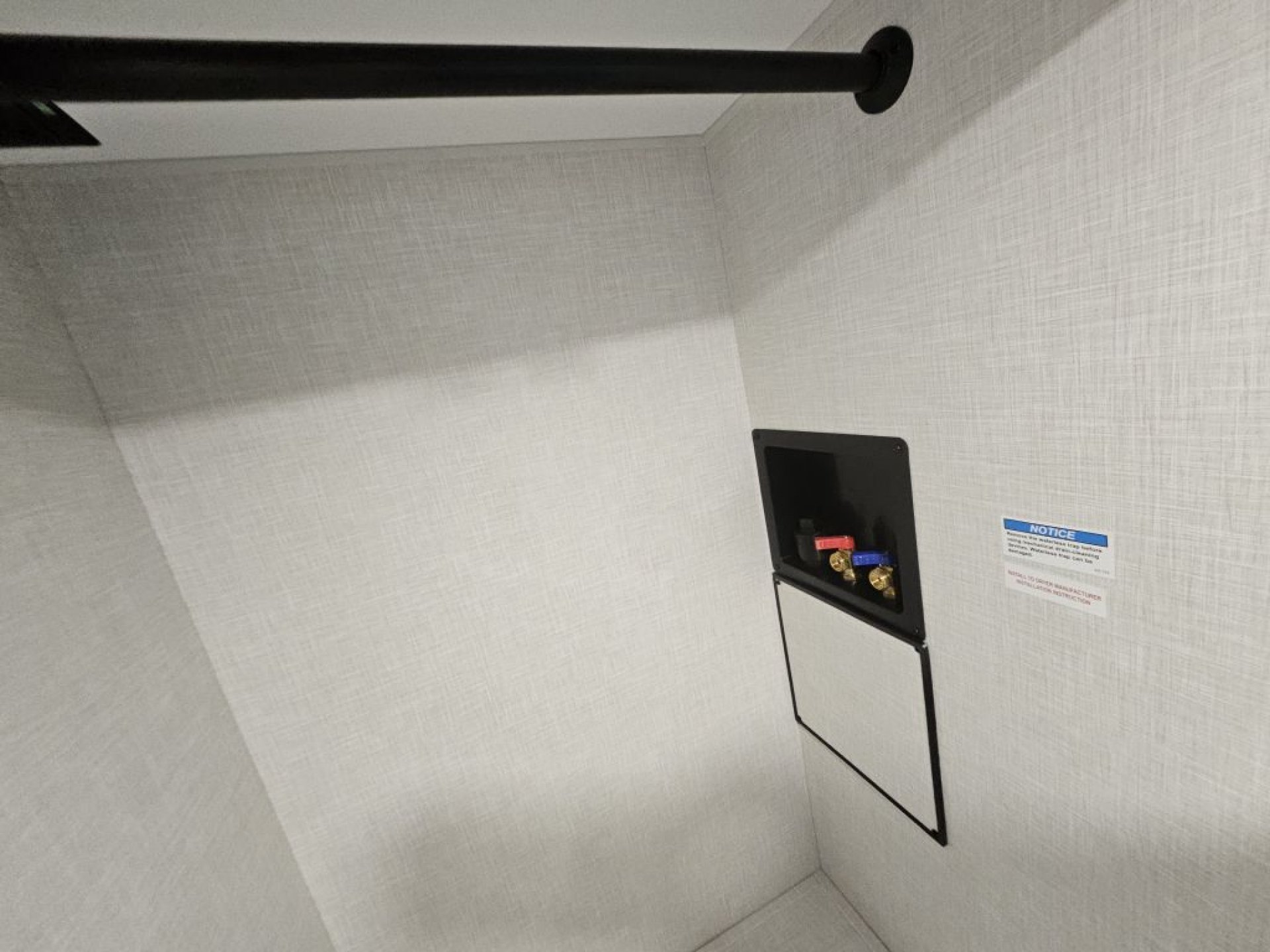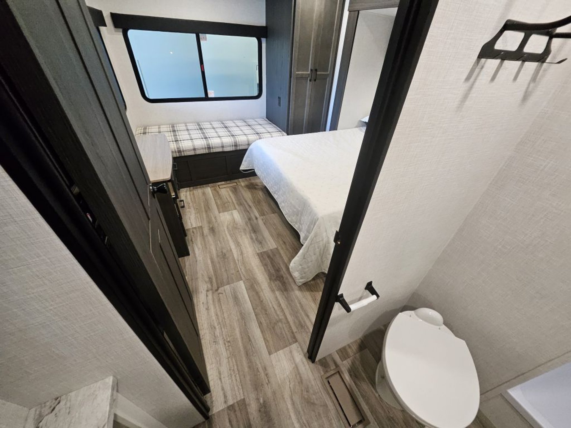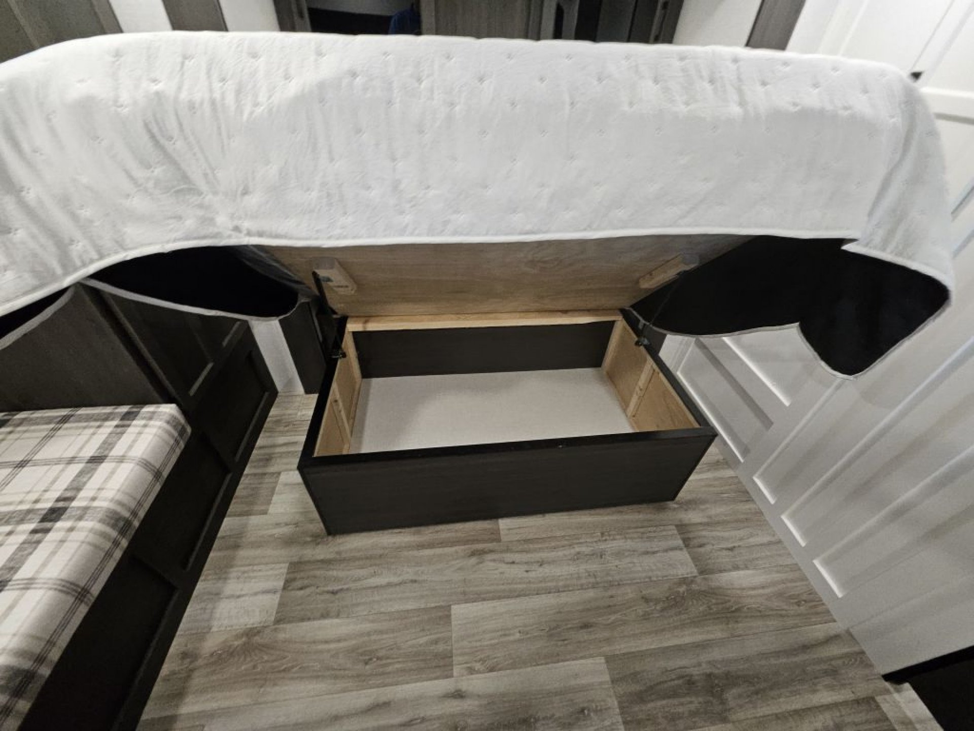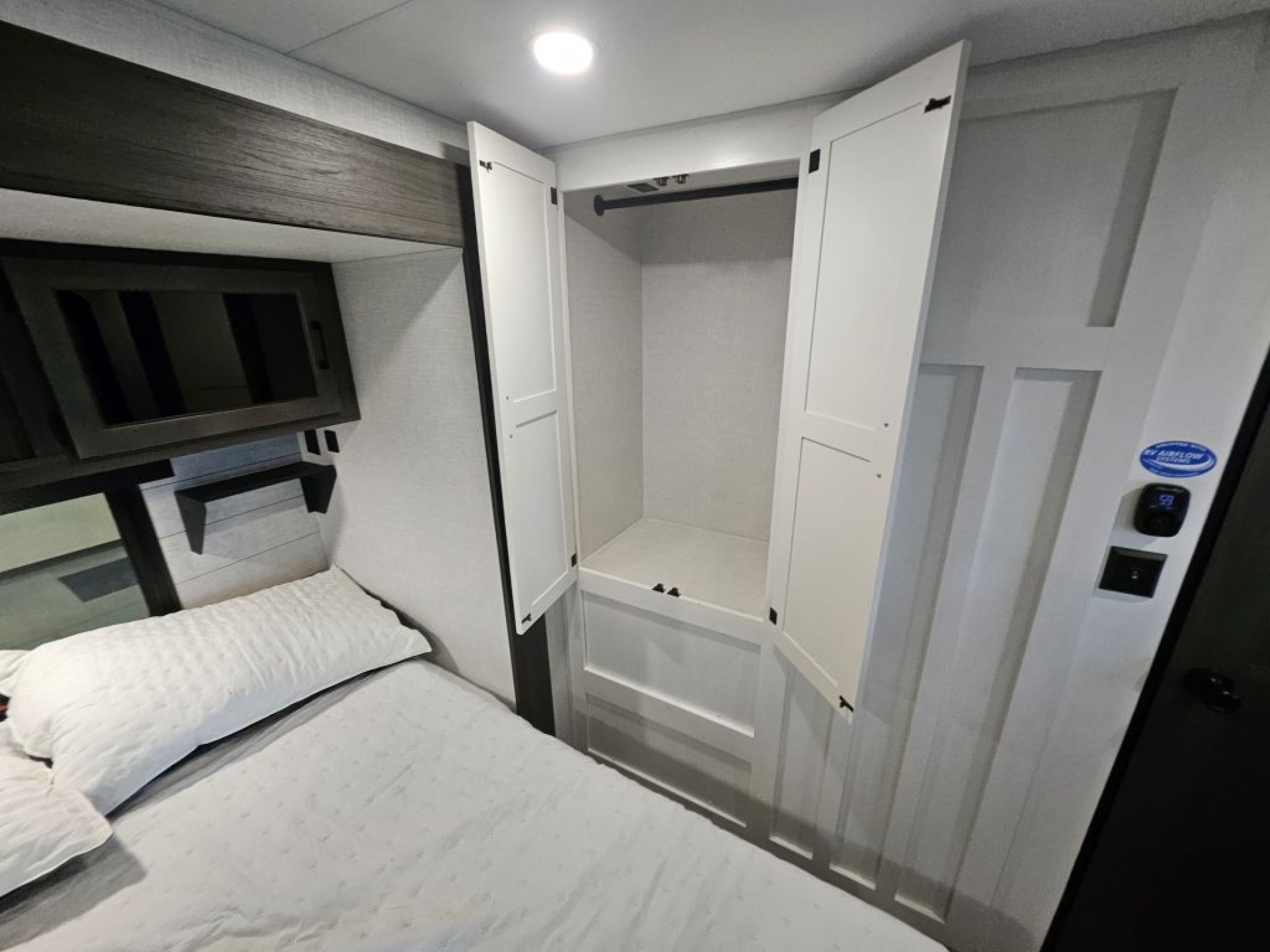 - Rear Bedroom: Private Queen bed suite (60" x 80") with dual wardrobes, overhead storage, lounging bench, large dresser and closet with washer/dryer prep.