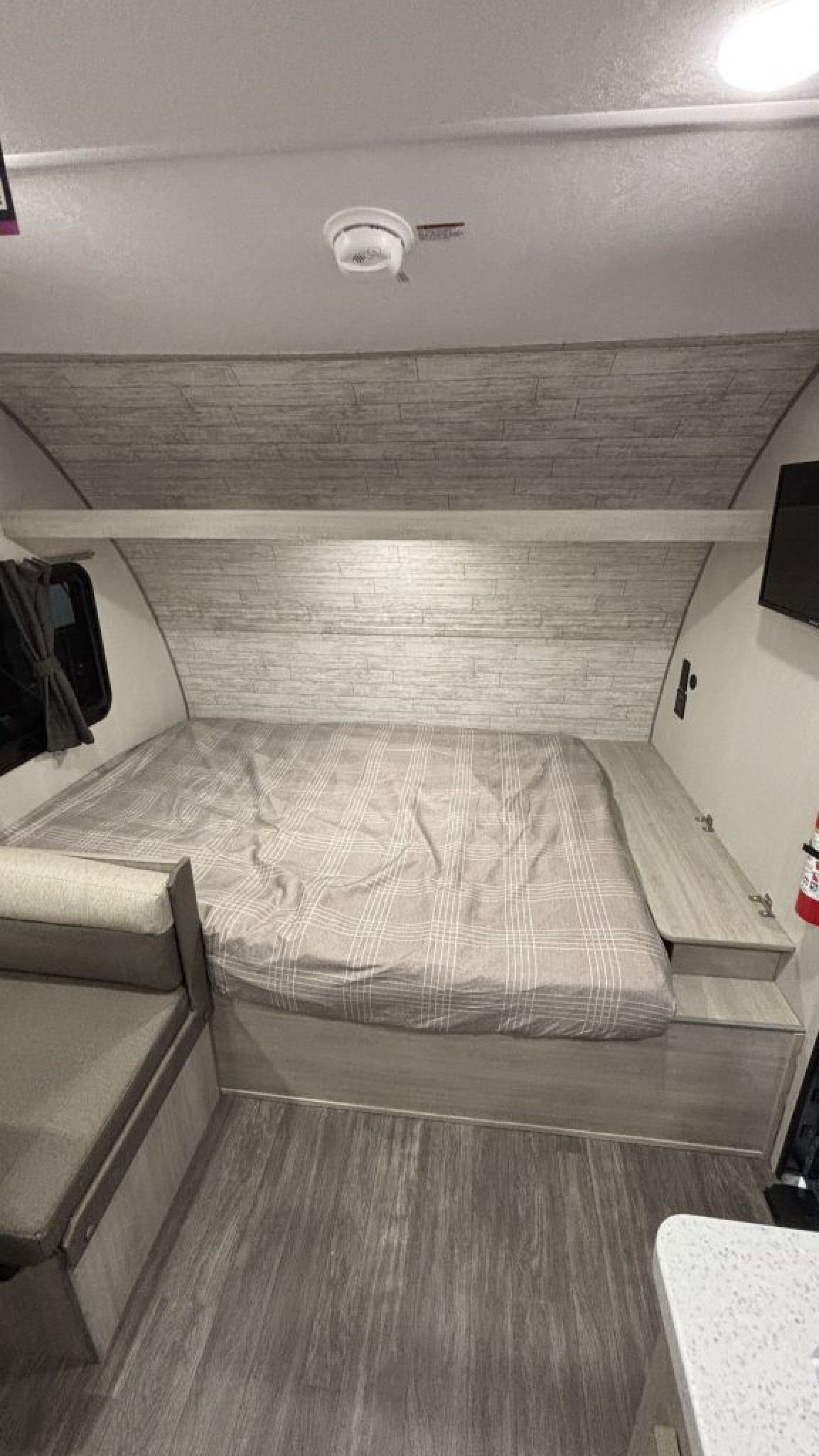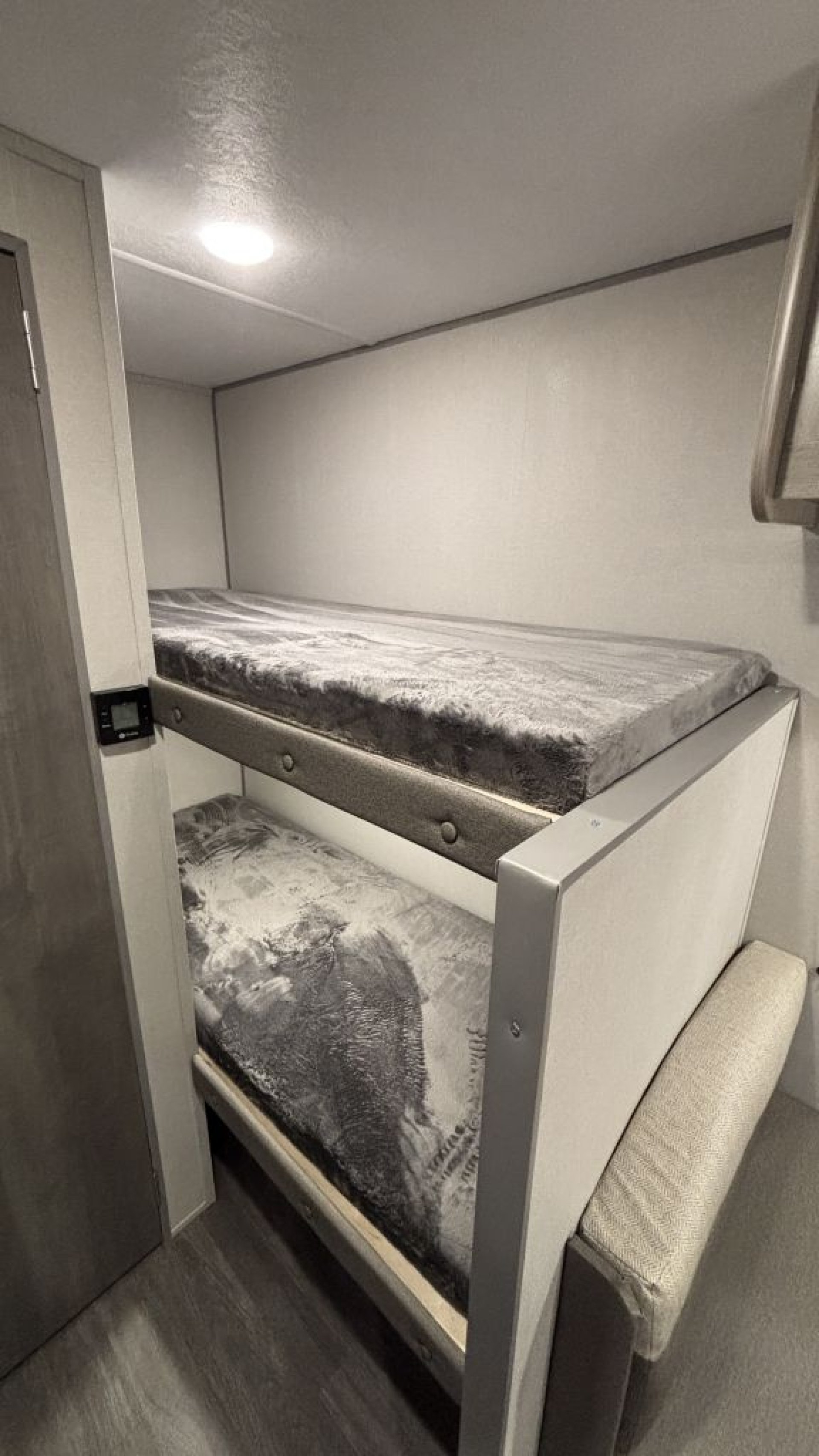 Inside, the layout is centered around versatility and sleeping capacity. The front dinette converts into a comfortable main sleeping area, while the rear features oversized double-over-double bunks—an upgrade over traditional narrow bunks. These larger bunks comfortably accommodate children, teens, or even adults, making this floorplan especially attractive for families who need real sleeping space in a compact unit. Overall sleeping capacity is approximately 5–6 depending on configuration.