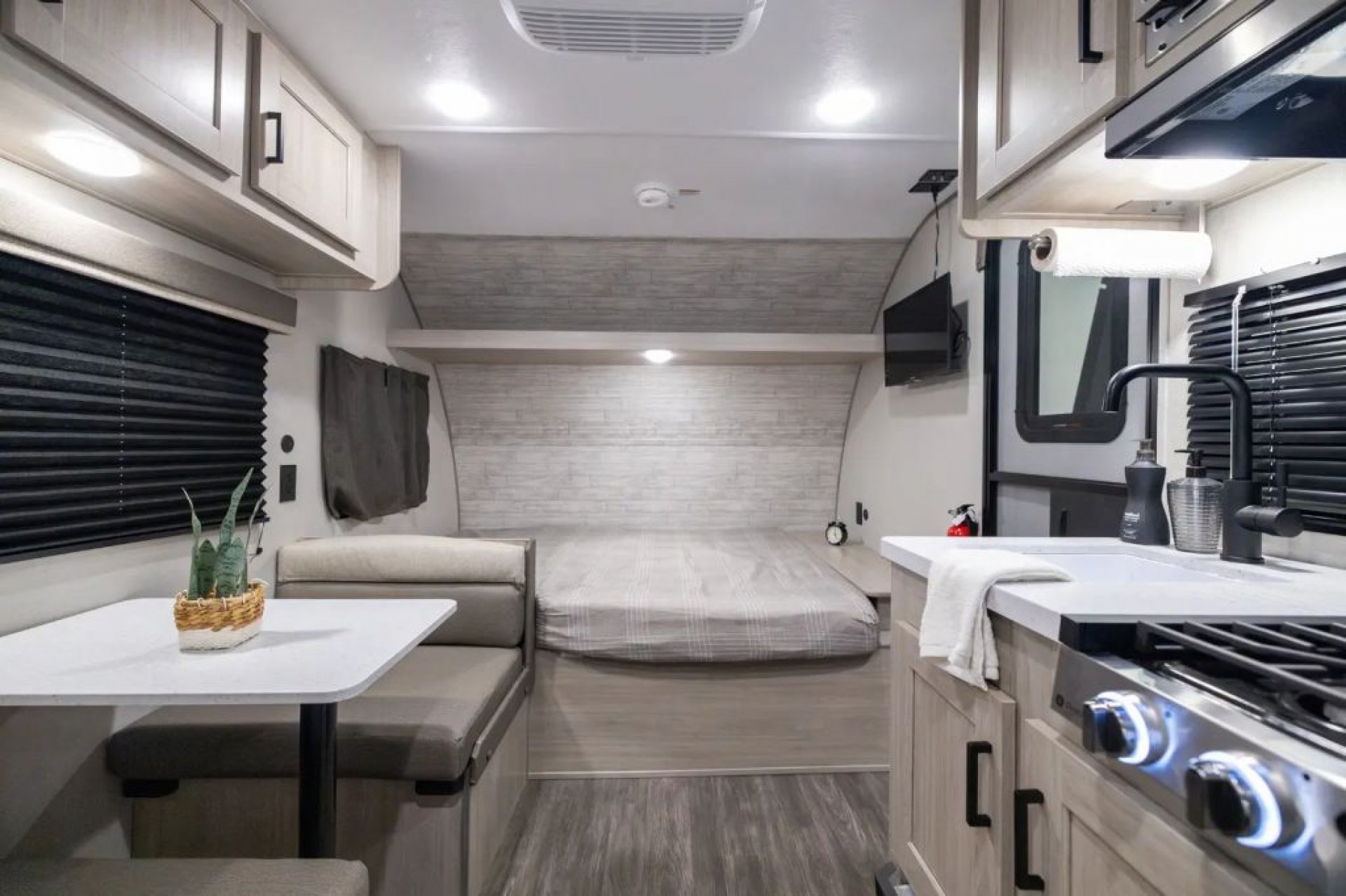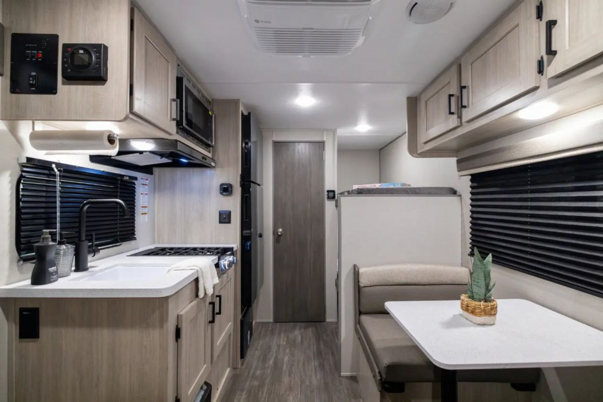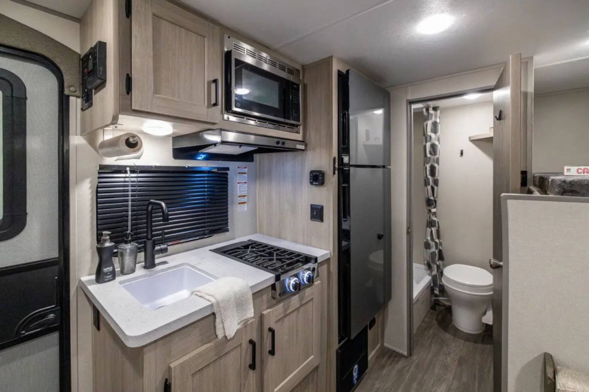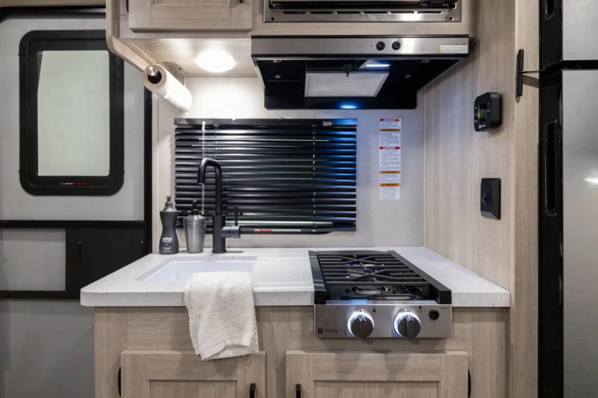 - In the middle, along the curbside, is a compact kitchen galley equipped with a 2-burner cooktop, convection microwave, 10.7 cu ft 12V refrigerator, single-bowl sink, and overhead cabinets.