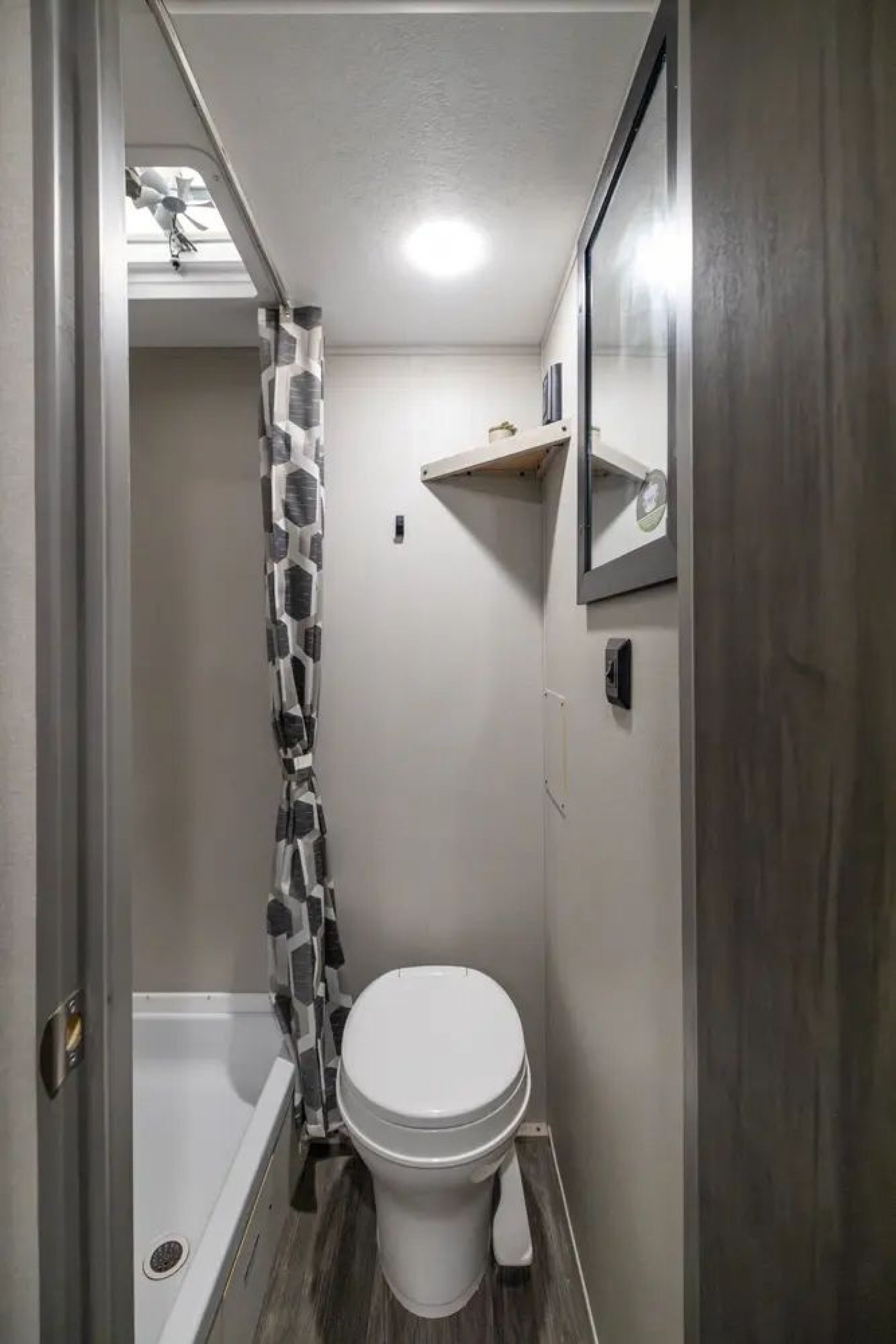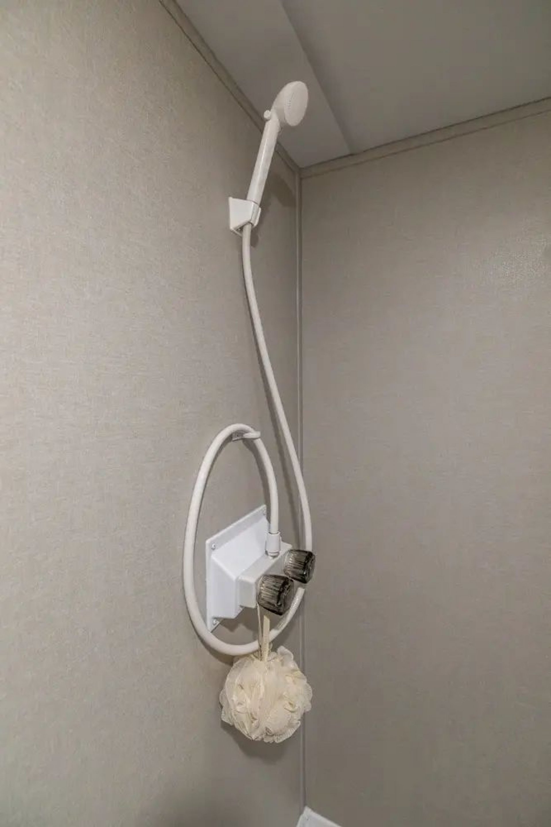 - Opposite the kitchen on the roadside is a full wet bath containing a shower, toilet, and sink in one enclosed space.