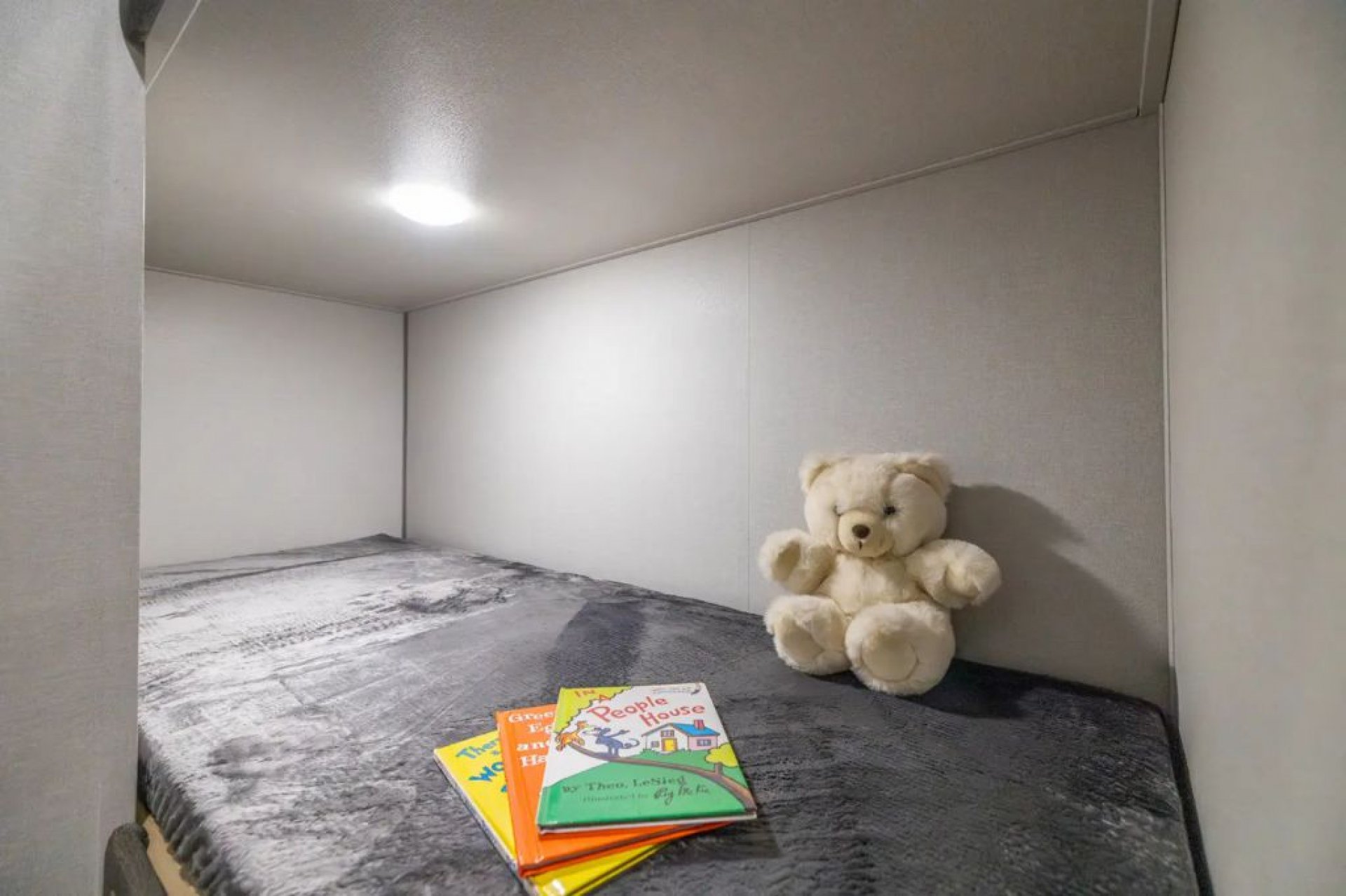 - At the rear are twin stacked bunk beds, each measuring 28" x 70".