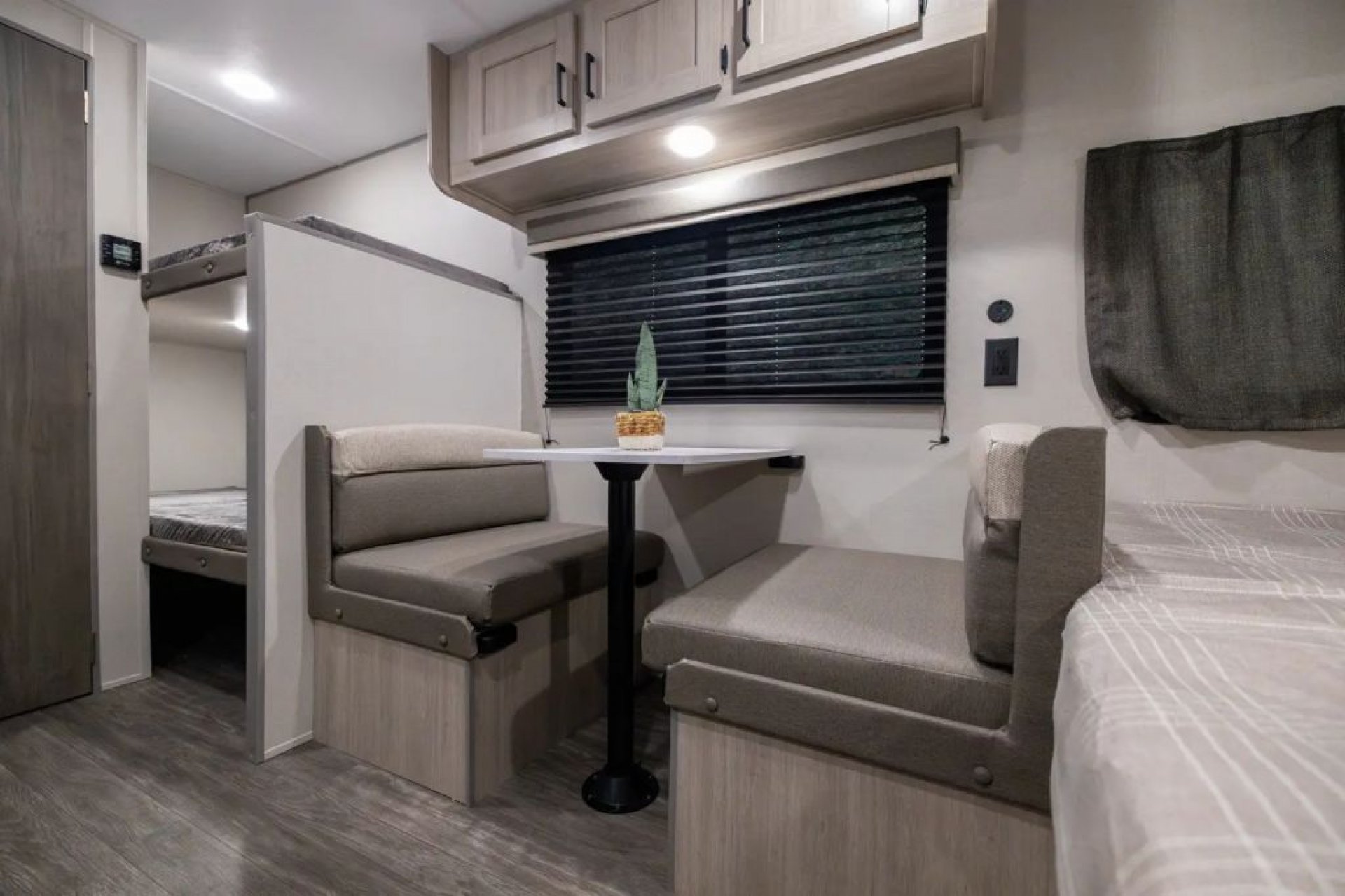 - A 60" jiffy sofa sits in the central living area and can convert to an additional bed when needed.