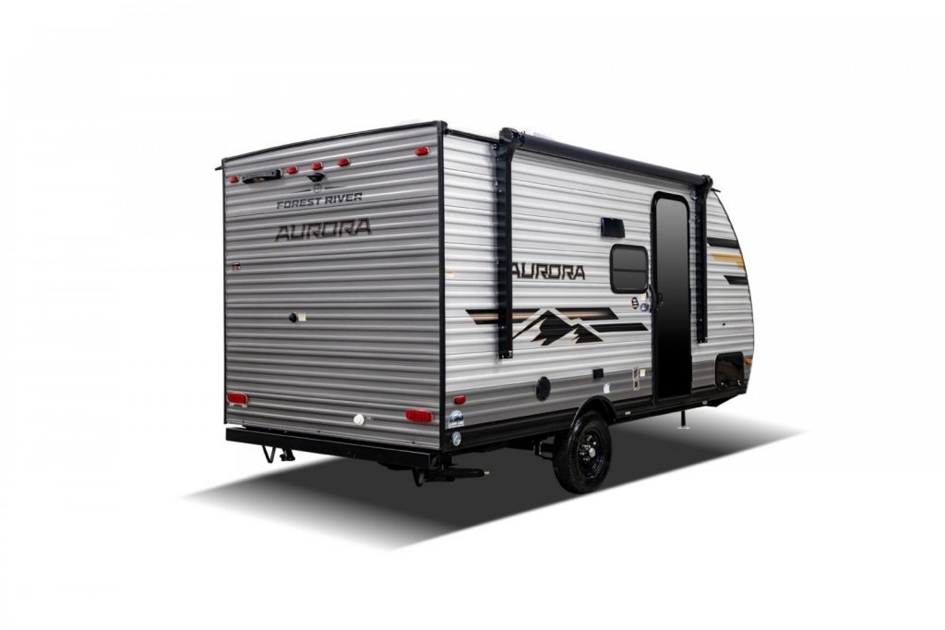 The Forest River Aurora Light 16BHX is a compact, lightweight single-axle travel trailer designed for easy towing and small-family camping. It measures approximately 19 ft 6 in overall length with an interior height of 6 ft 6 in, an unloaded vehicle weight of around 3,109 lbs, hitch weight of 454 lbs, and a gross vehicle weight rating of 4,454 lbs, allowing it to be towed by many mid-size SUVs or half-ton trucks.