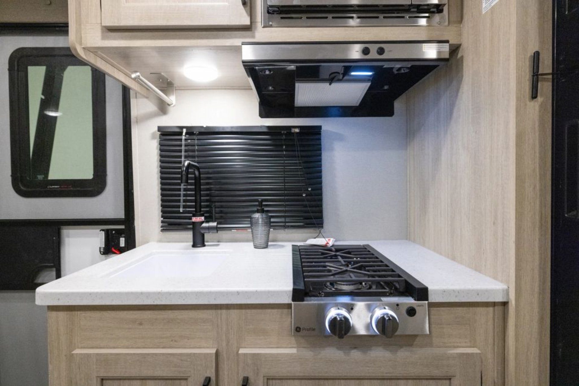 - Kitchen: Compact yet equipped with a 3-burner cooktop, microwave, double-door refrigerator (GE stainless 10.7 cu. ft. 12V model), sink, and overhead cabinets. Matte black faucets add a sleek touch.