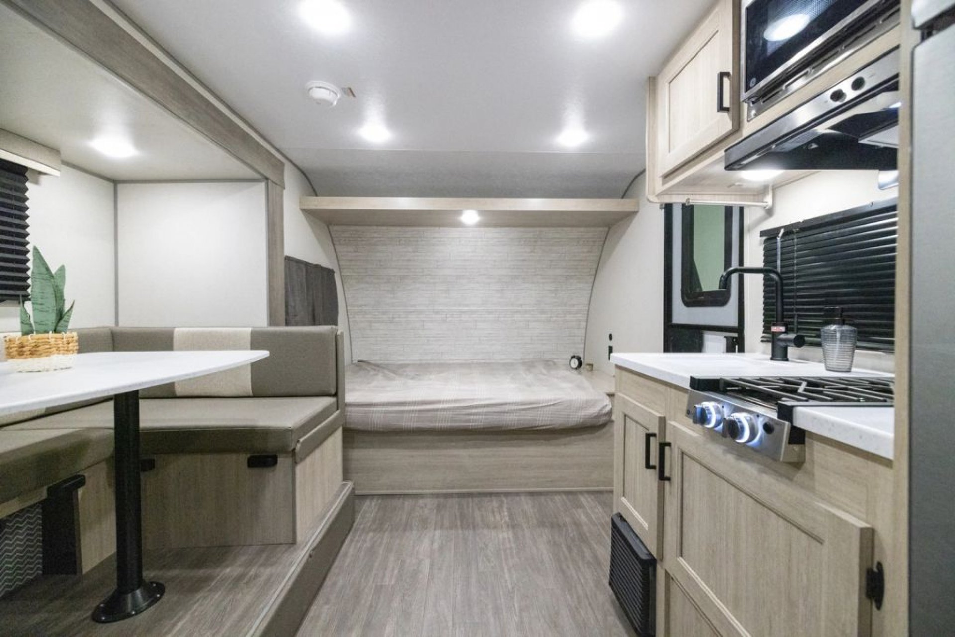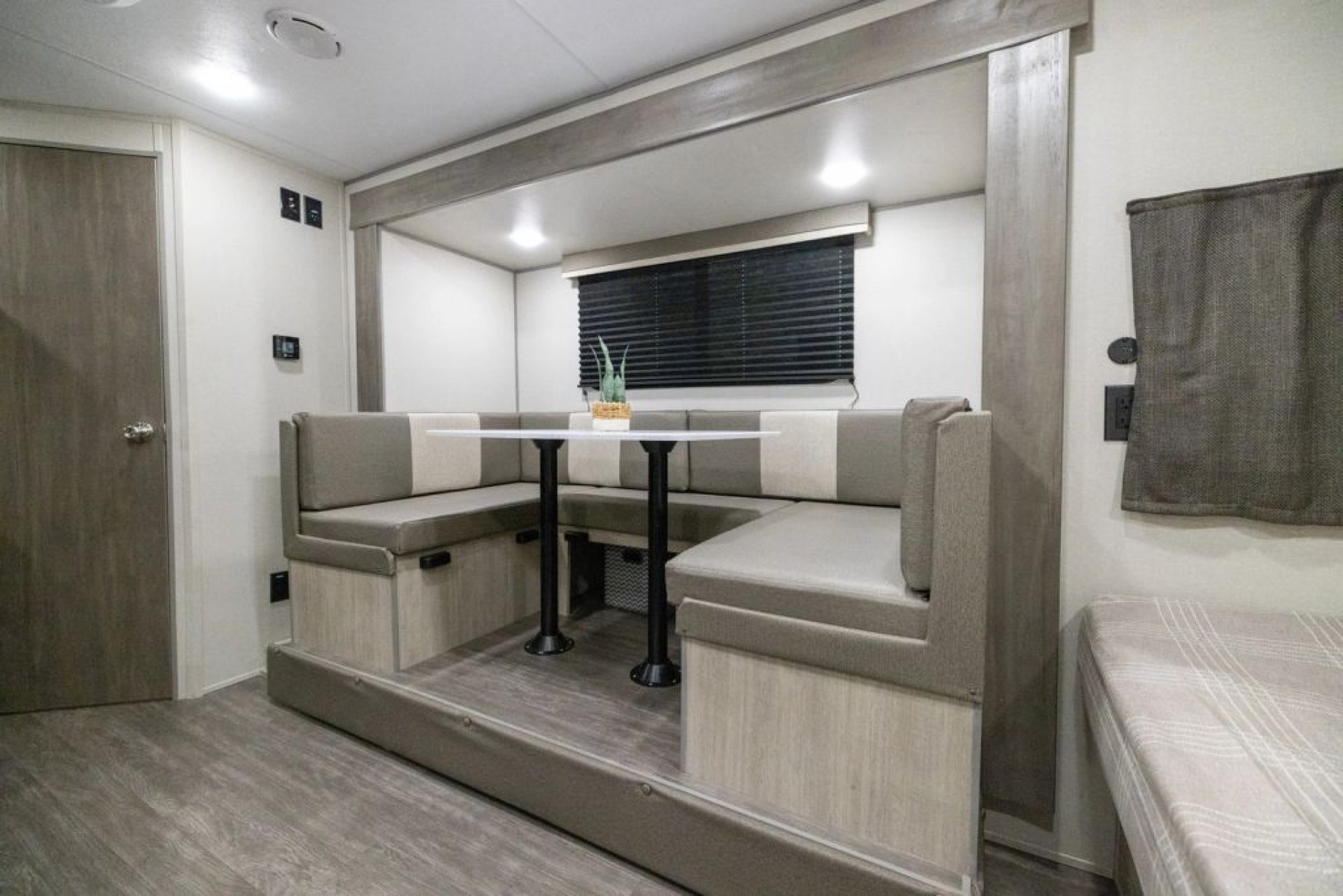 - Living/Kitchen Area: A slide-out U-shaped dinette expands the interior space, serving as a dining spot for four and converting to an additional sleeping surface for two.