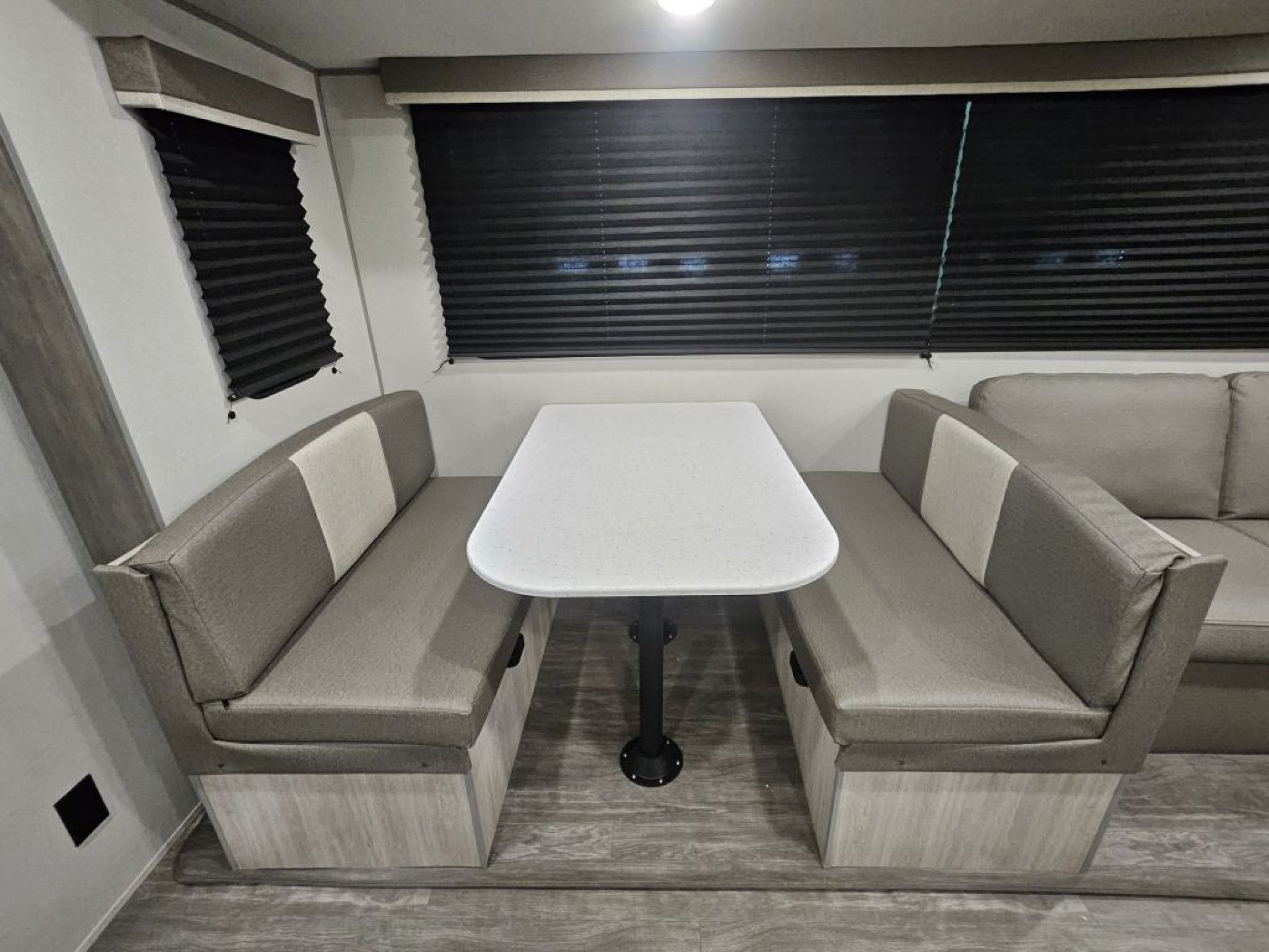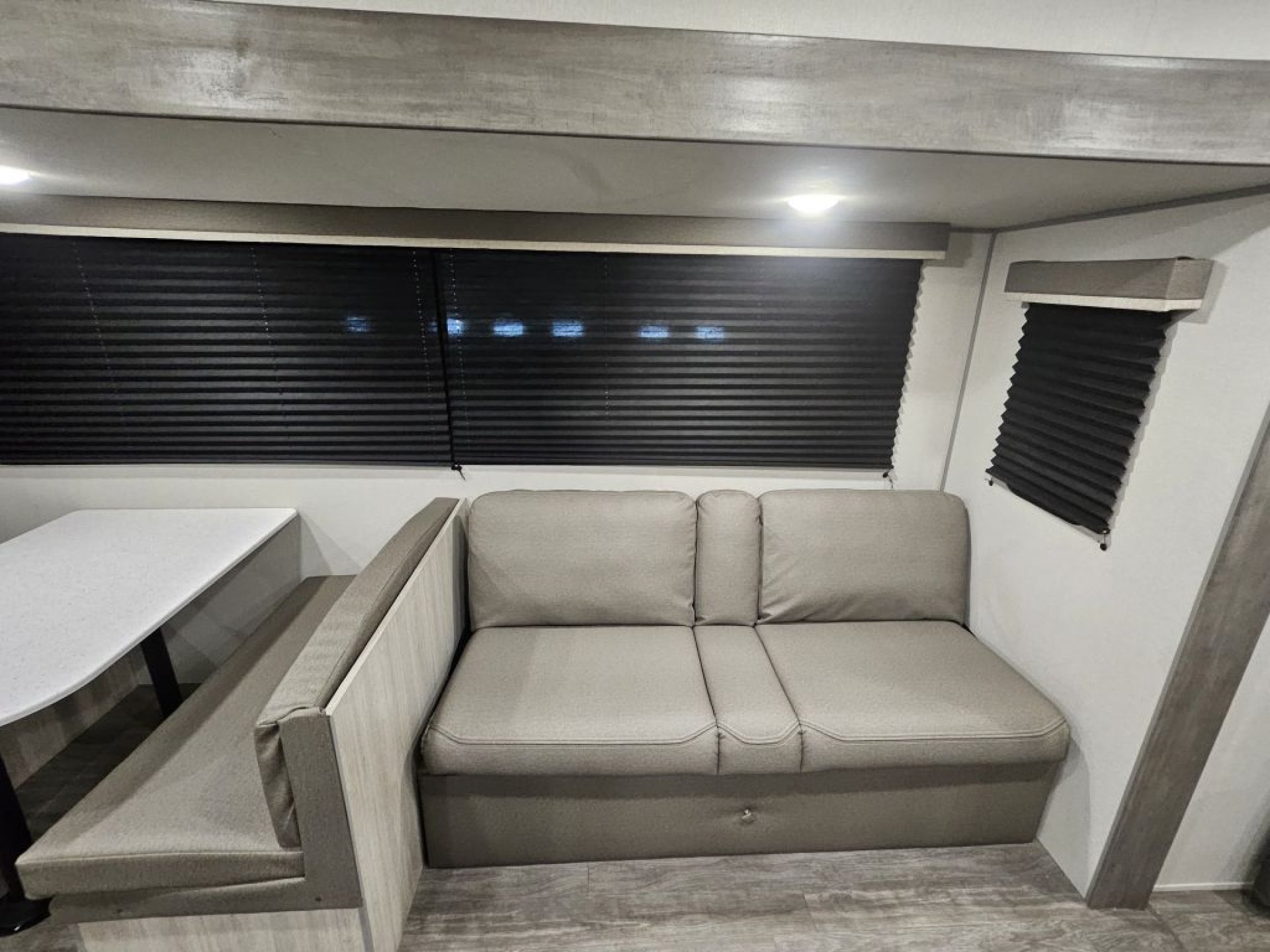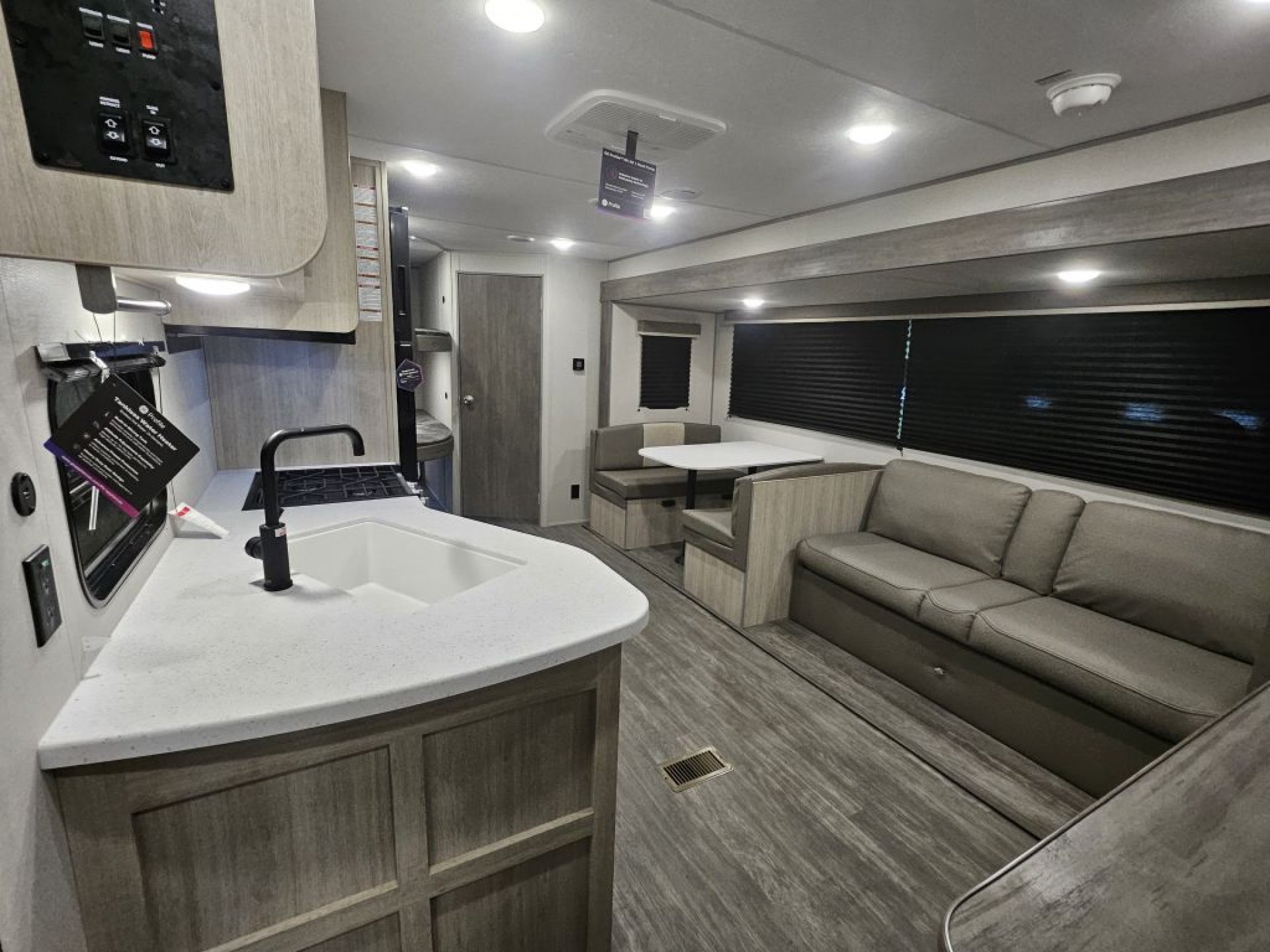 The Super Slide: This massive slide-out houses both the sofa and the large booth dinette, completely opening up the center of the trailer for a "living room" feel.