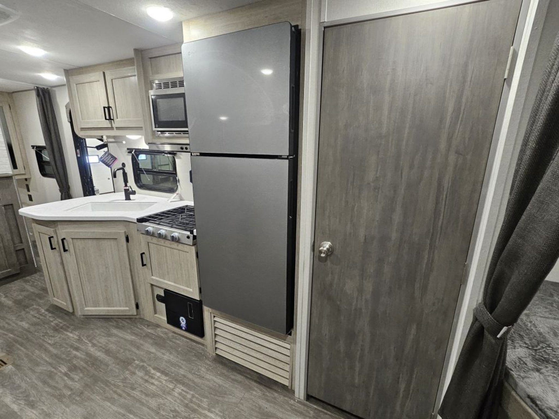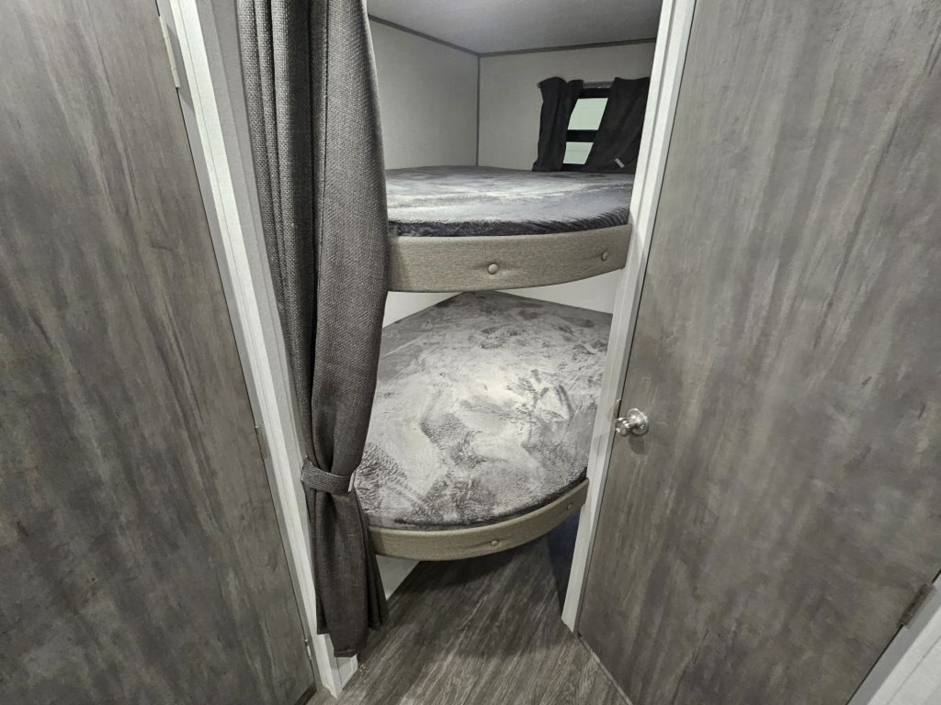 Solid-Door Master Suite: Unlike many campers that use a curtain, the 26BHS features a solid door leading to a front walk-around queen bed for true parental privacy.