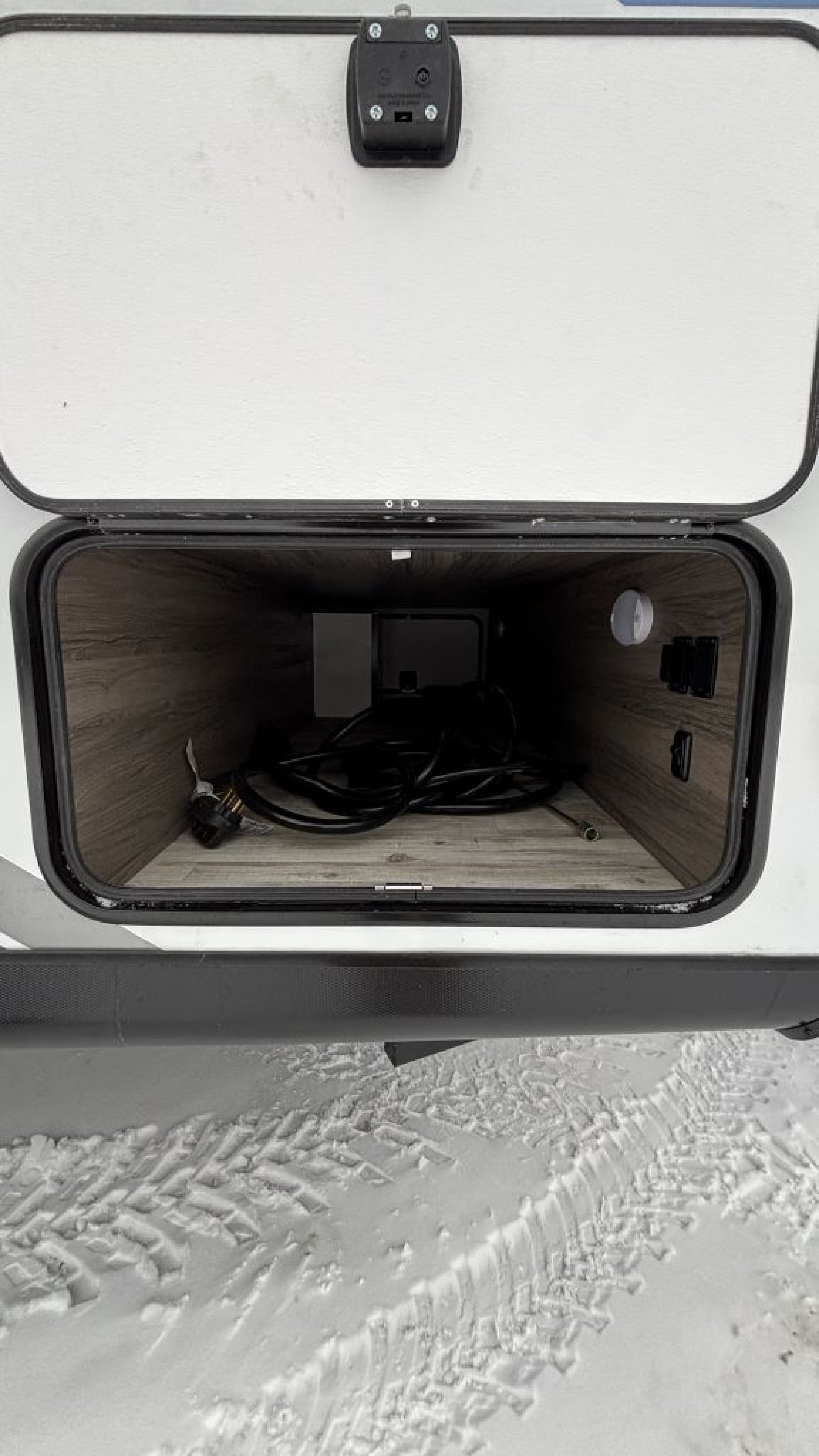 • Convenience: Exterior shower, marine-grade LED speakers, flush-mount baggage doors, front diamond plate rock guard, power stabilizer jacks, and exterior docking station.