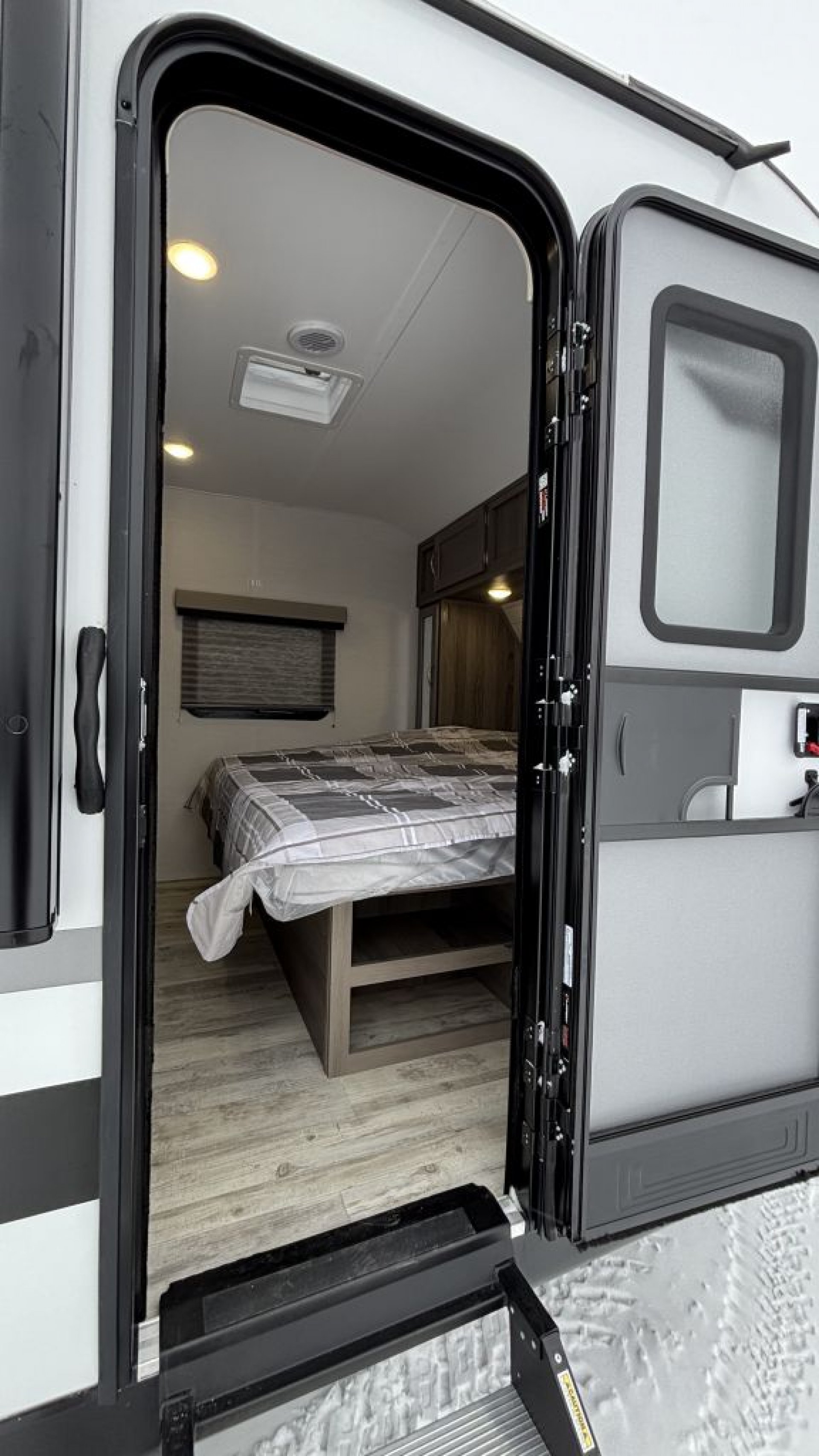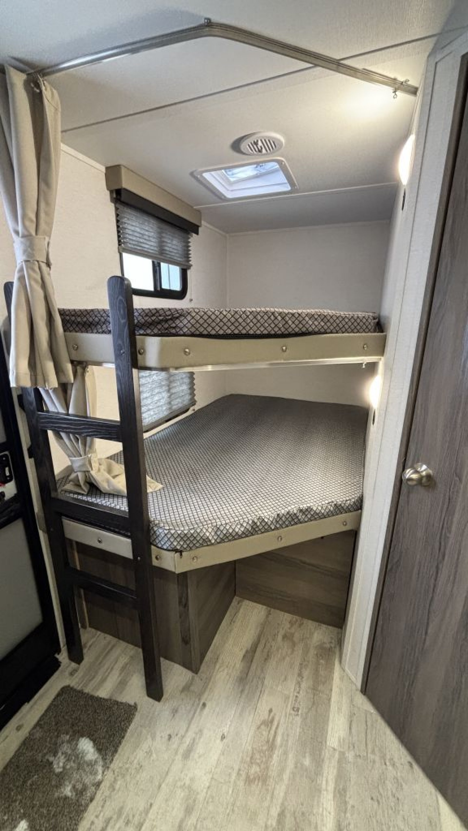 • Bunkhouse Area: Rear double-over-double bunks (46" x 73" each) with poly mattresses, storage below, and a wardrobe; rear entry door for direct access.