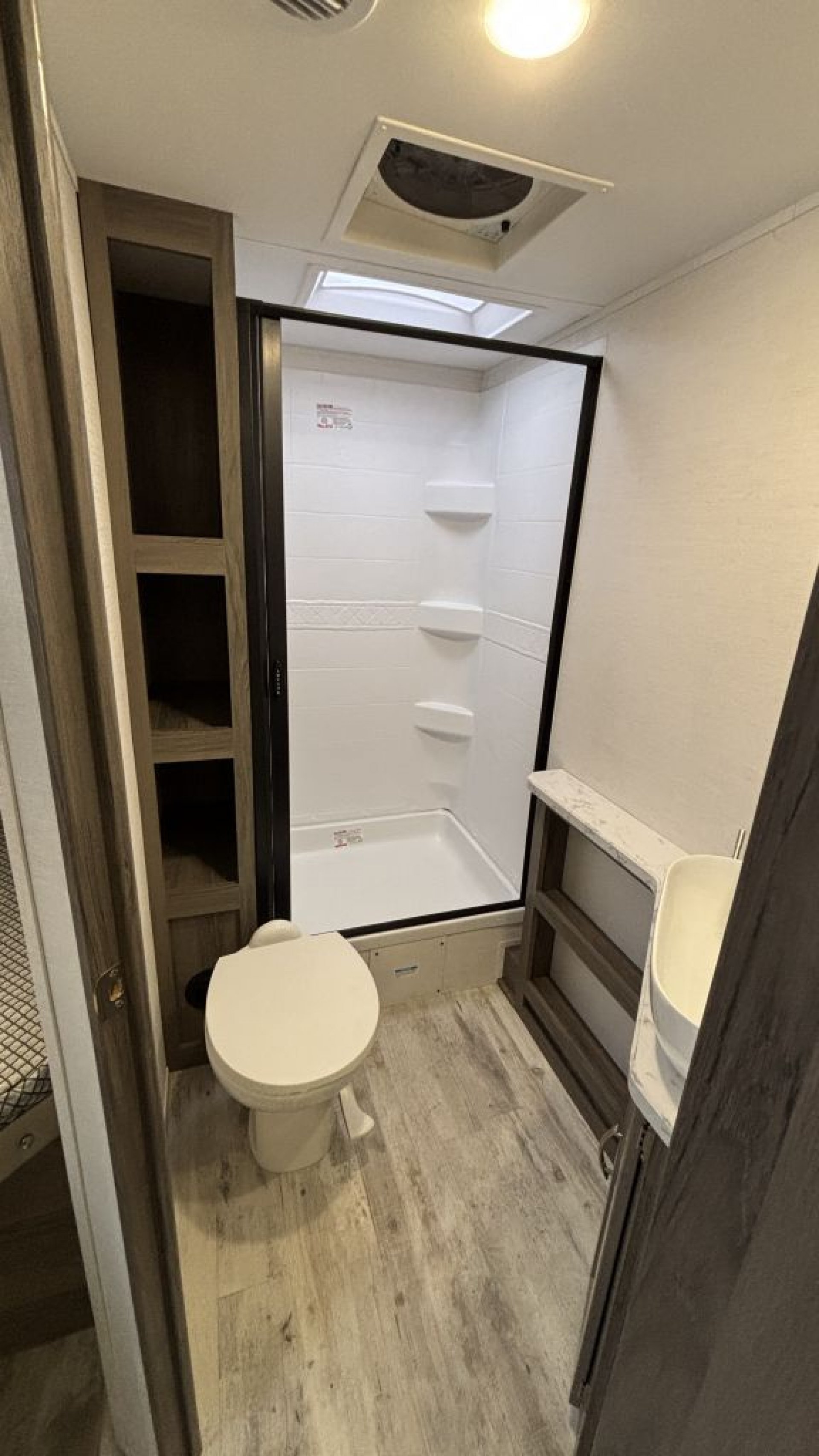 • Bathroom: Central full bath with 30" x 36" walk-in shower, foot-flush toilet, sink, medicine cabinet, and skylight.