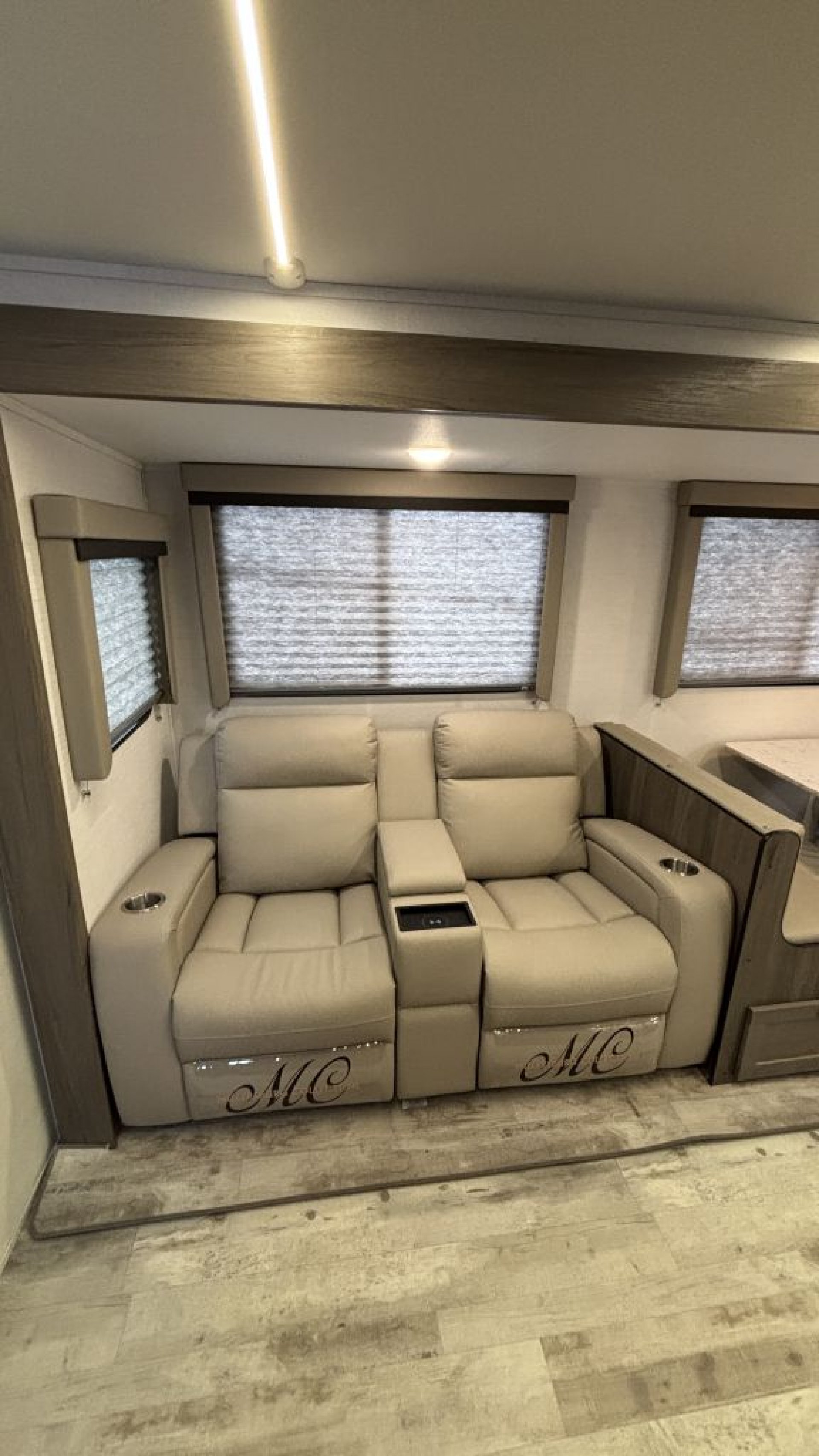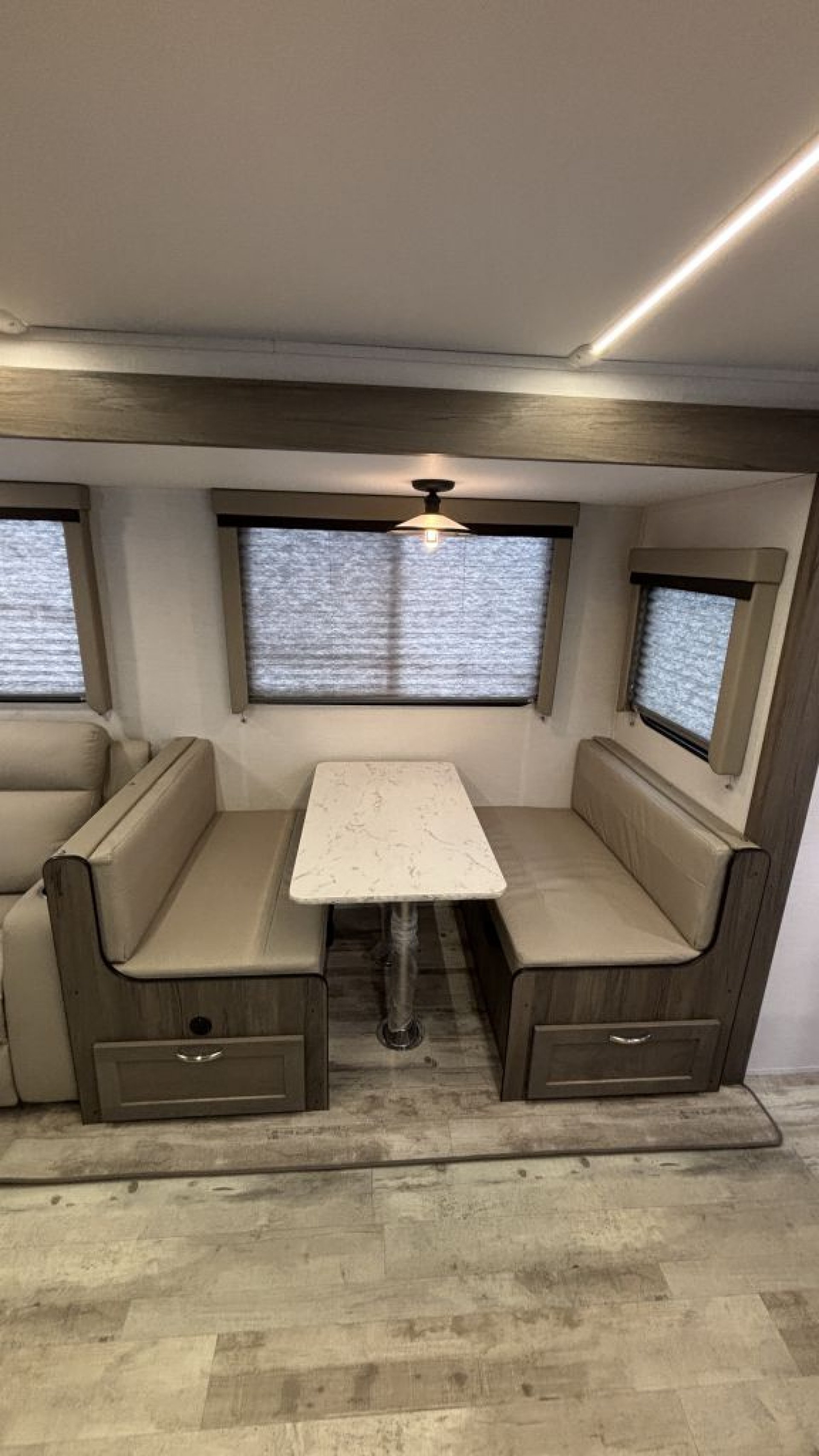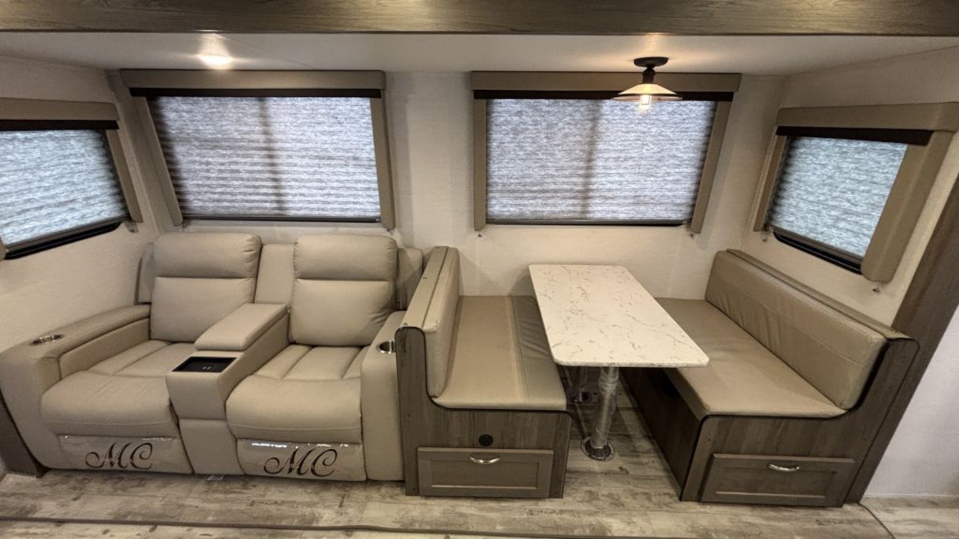 • Living Space: Booth dinette, tri-fold sofa, LED lighting, designer window treatments, and optional theater seating; dog dish drawer for pet-friendly travel.