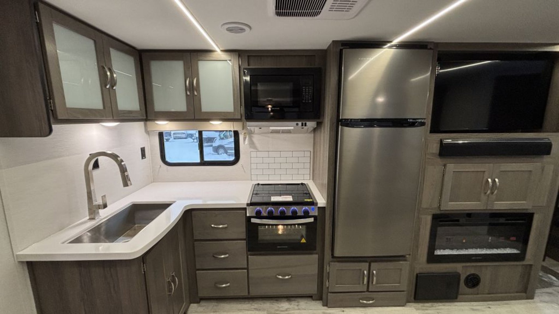 • Kitchen: L-shaped with solid-surface countertops, stainless steel 3-burner cooktop with oven and glass cover, microwave, 6 cu. ft. 12V refrigerator, deep sink, and pantry.