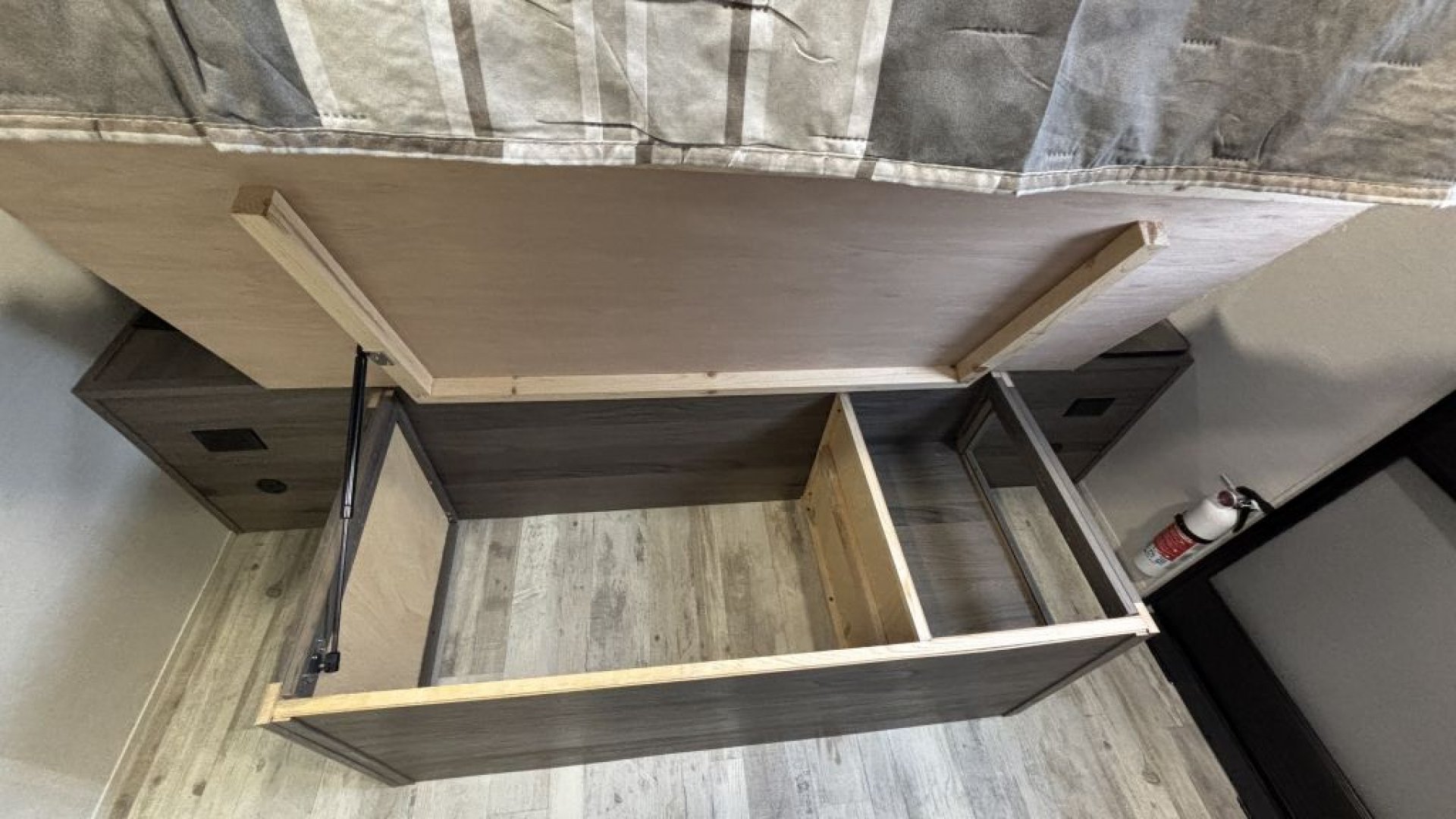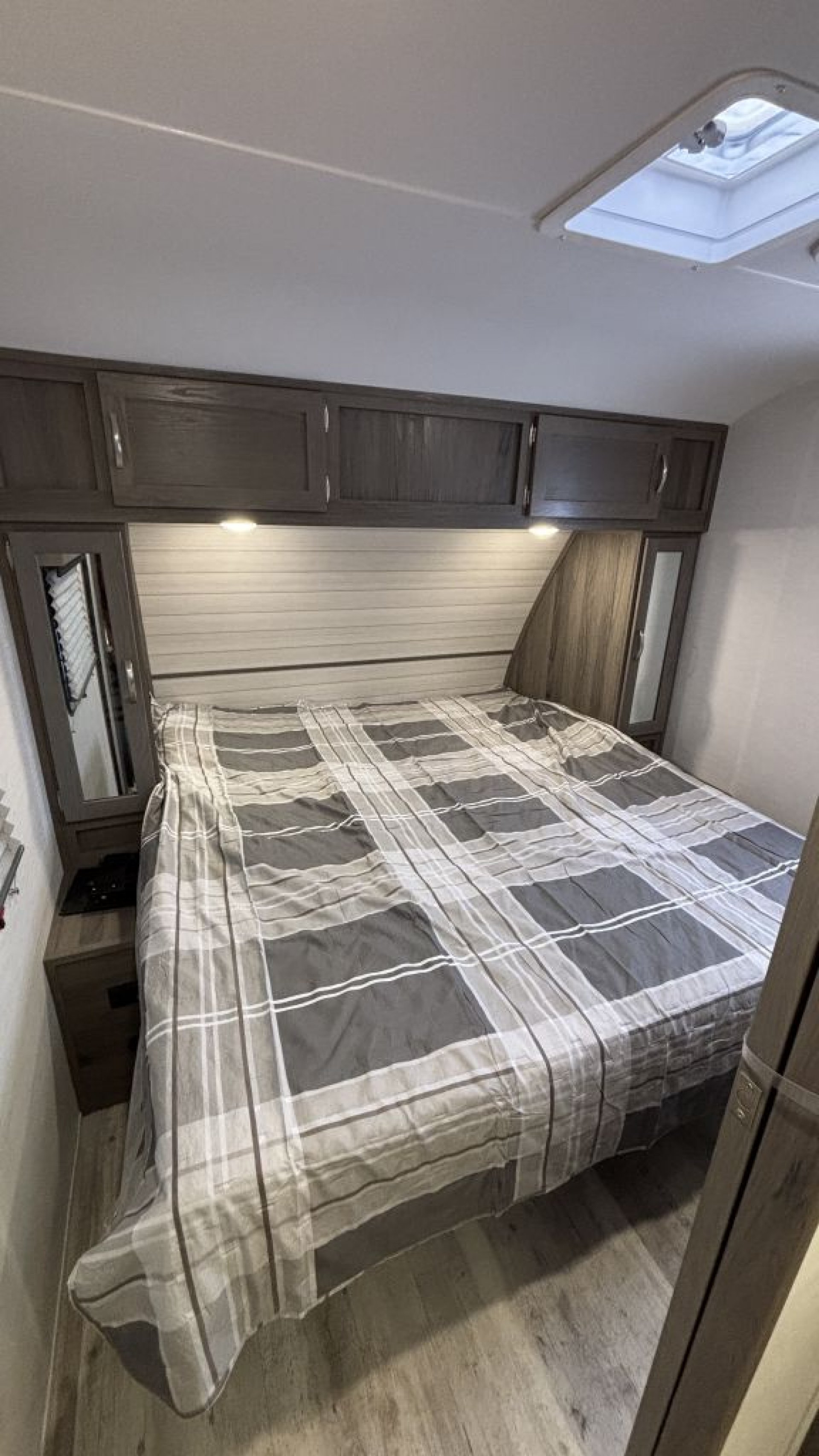 • Front Bedroom: Walk-around queen bed (60" x 80") with dual wardrobes, overhead cabinets, and under-bed shoe storage for a cozy retreat.