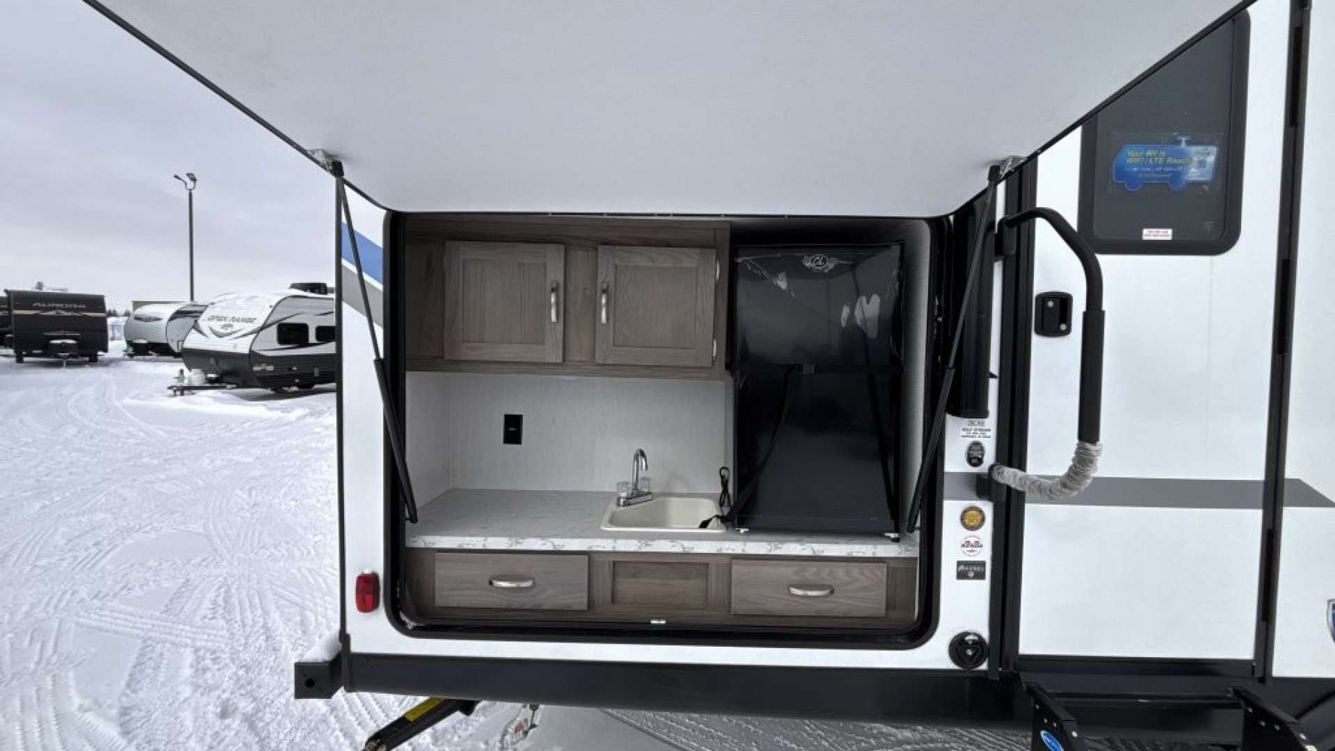 - Outdoor Kitchen: Rear camp kitchen with sink, mini-fridge, and storage for al fresco dining.