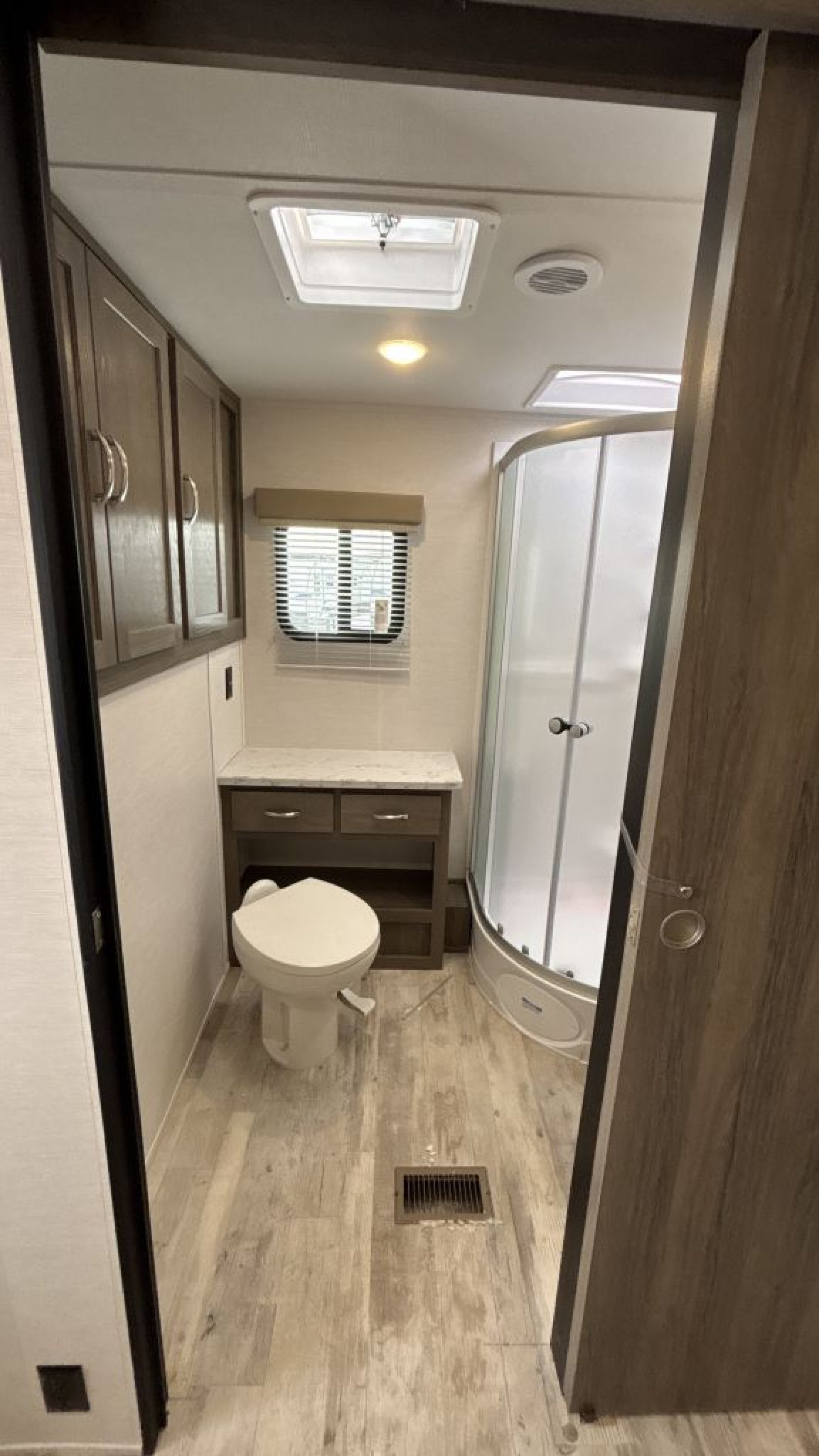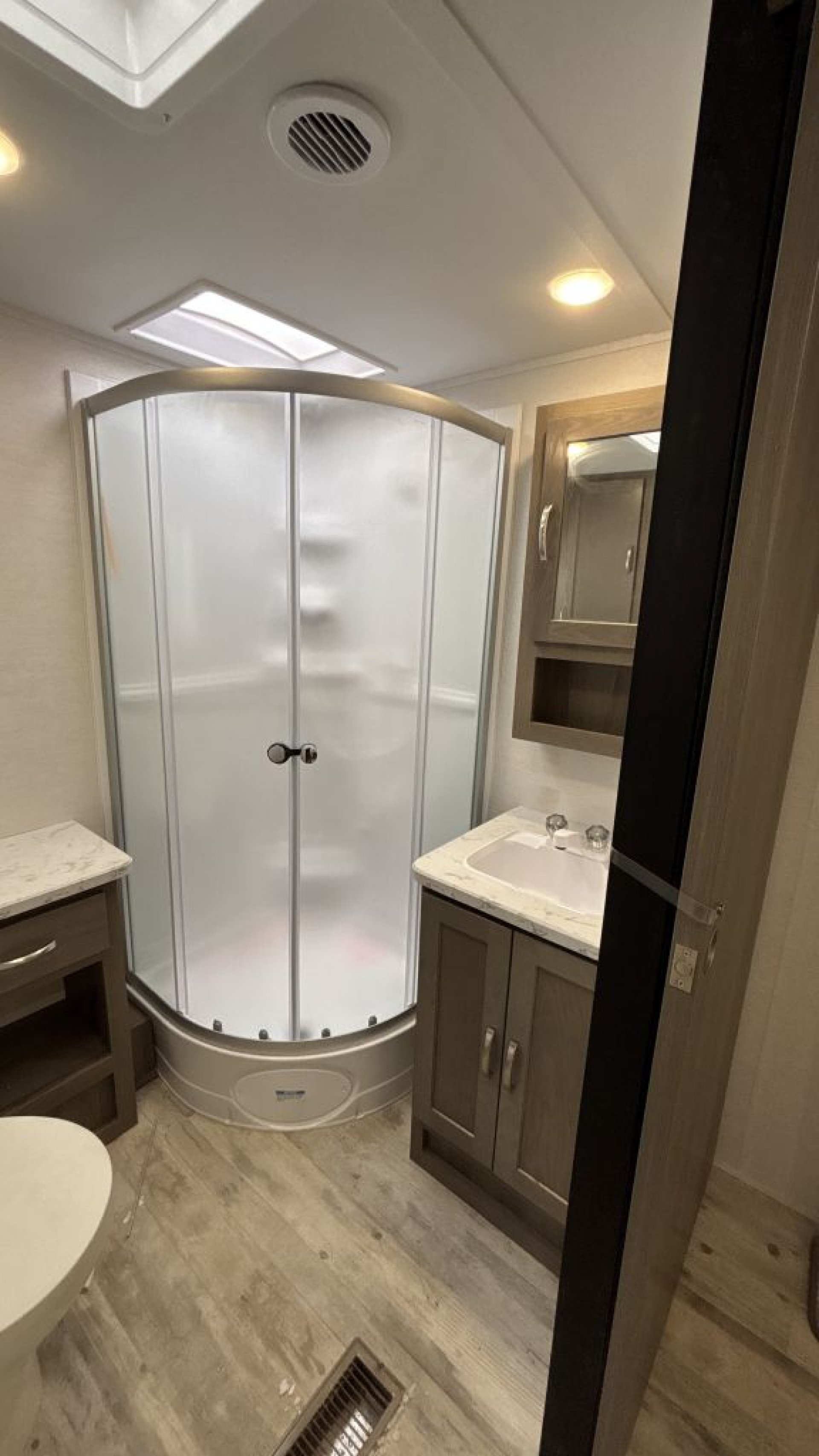- Bathroom: Adjacent full bath with a neo-angle shower, toilet, sink, linen cabinet, and skylight for a spa-like feel.