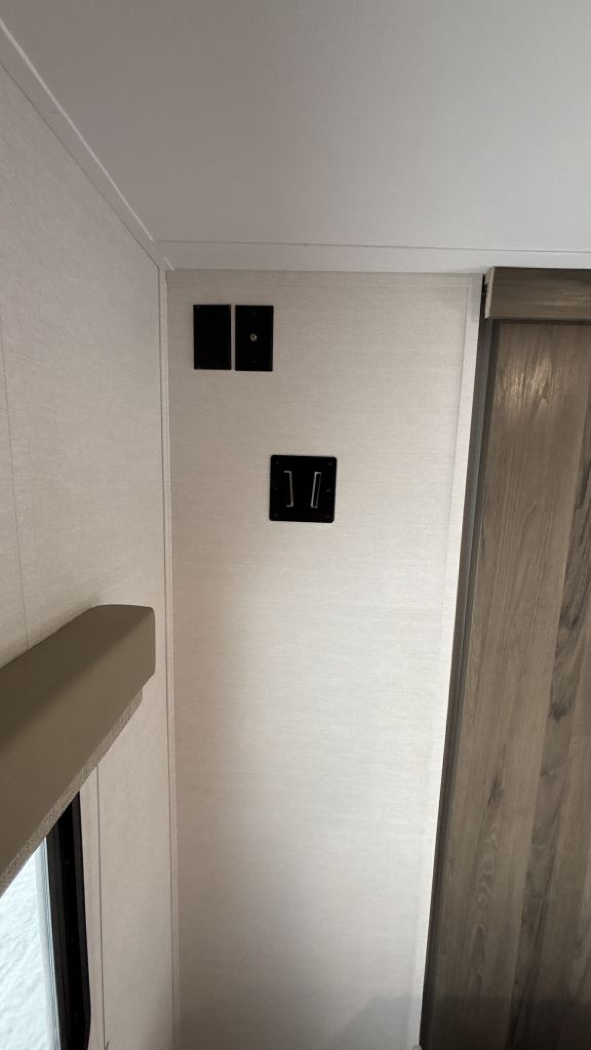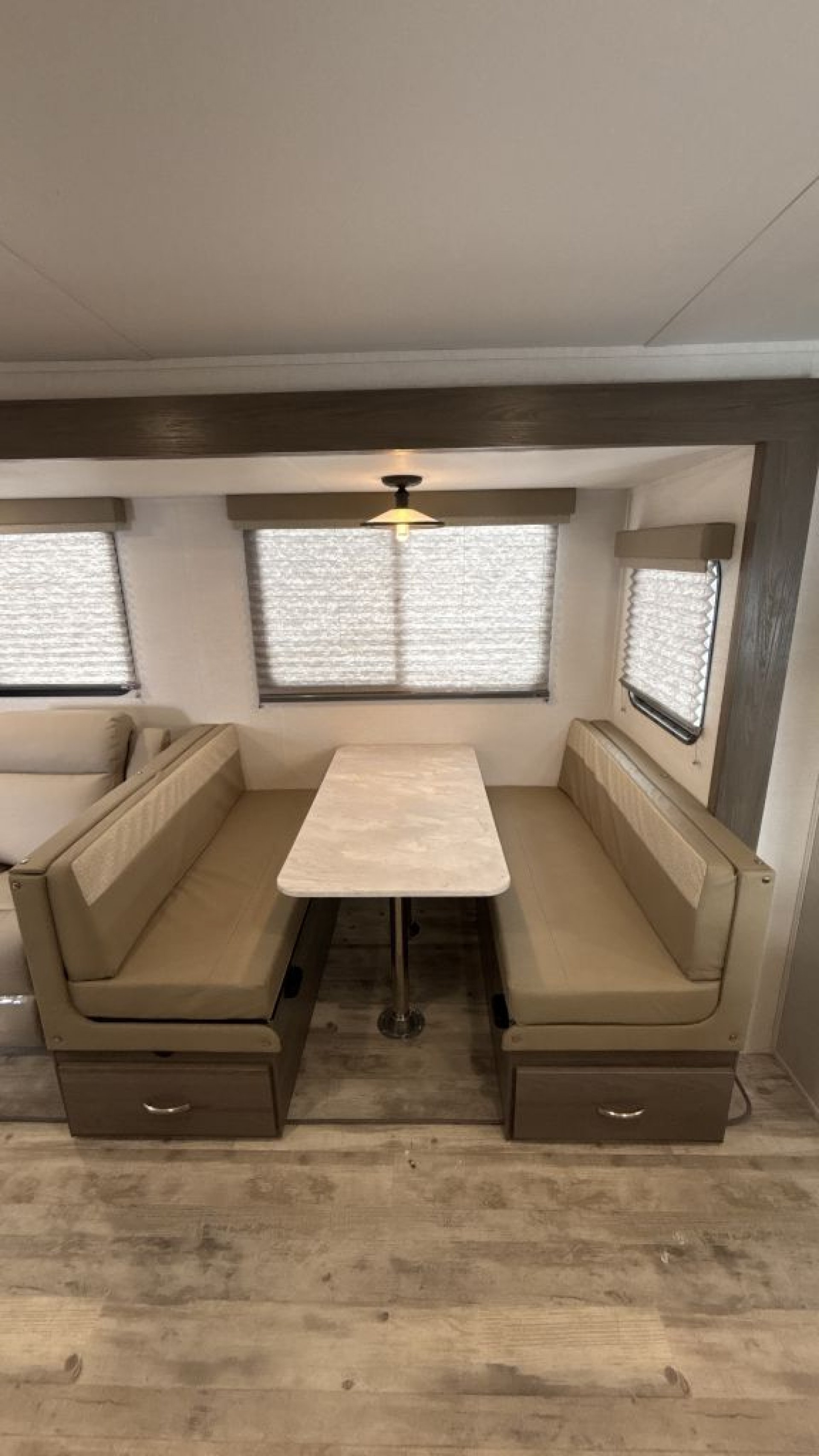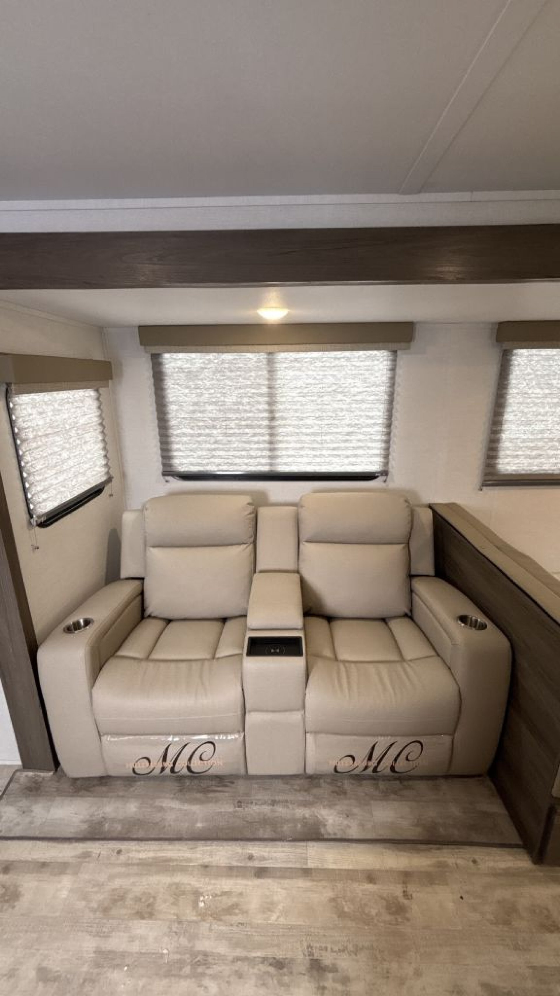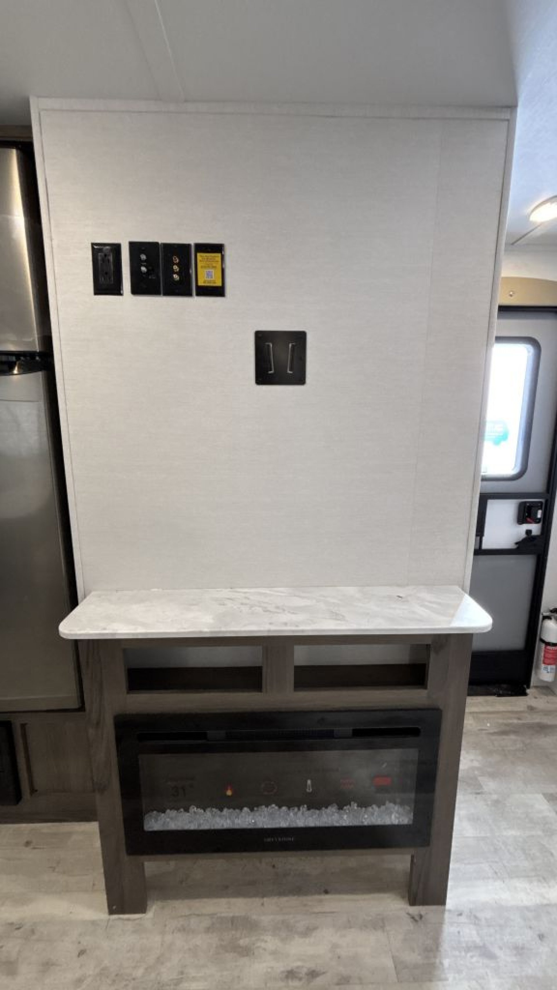 - Living Space: 40" LED TV, electric fireplace, theater seating option, and pleated shades for privacy.