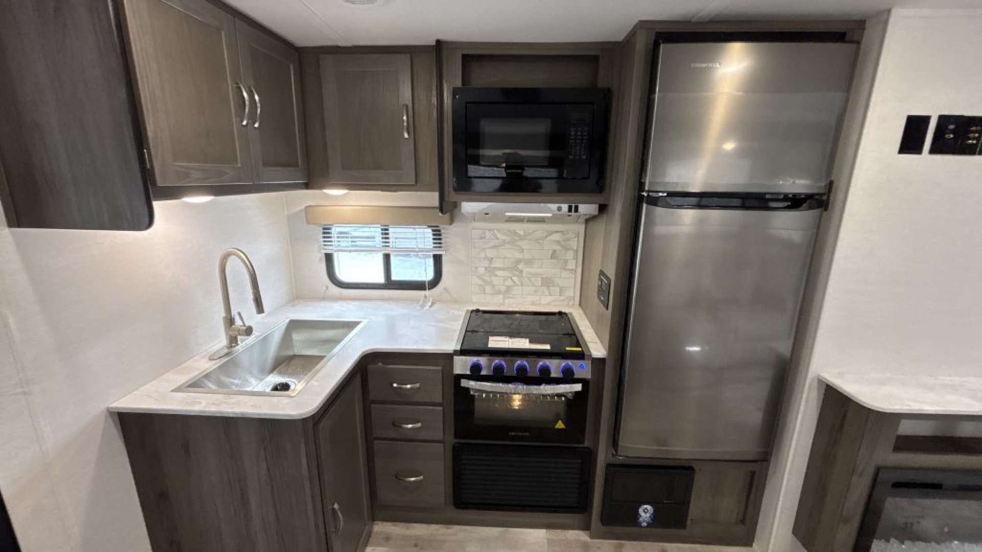 - Kitchen: Adjacent to living area with solid-surface counters, 3-burner cooktop, oven, microwave, 6 cu. ft. 12V refrigerator, and pantry.